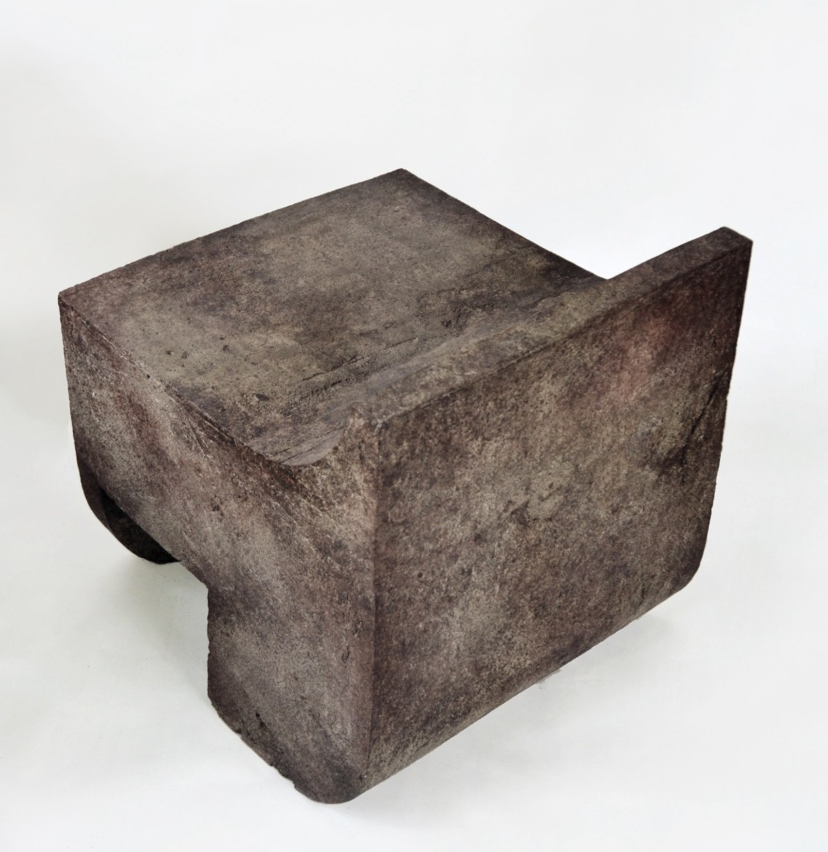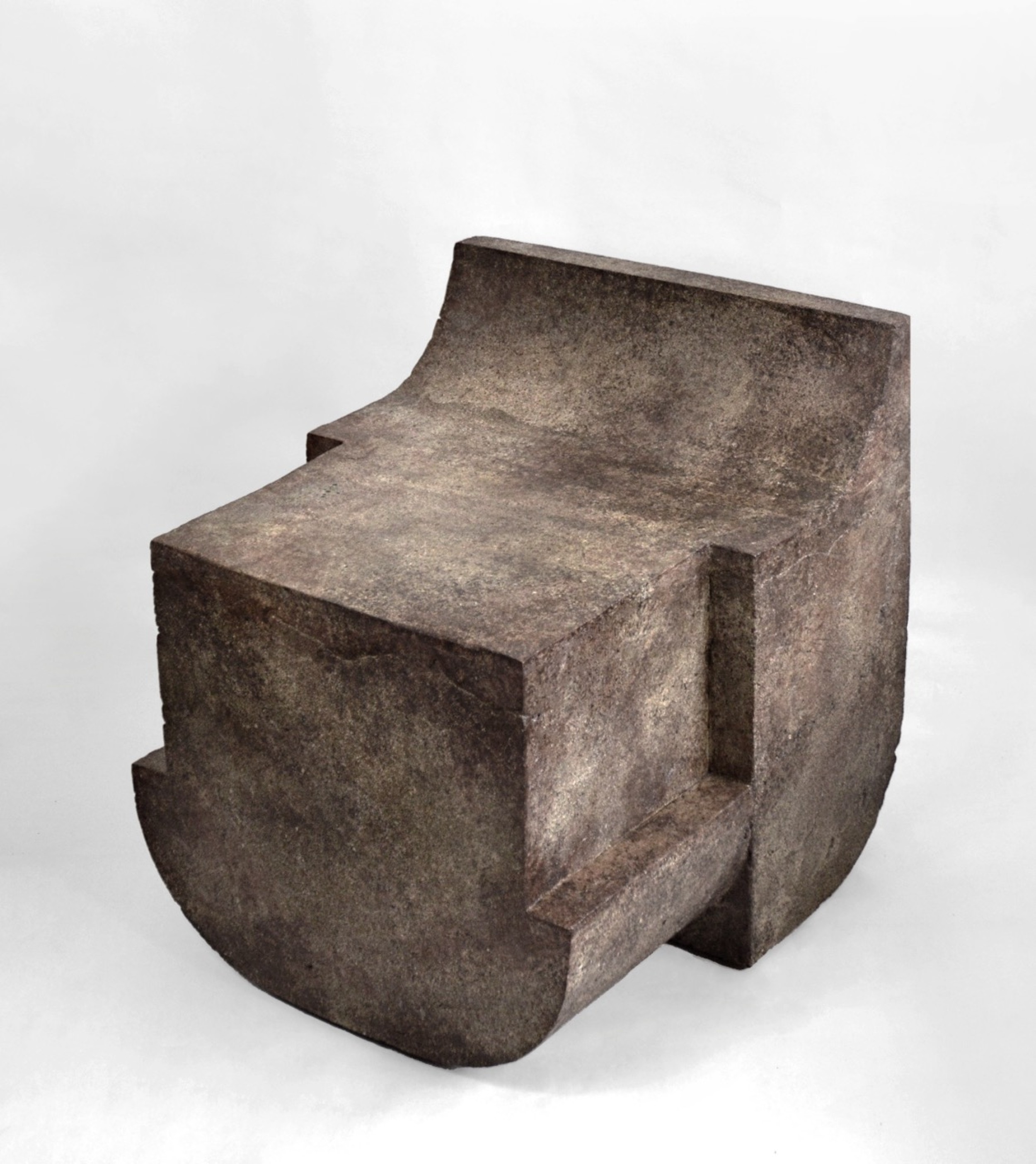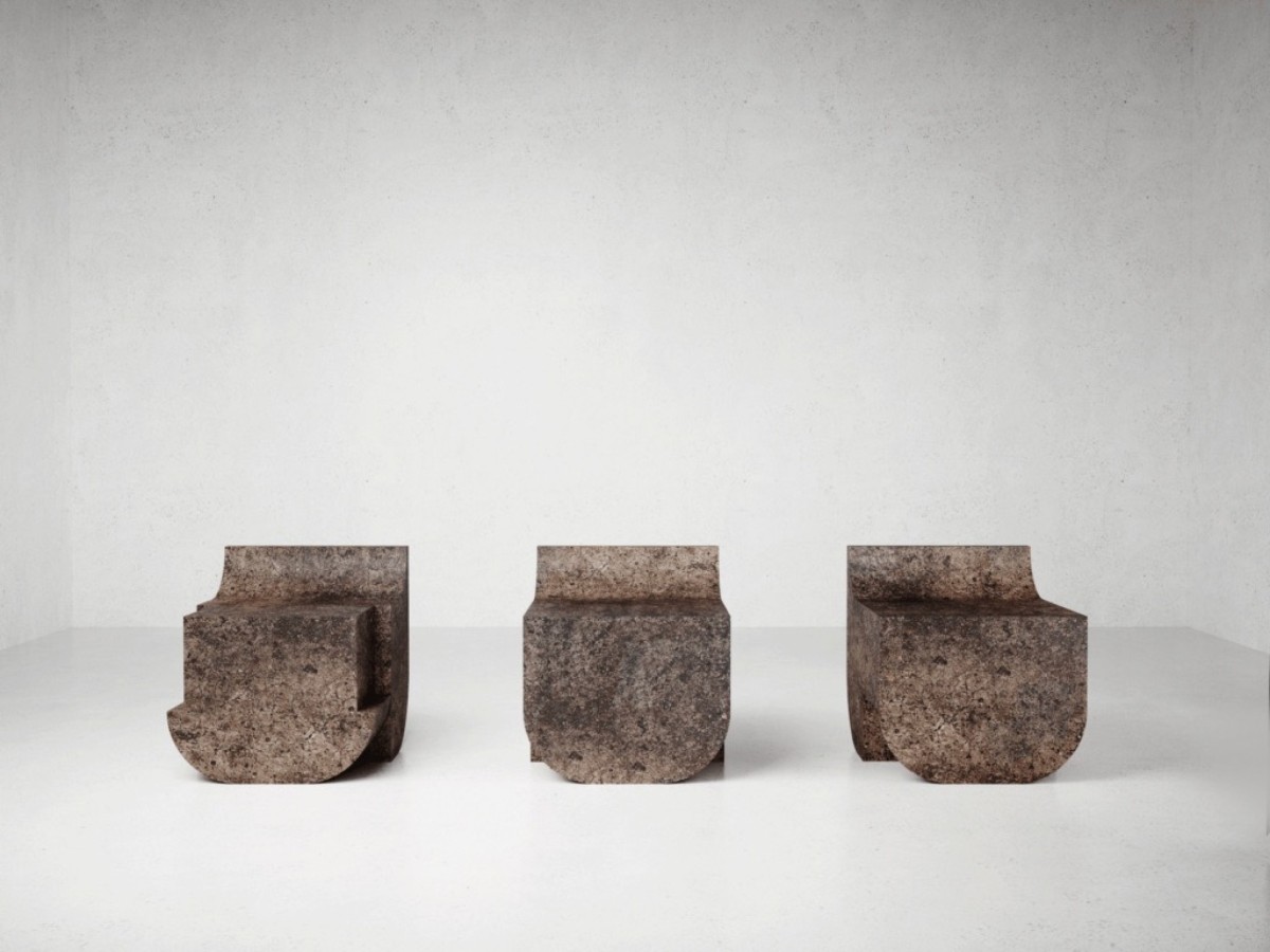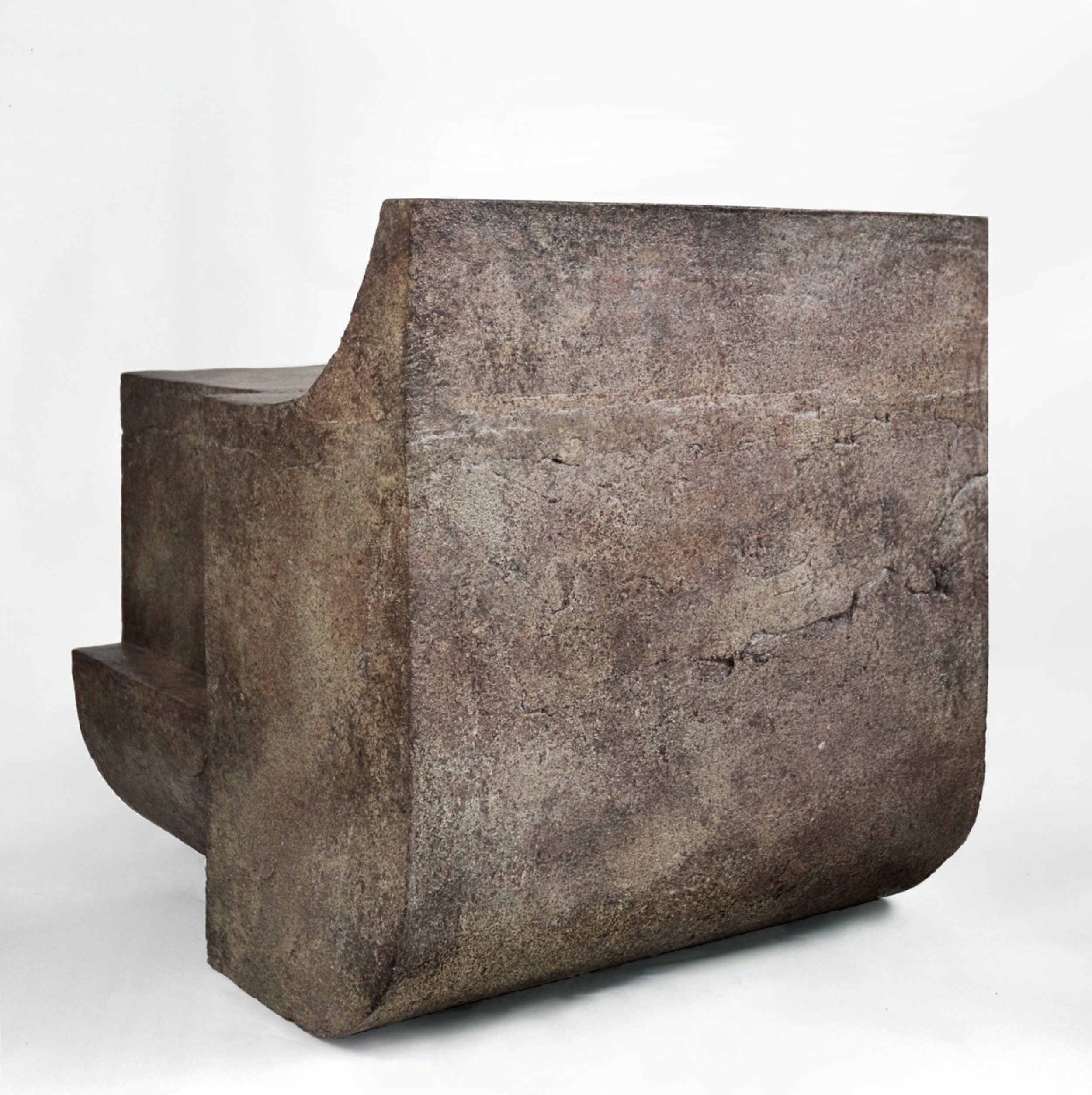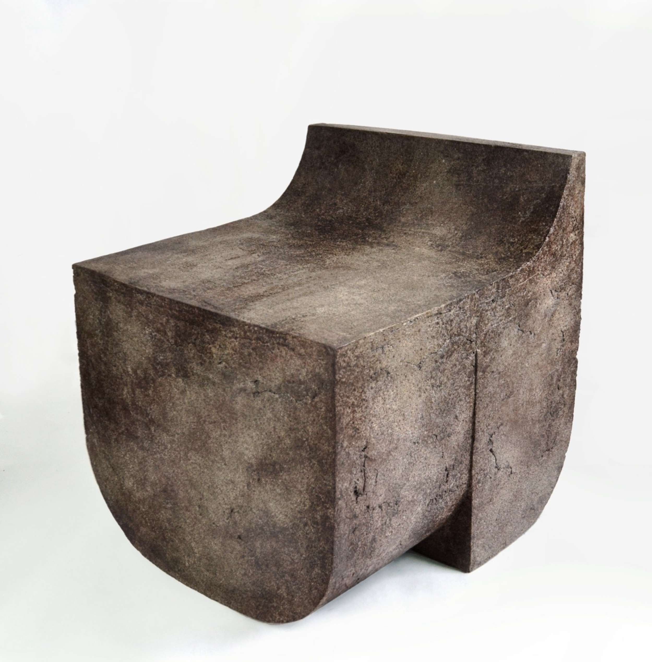 3 Contemporary Mono Block chairs with a monolithic sculptural cement structures with a curved and wedged back rests on a blocky bases