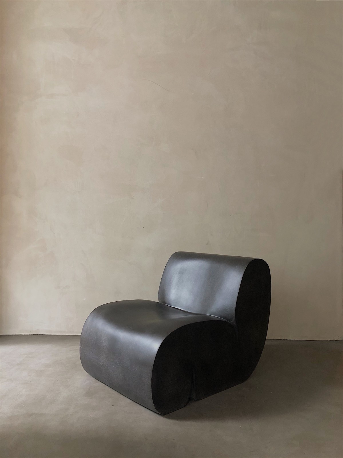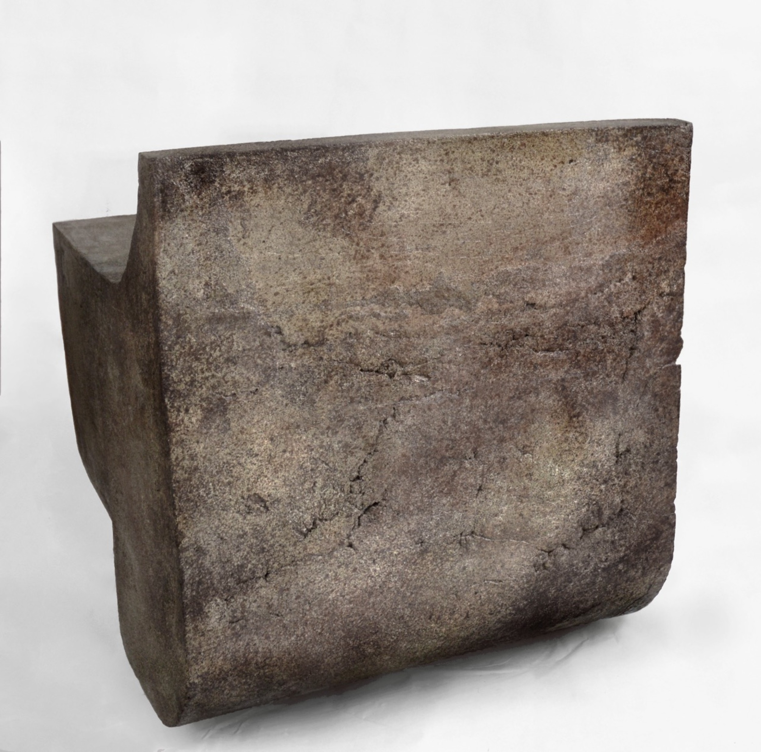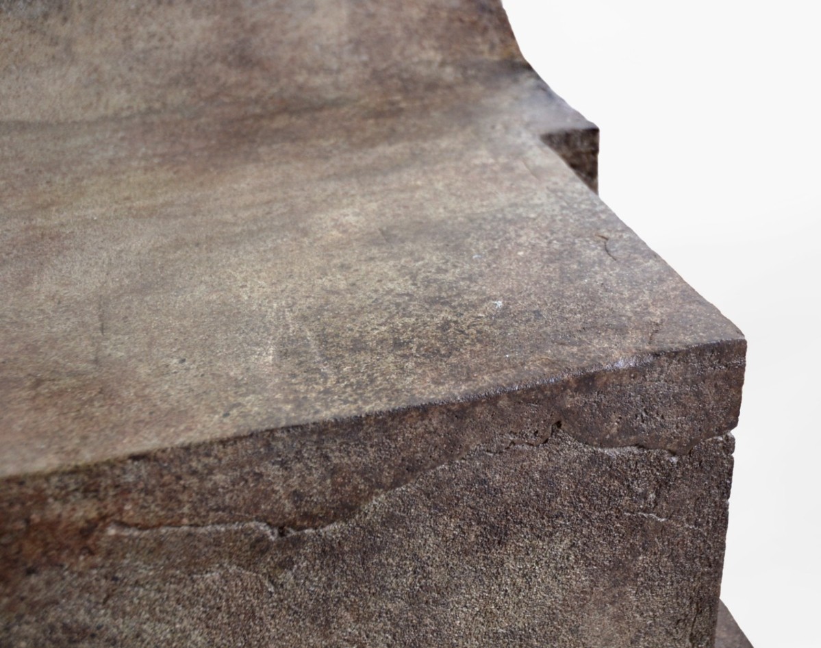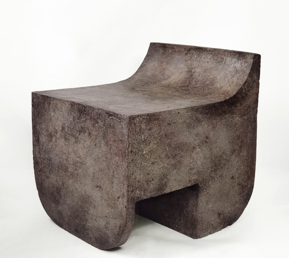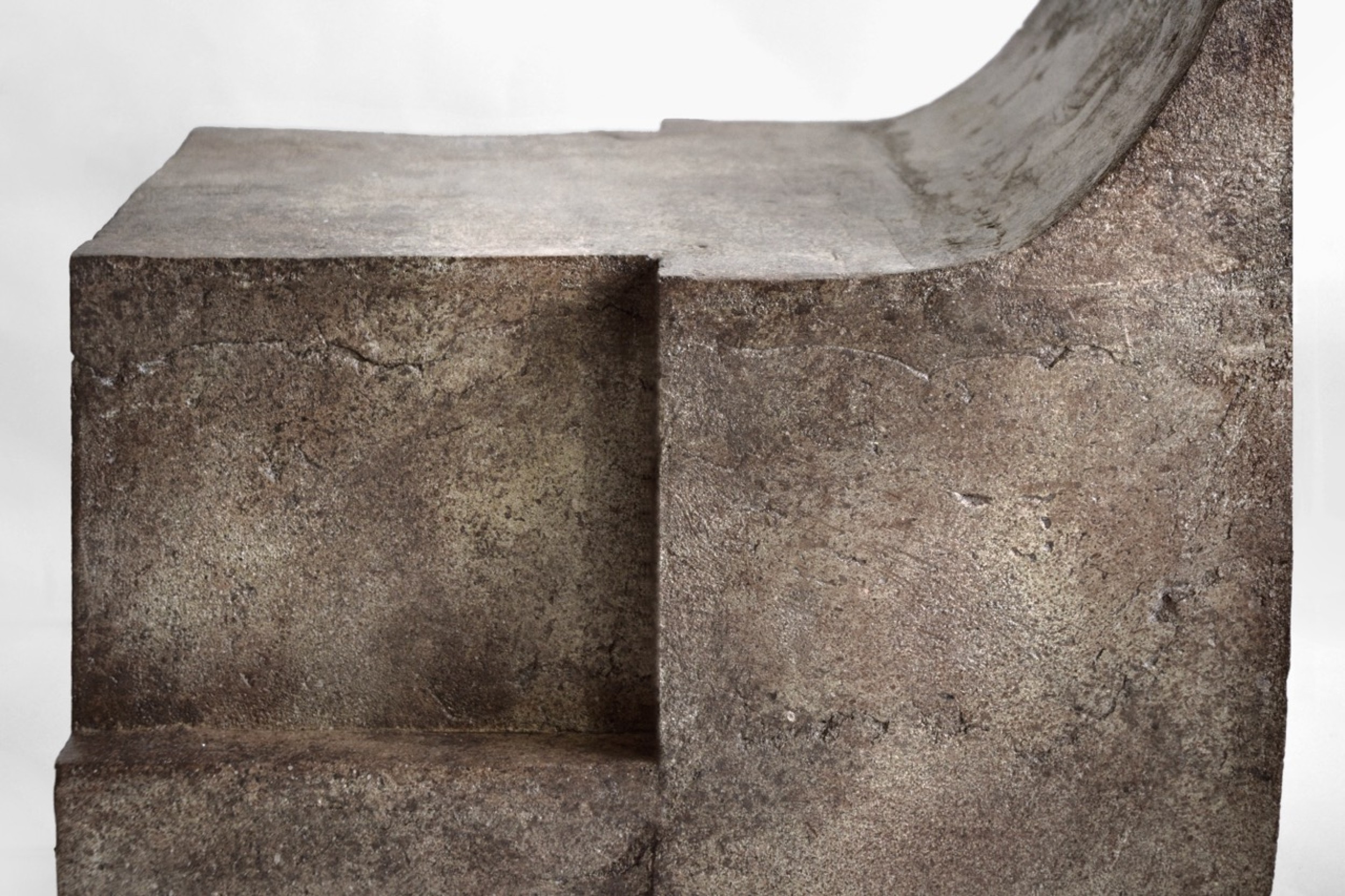 3 Contemporary Mono Block chairs with a monolithic sculptural cement structures with a curved and wedged back rests on a blocky bases