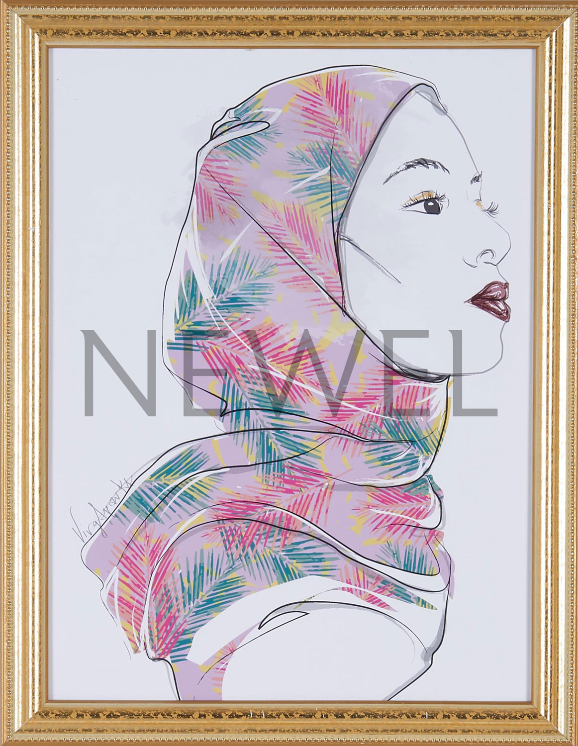 Contemporary pencil and watercolor portrait of a woman titled "Ms. July" in a gold rectangular frame (Companion pieces: AAP058, AAP059, AAP061)