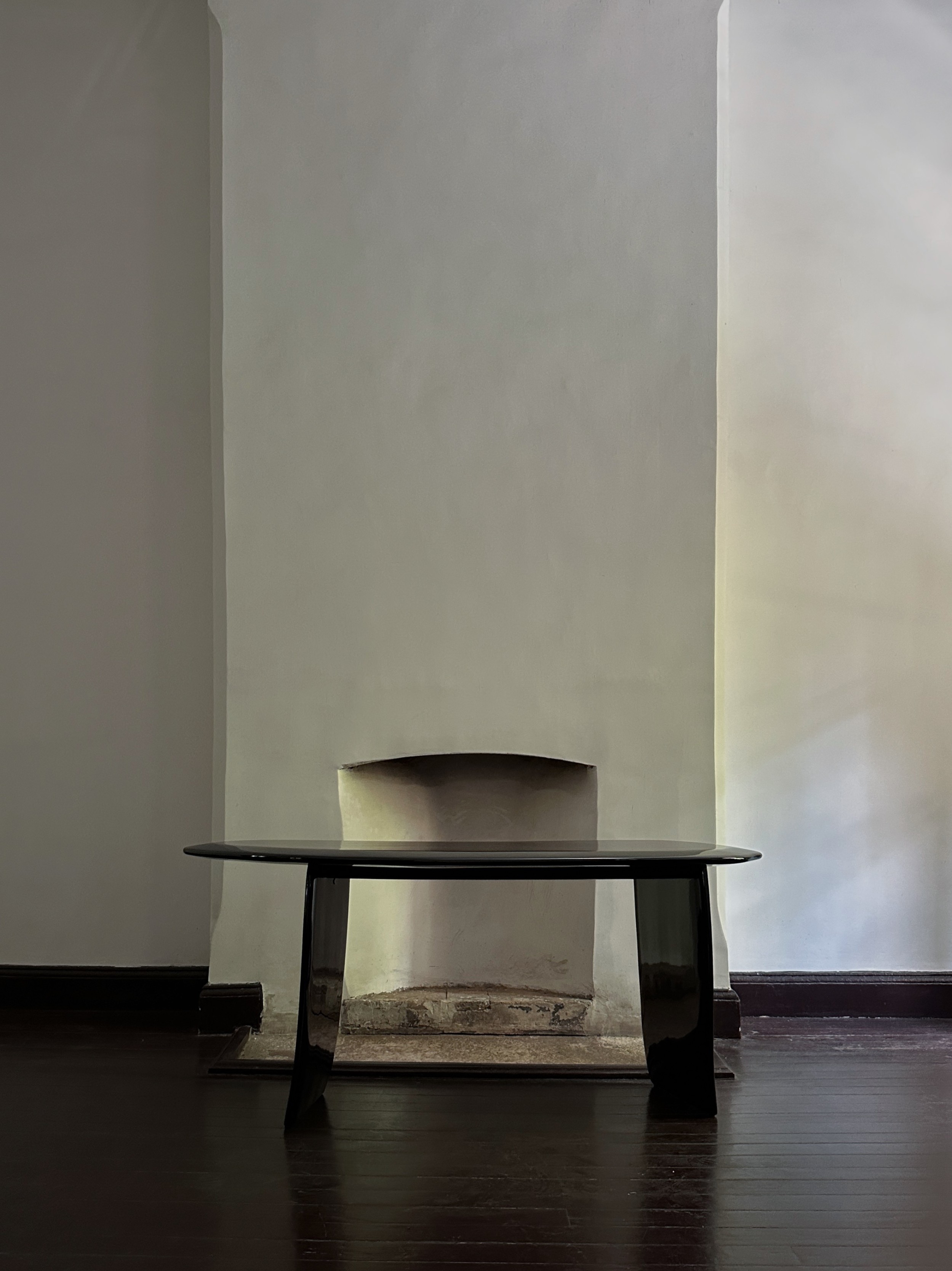 Contemporary ash wood bench with an organically shaped top ending on three slabbed legs in a black high gloss lacquer finish