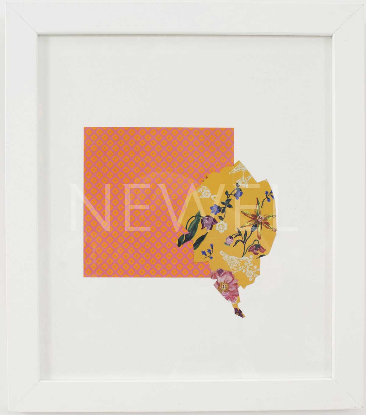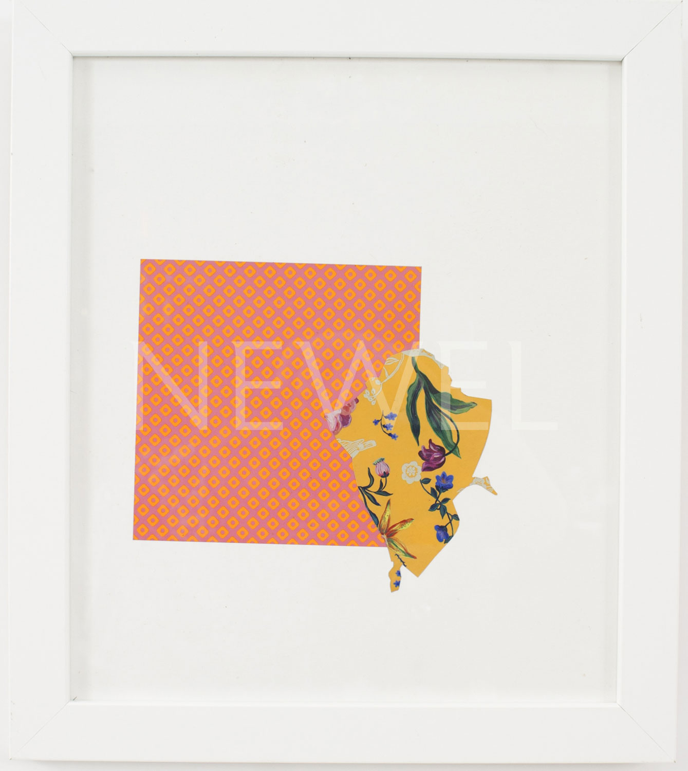 Contemporary pink and yellow patterned origami paper collage on a white background in a white rectangular frame (Companion pieces: AAP208, AAP209, AAP210, AAP212, AAP213)