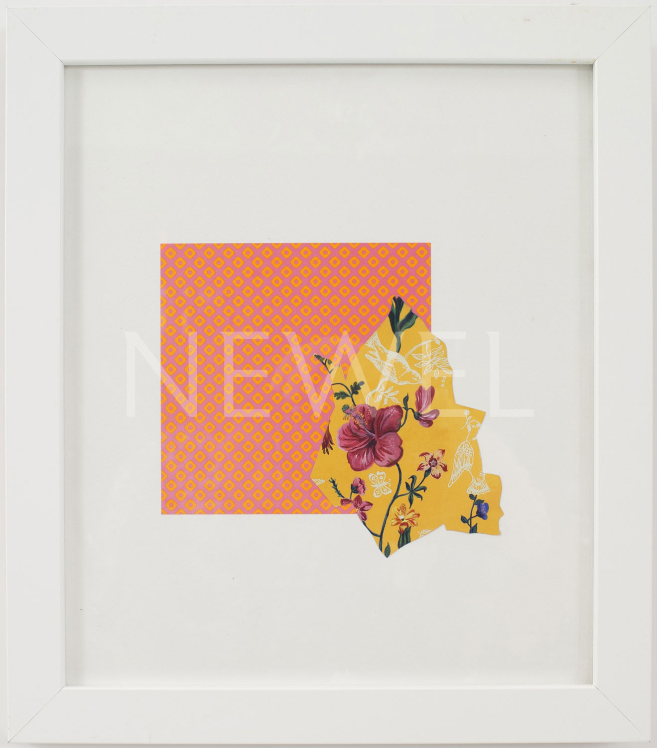 Contemporary pink and yellow patterned origami paper collage on a white background in a white rectangular frame (Companion pieces: AAP208, AAP209, AAP210, AAP211, AAP213)