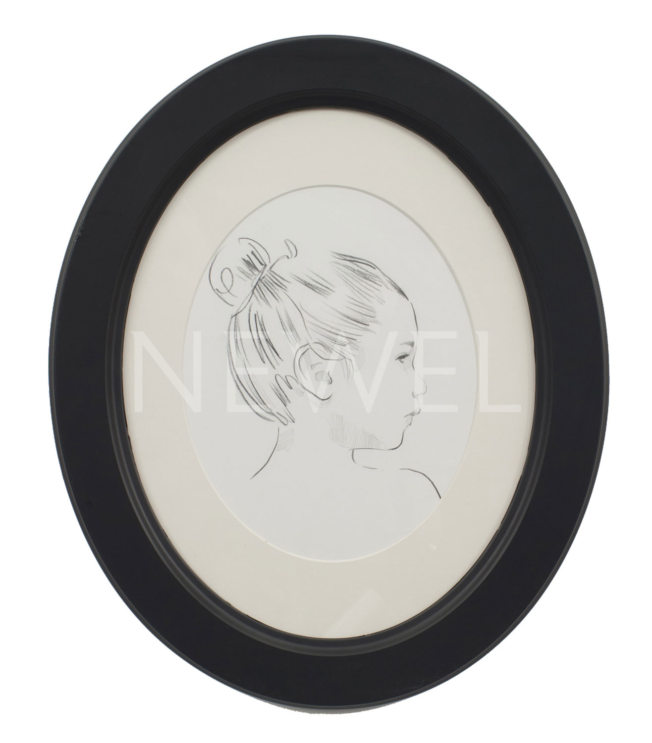 Contemporary pencil-drawn portrait of a child on a white background in a a black oval frame (Companion pieces: AAP194, AAP195, AAP197)