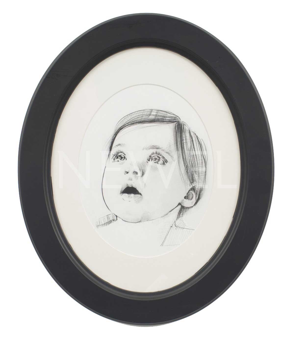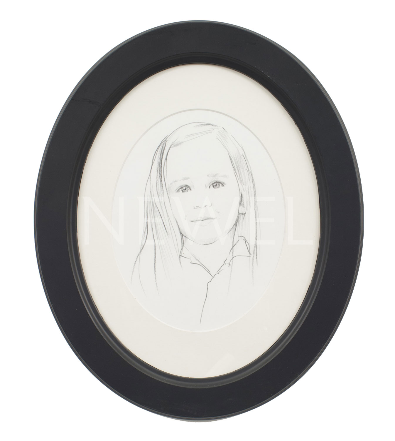 Contemporary pencil-drawn portrait of a child on a white background in a a black oval frame (Companion pieces: AAP194, AAP195, AAP196)