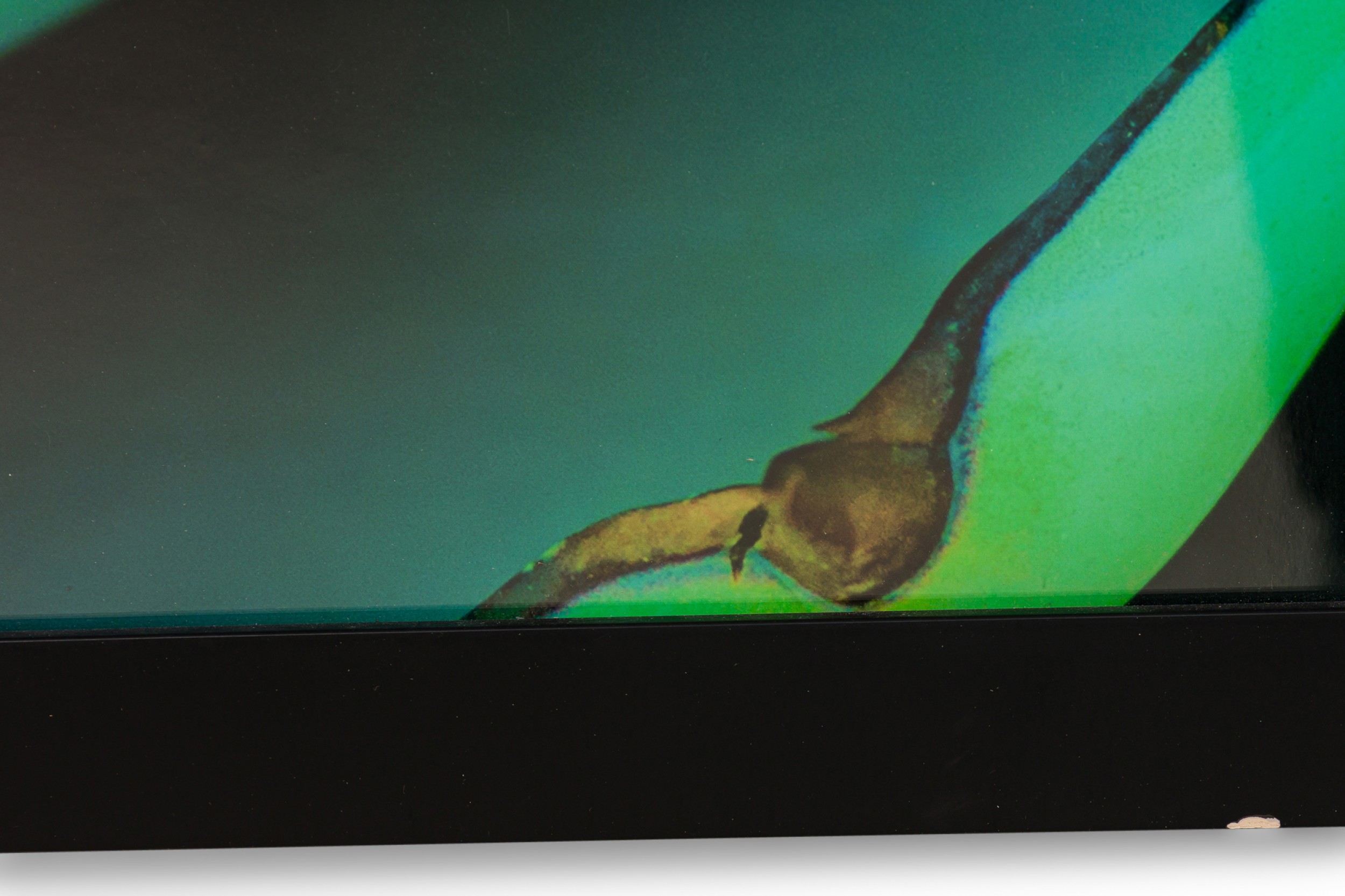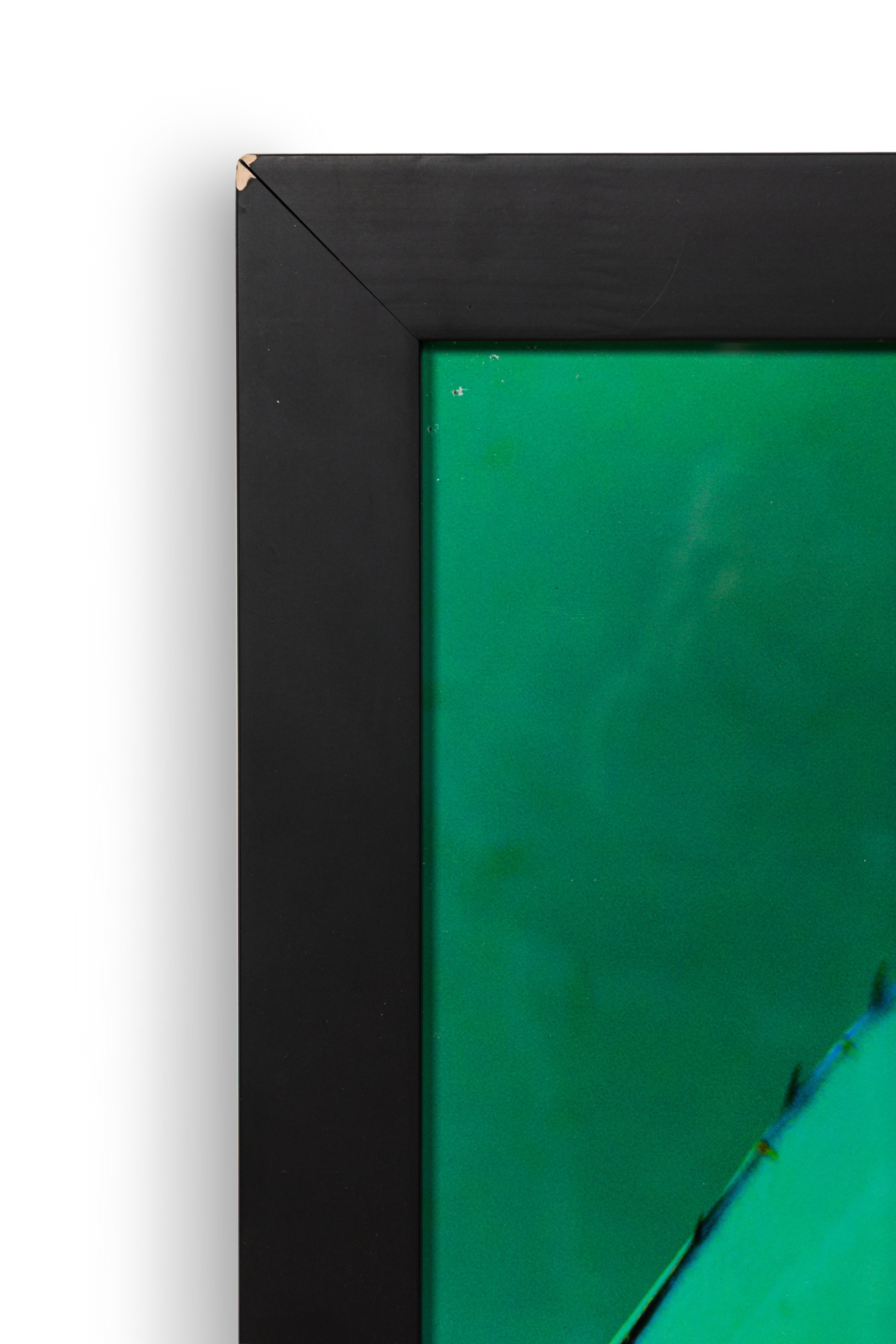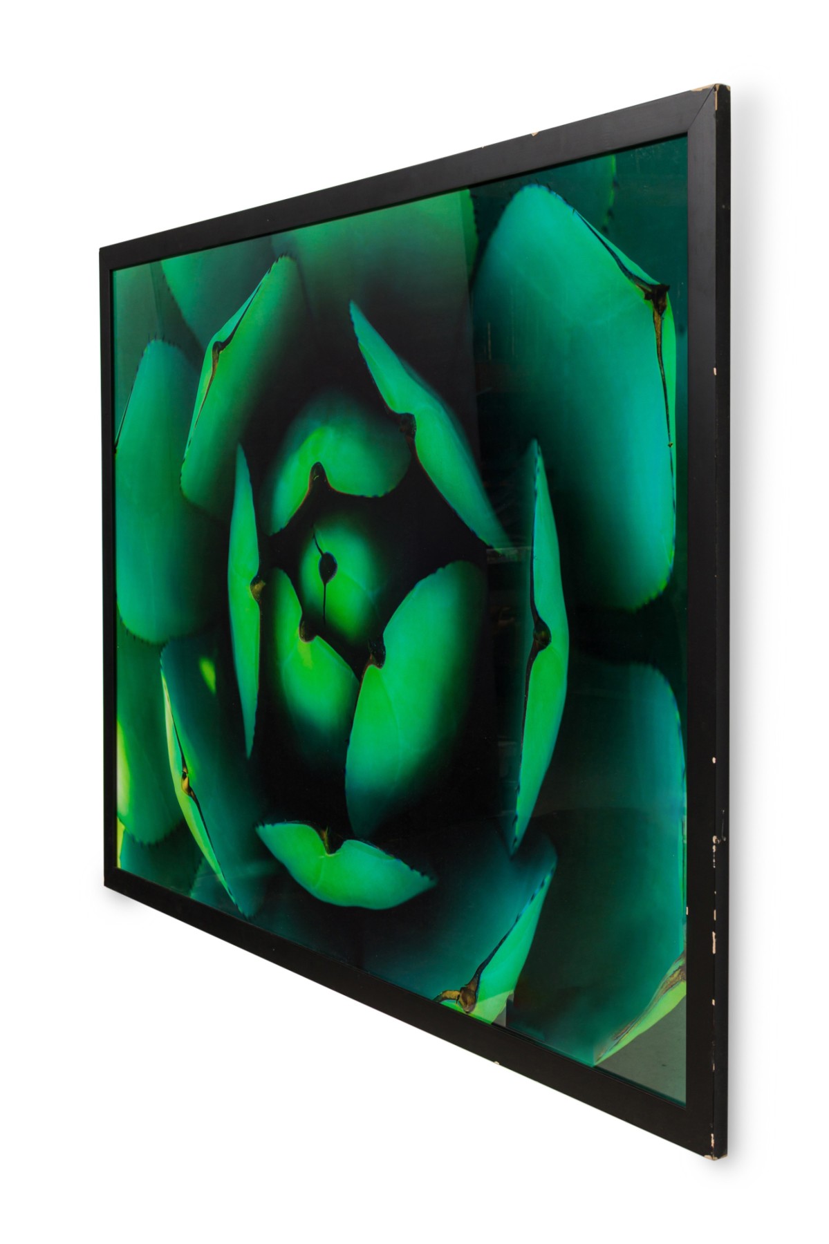 Photographic print of a tightly cropped agave plant in vivid green hues, captured with dramatic lighting and deep contrast, set in a simple black frame.