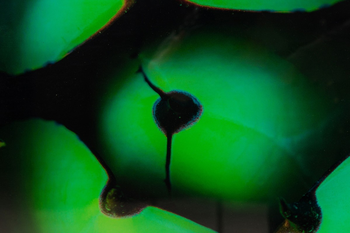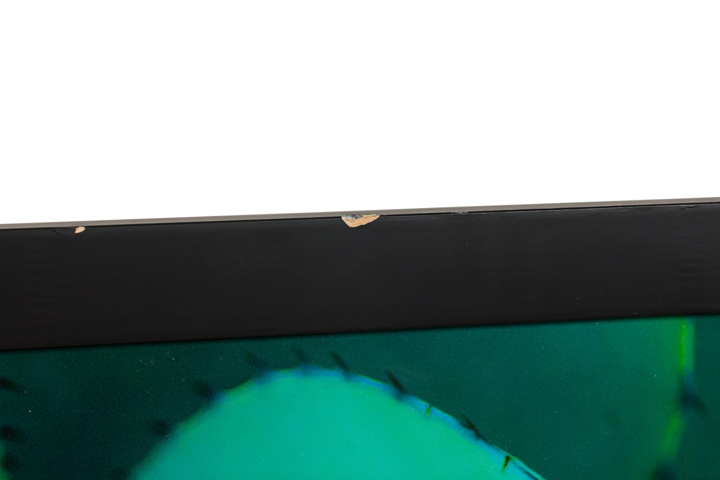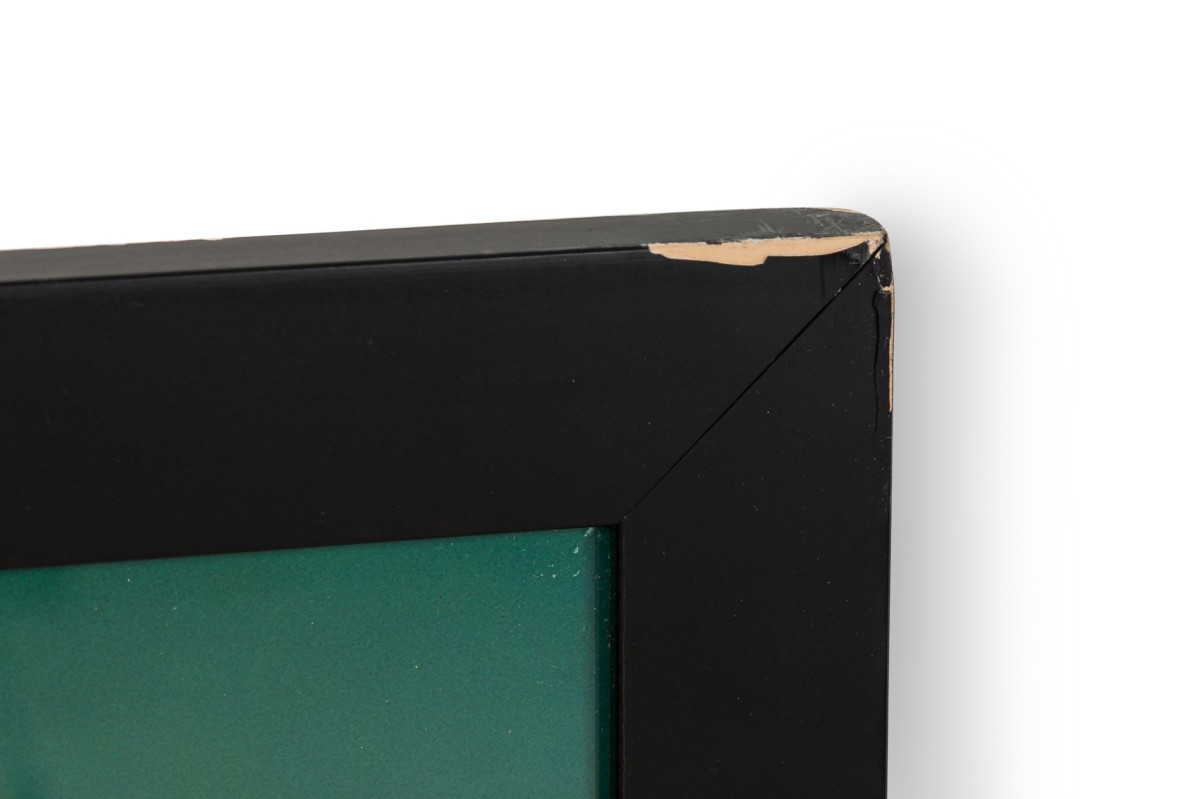 Photographic print of a tightly cropped agave plant in vivid green hues, captured with dramatic lighting and deep contrast, set in a simple black frame.