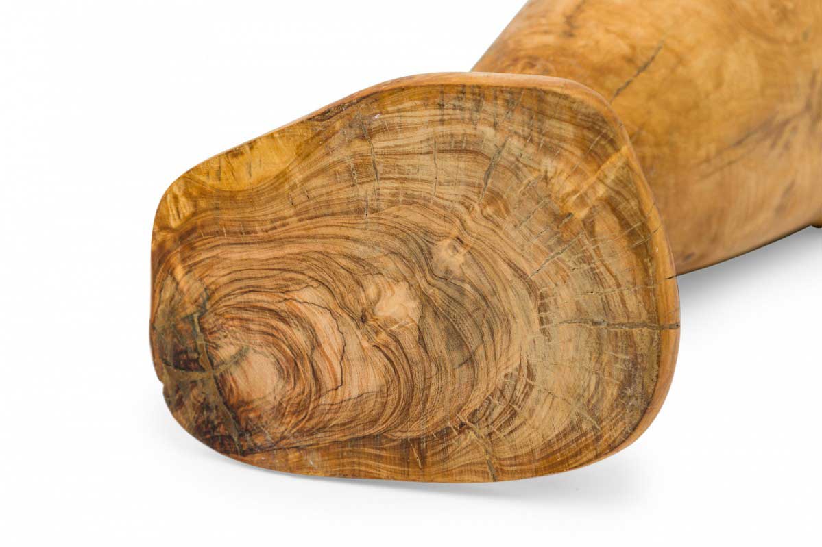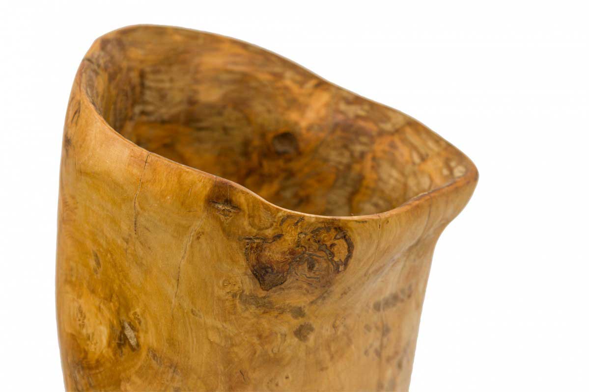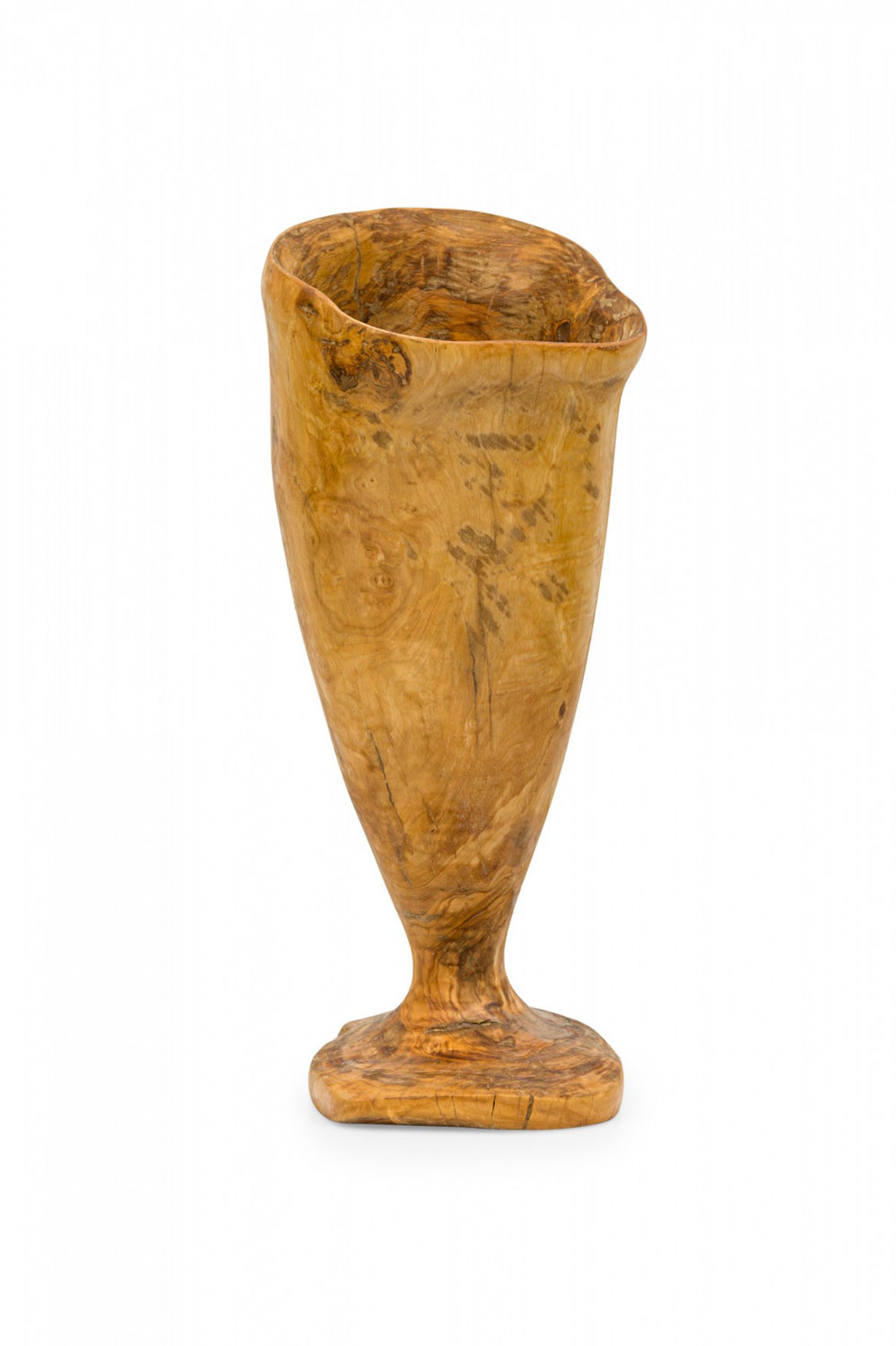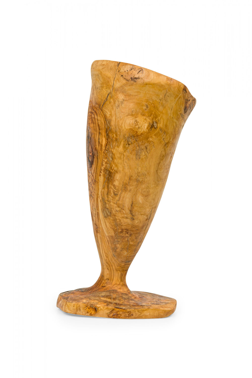 Contemporary Rustic Modern organically shaped wooden vase with a conical vessel resting on an organic circular foot.