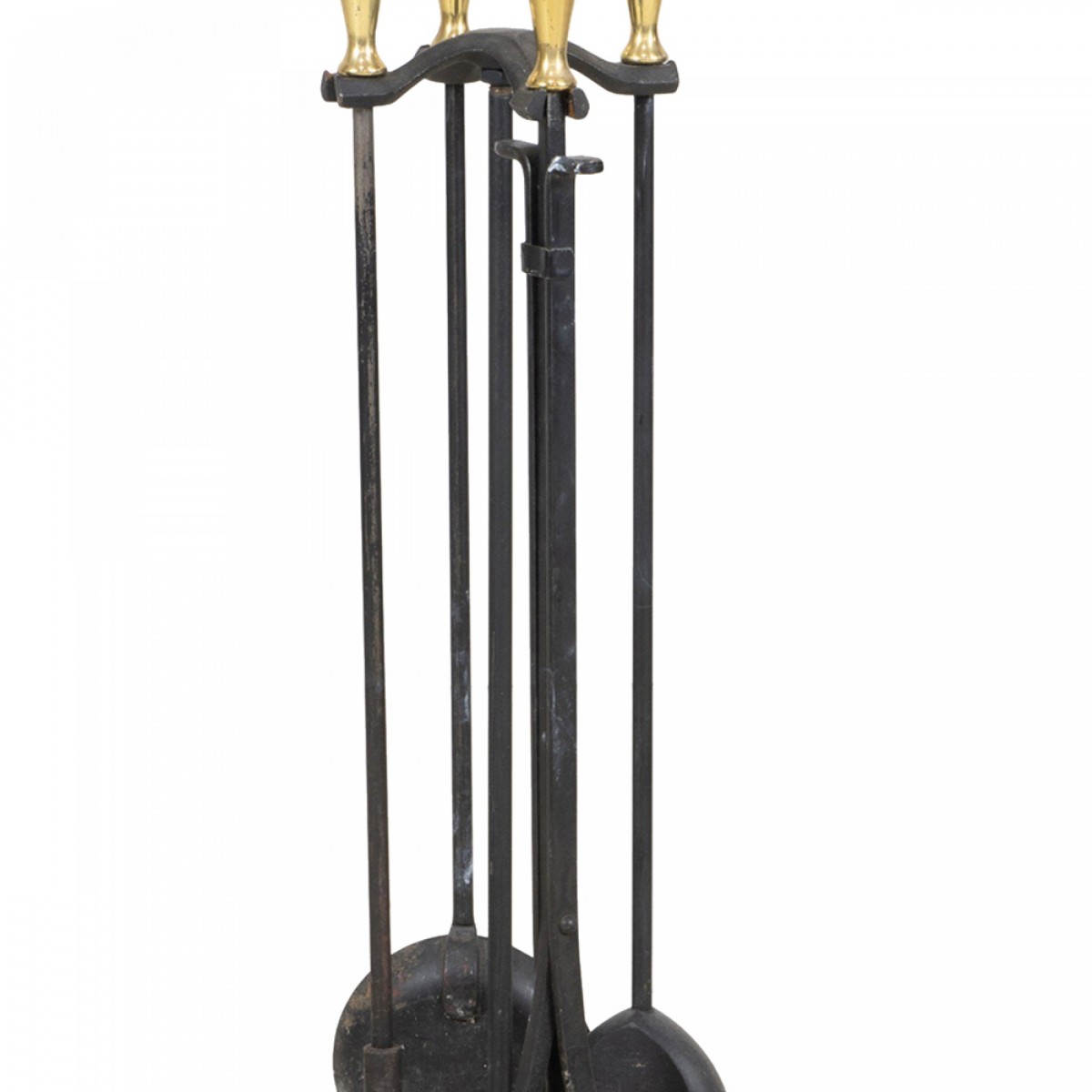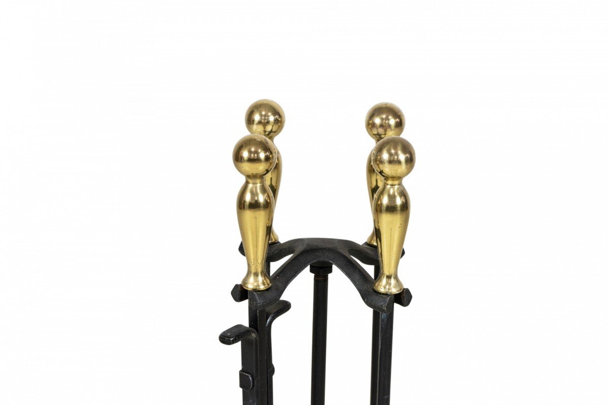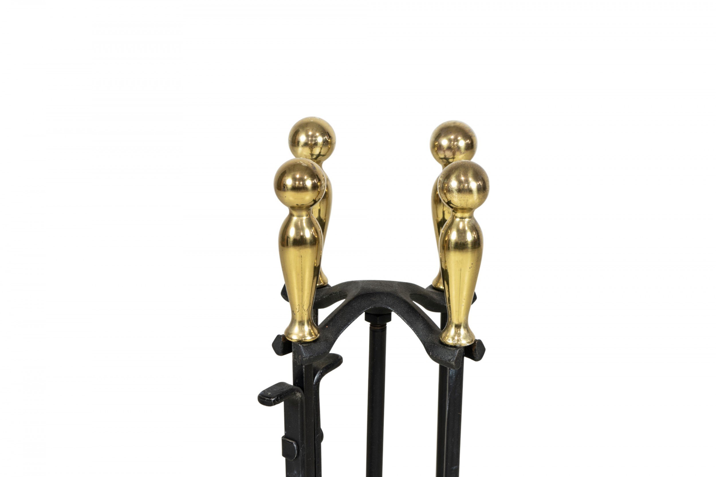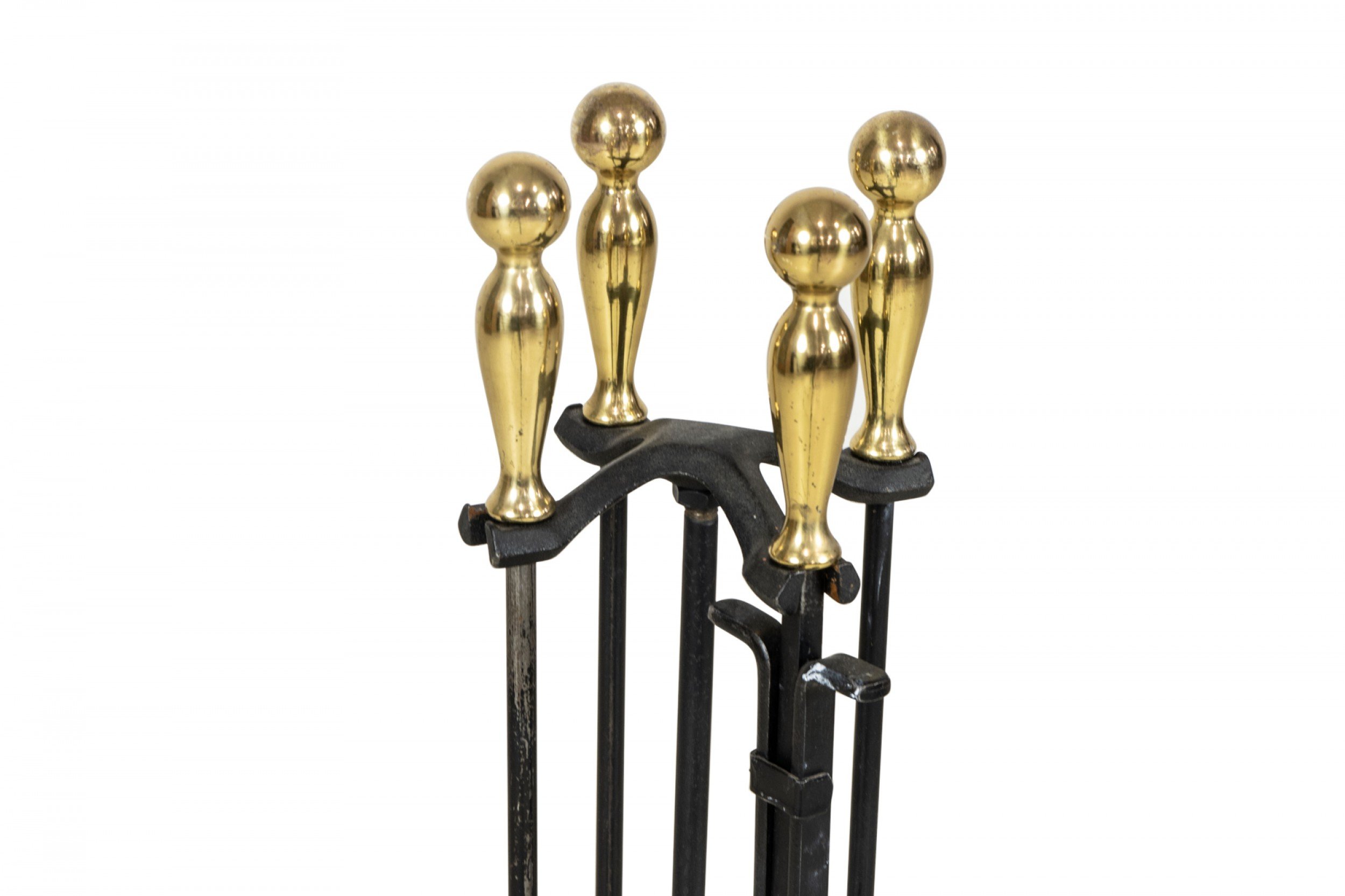 Contemporary set of iron fire tools comprised of a shovel, poker, log tongs, and a brush with molded brass handles with ball finials in a matching iron stand.