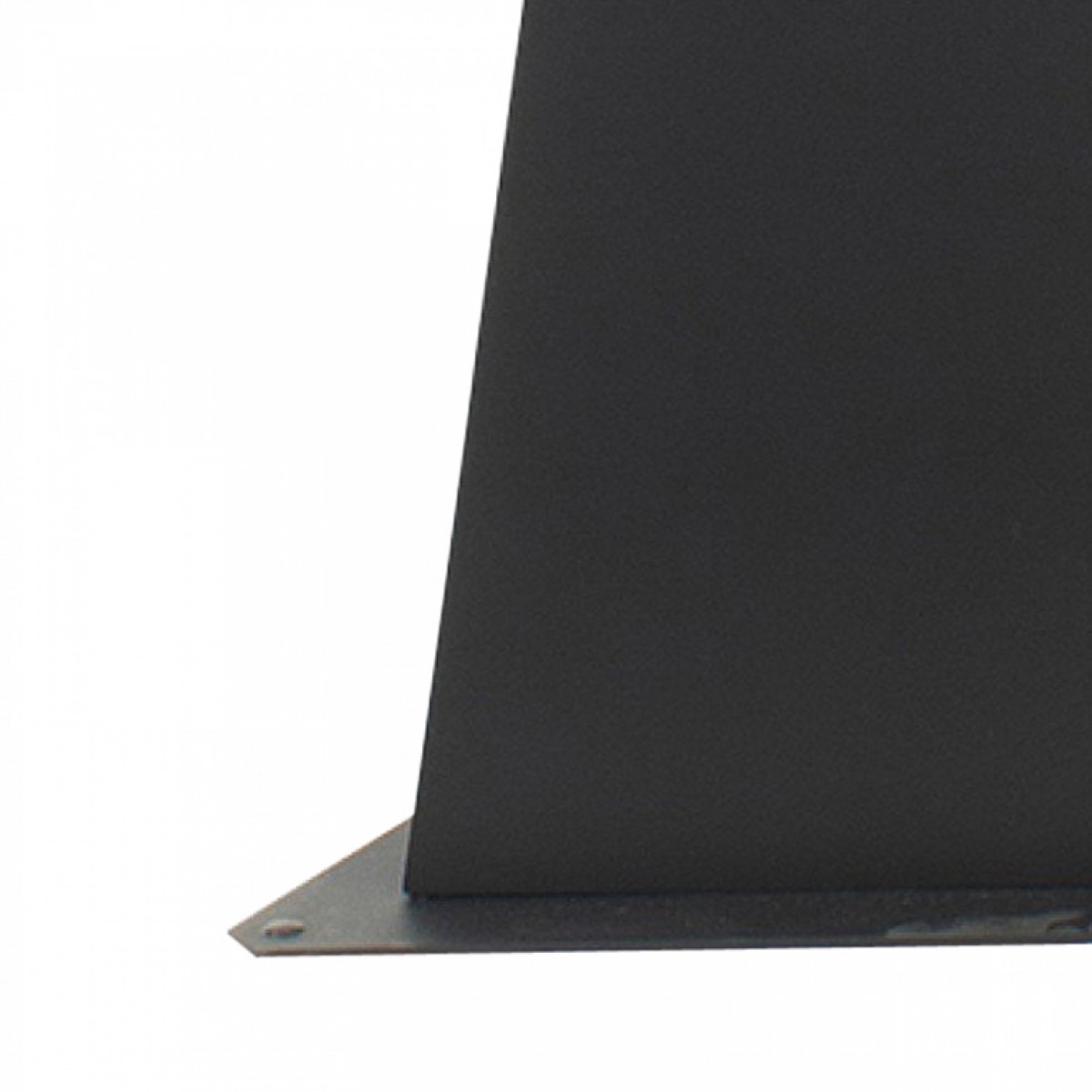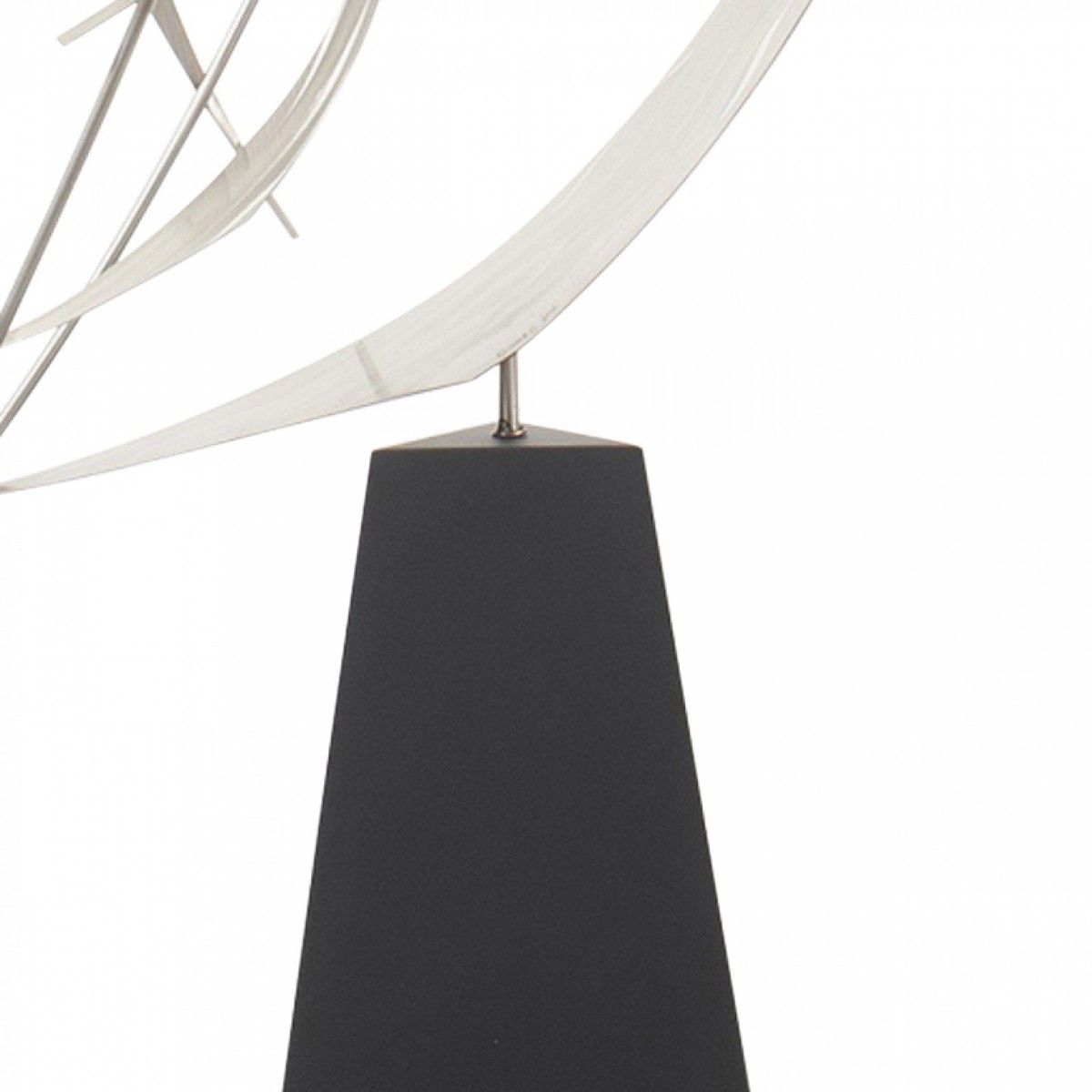Contemporary large silver metal floor sculpture with interlocking curved shapes on a tapered black triangular metal base