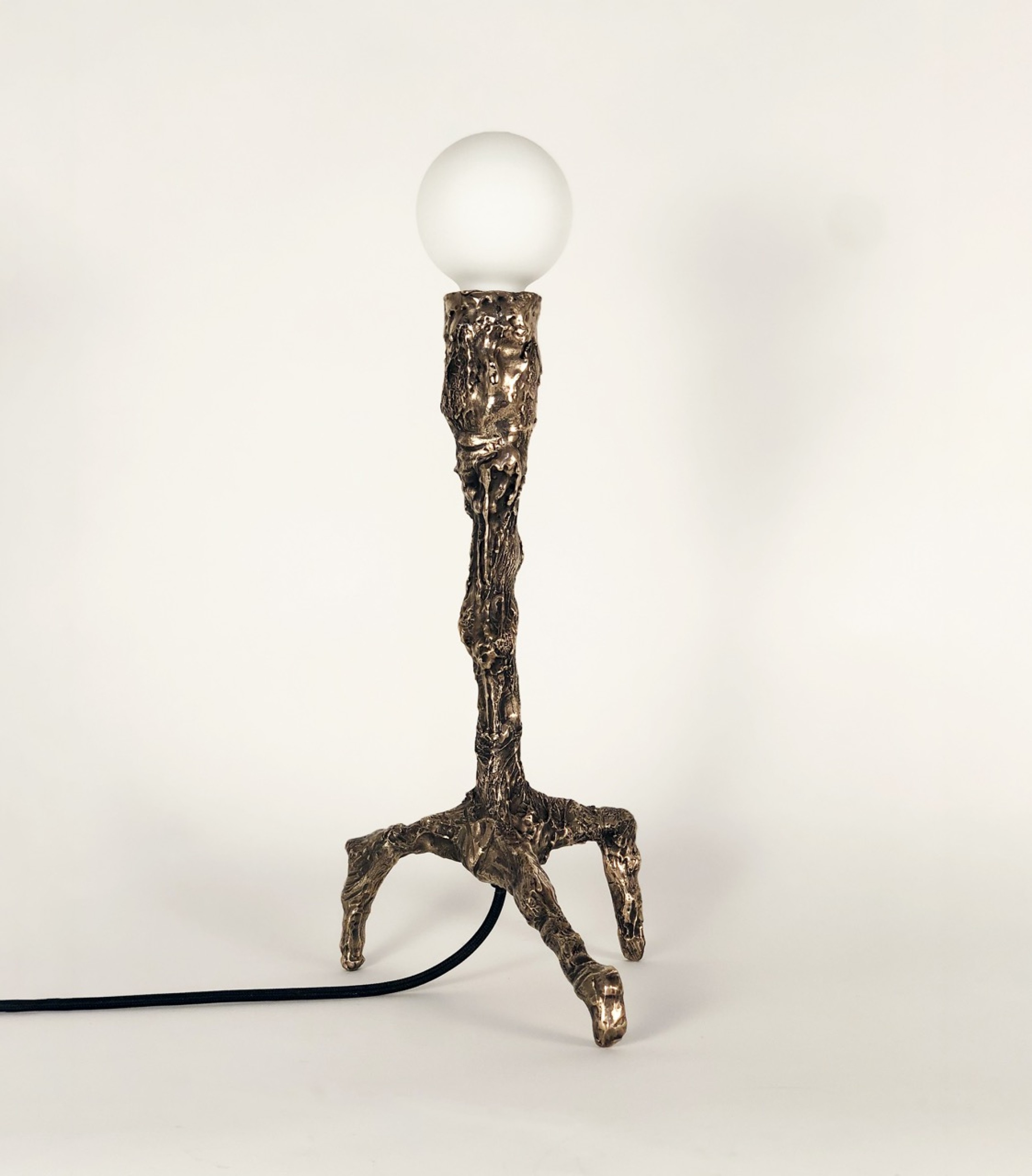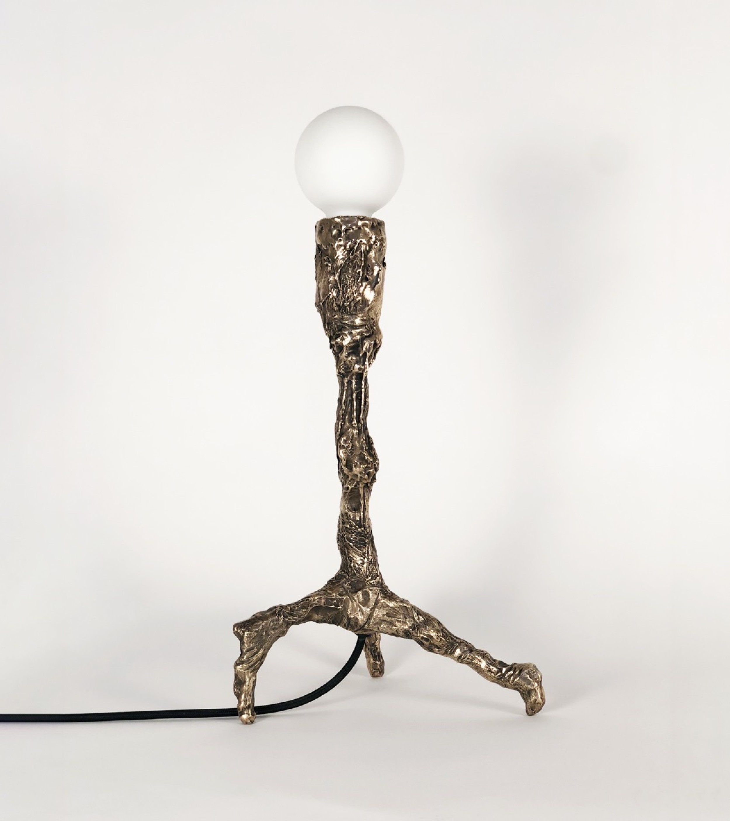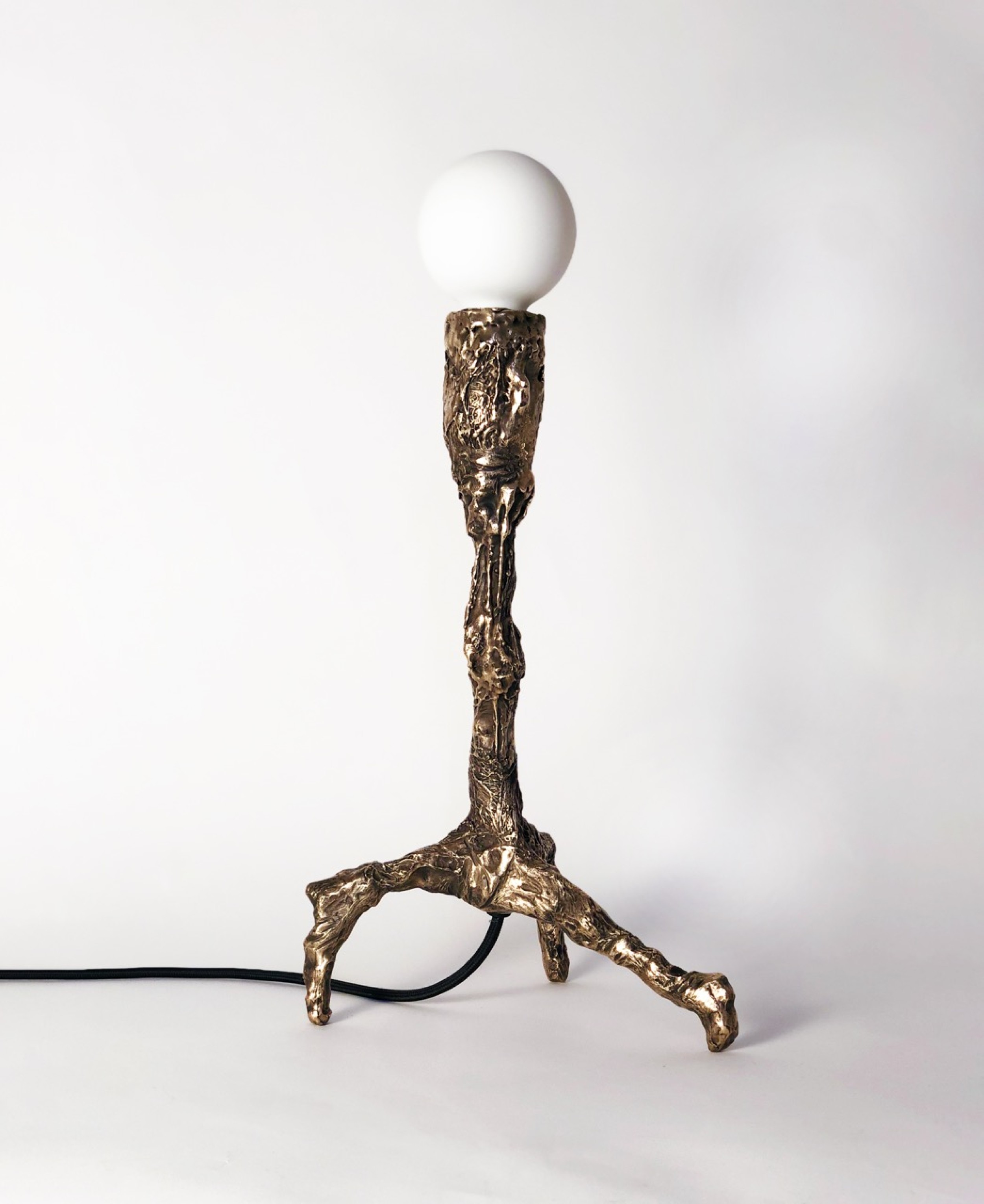 Contemporary bronze hand sculpted unique table lamp with sculptural, patinated and polished body ending on three legs