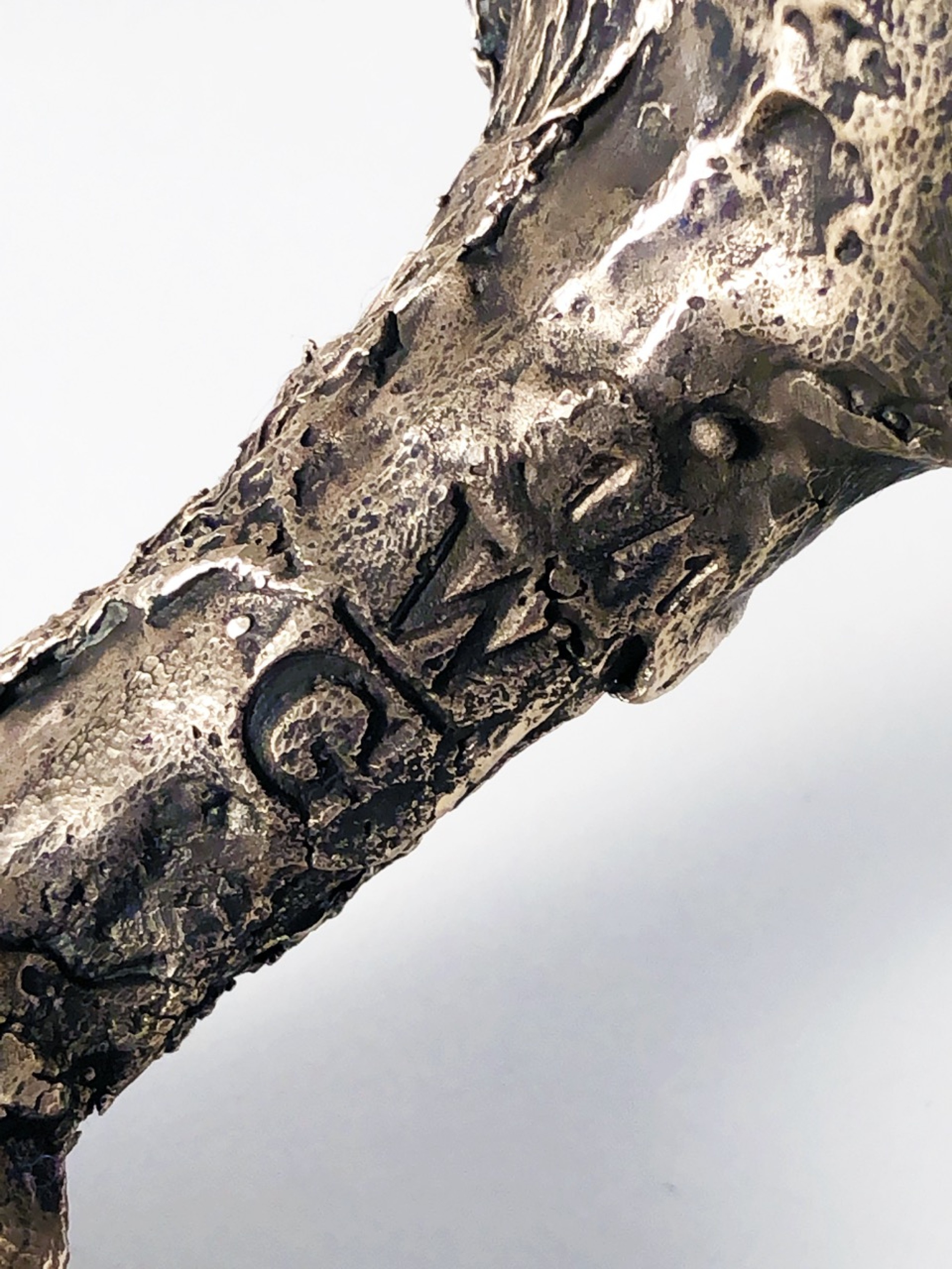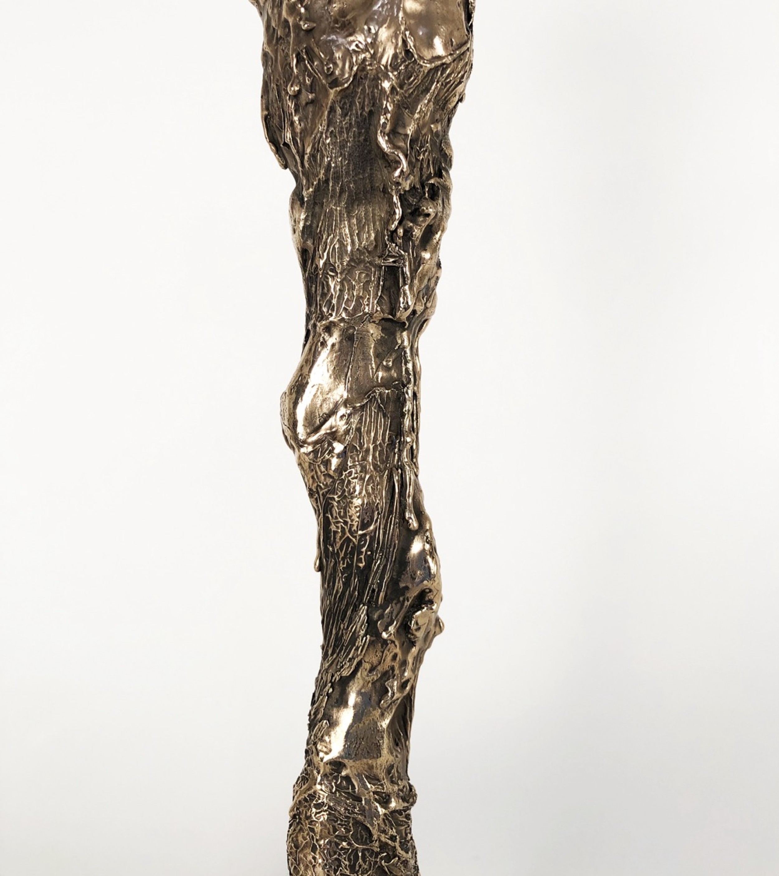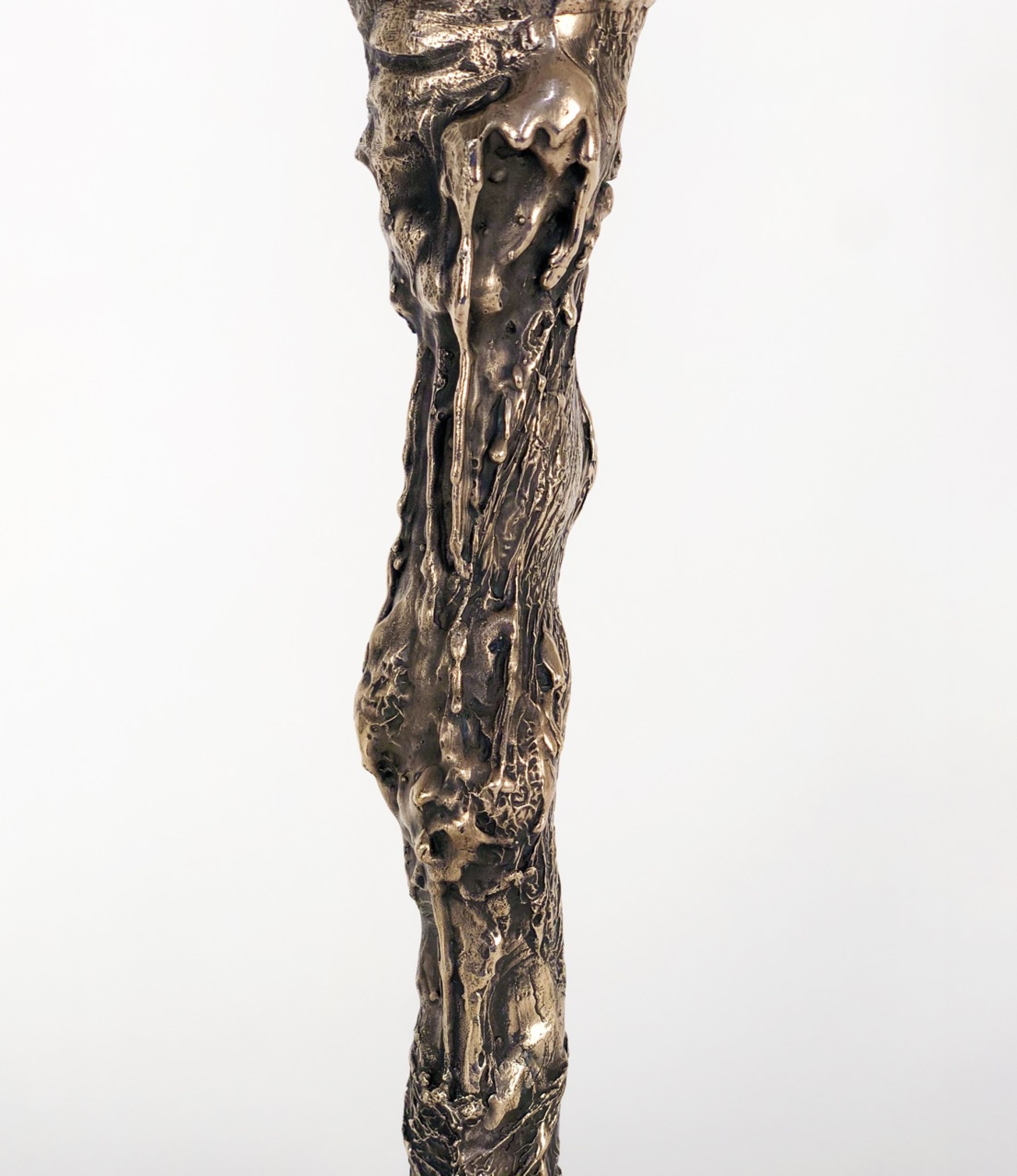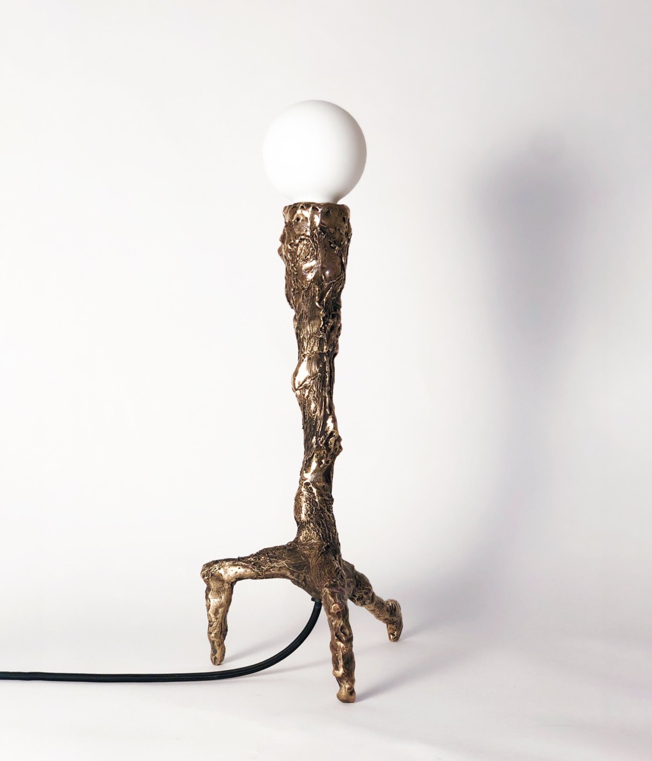 Contemporary bronze hand sculpted unique table lamp with sculptural, patinated and polished body ending on three legs