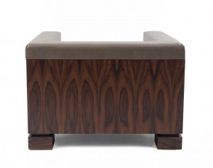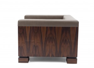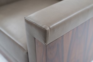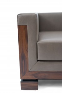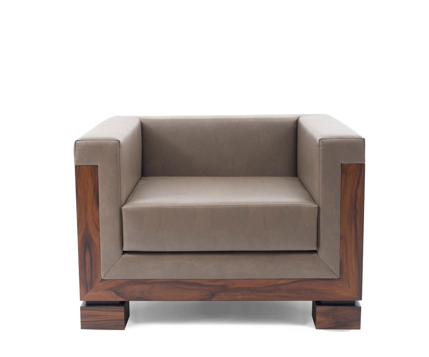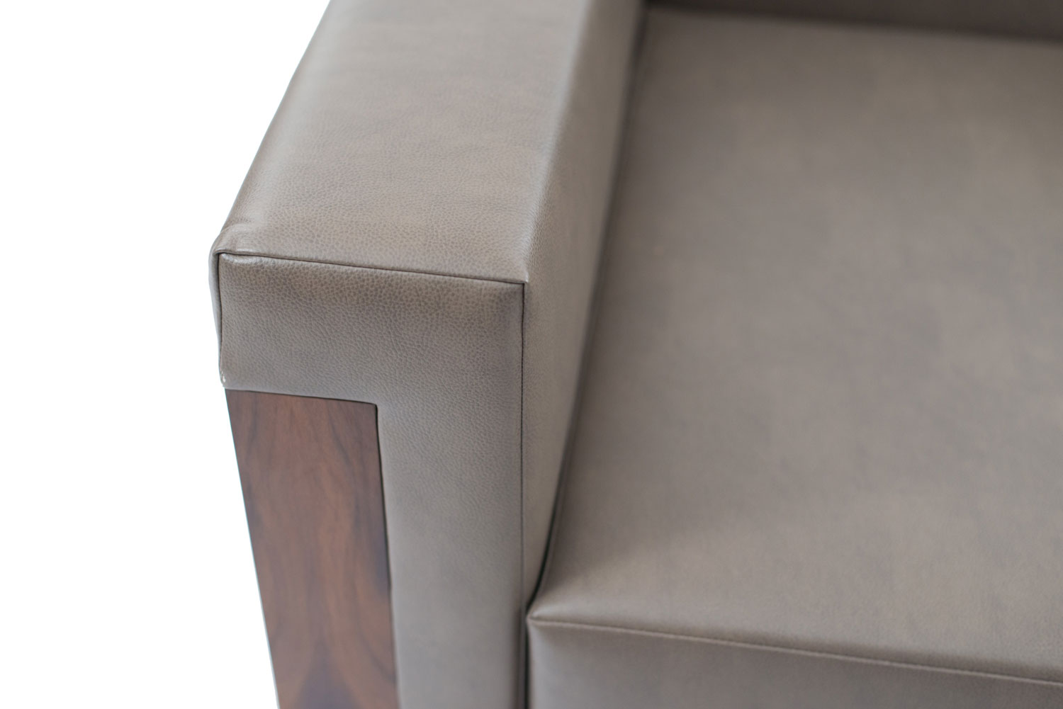 2 Contemporary extra large custom cube shaped armchairs with taupe leather upholstery and polished dark wood frames. (PRICED EACH) (Related item: 062055)