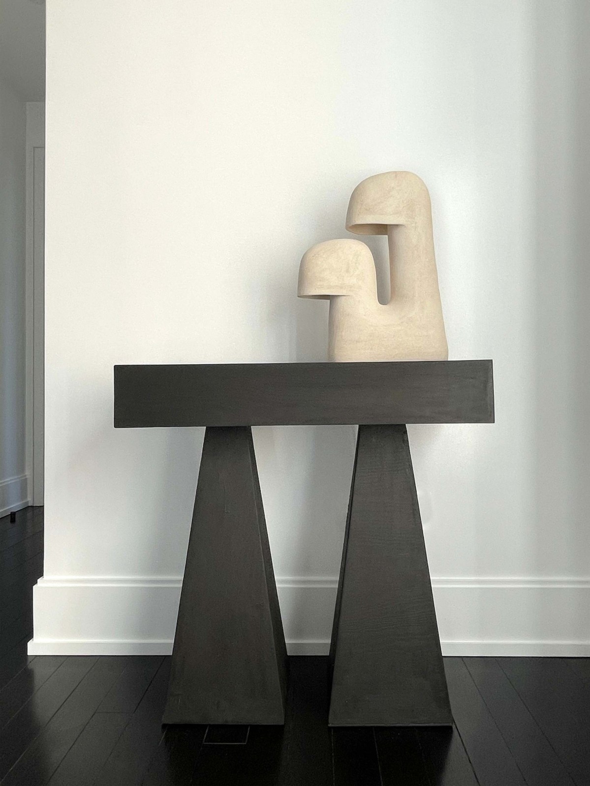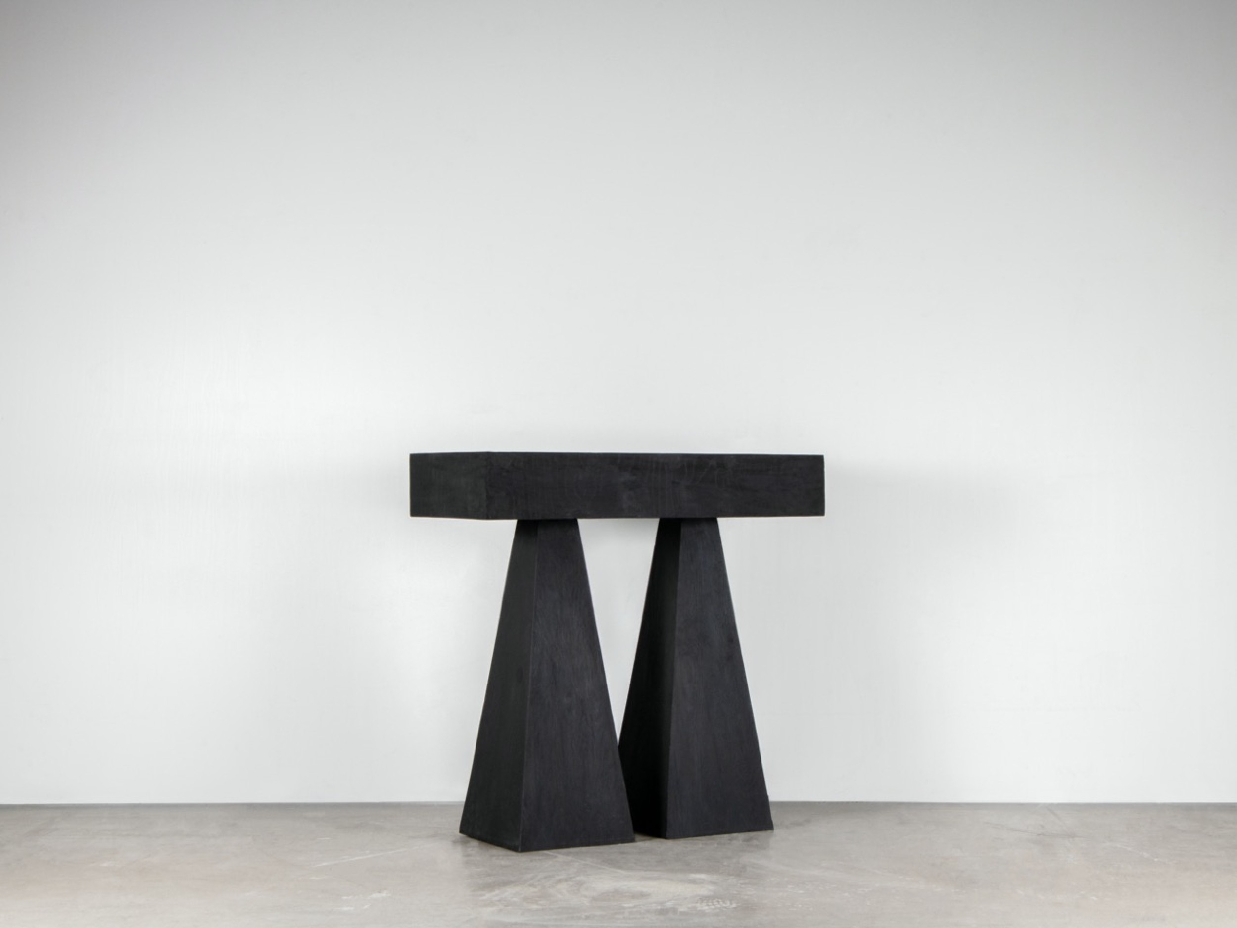 Contemporary handwaxed plywood console with a rectangular top resting on two pyramid bases
