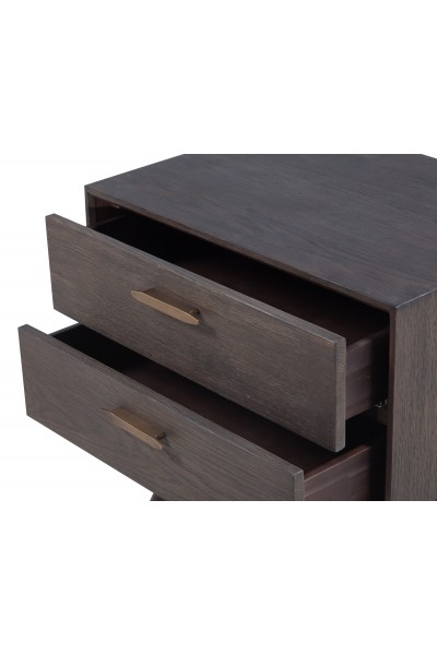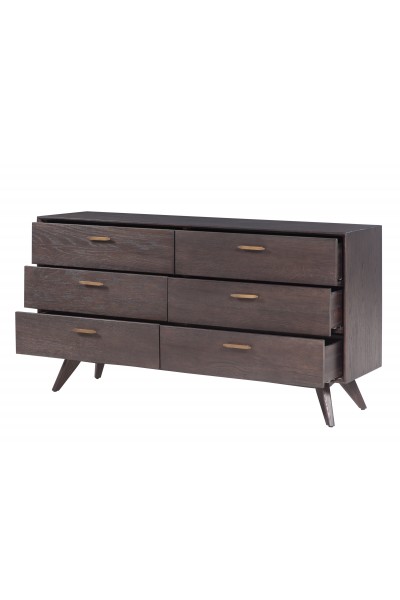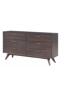 Contemporary oak 6-drawer dresser with antiqued brass handles, felt-lined soft-close drawers, tapered legs, and a washed gray finish (Related items: 061255, 061256)