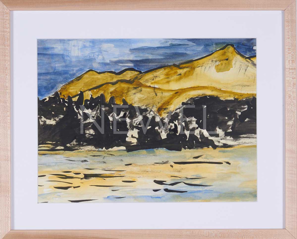 Contemporary watercolor painting of a mountain scene titled, "Watercolor Valley 1" in a natural wood frame and white matting (Companion piece: AAP171, Similar piece: AAP169)