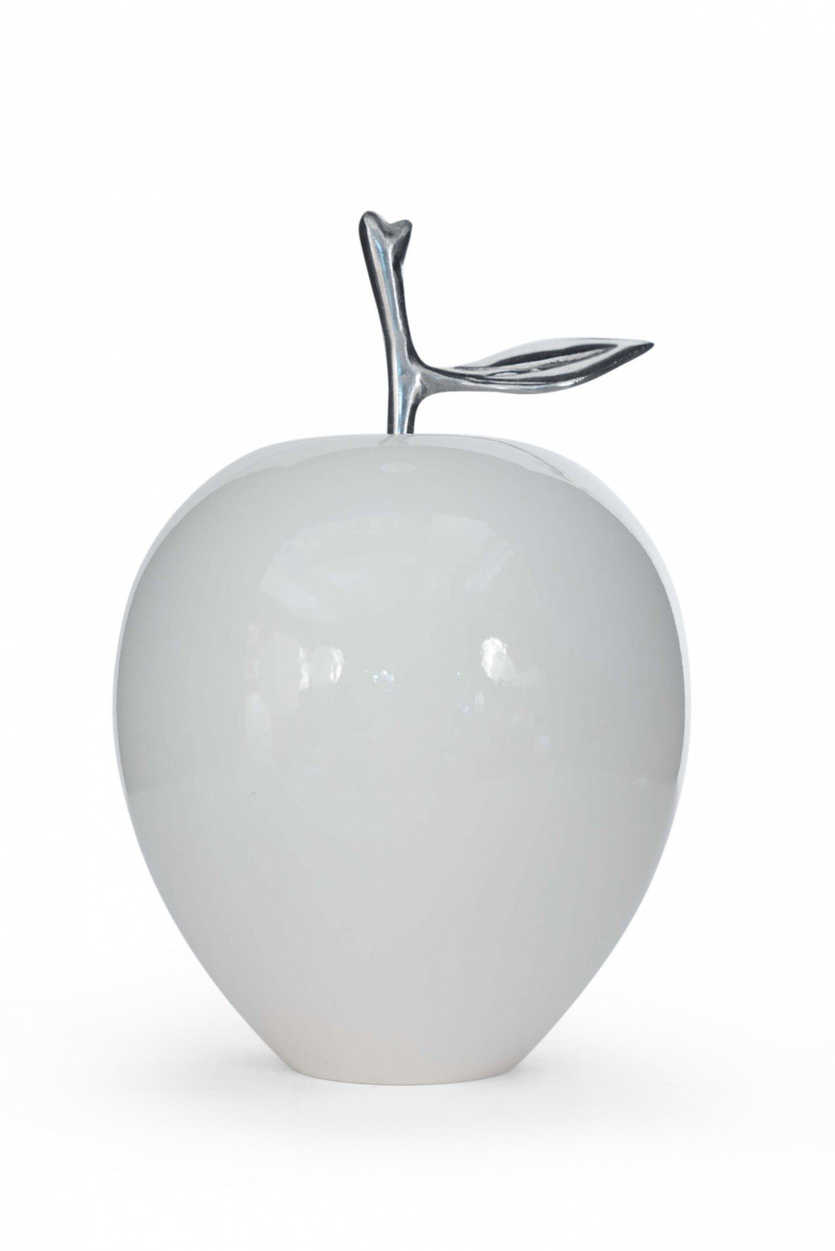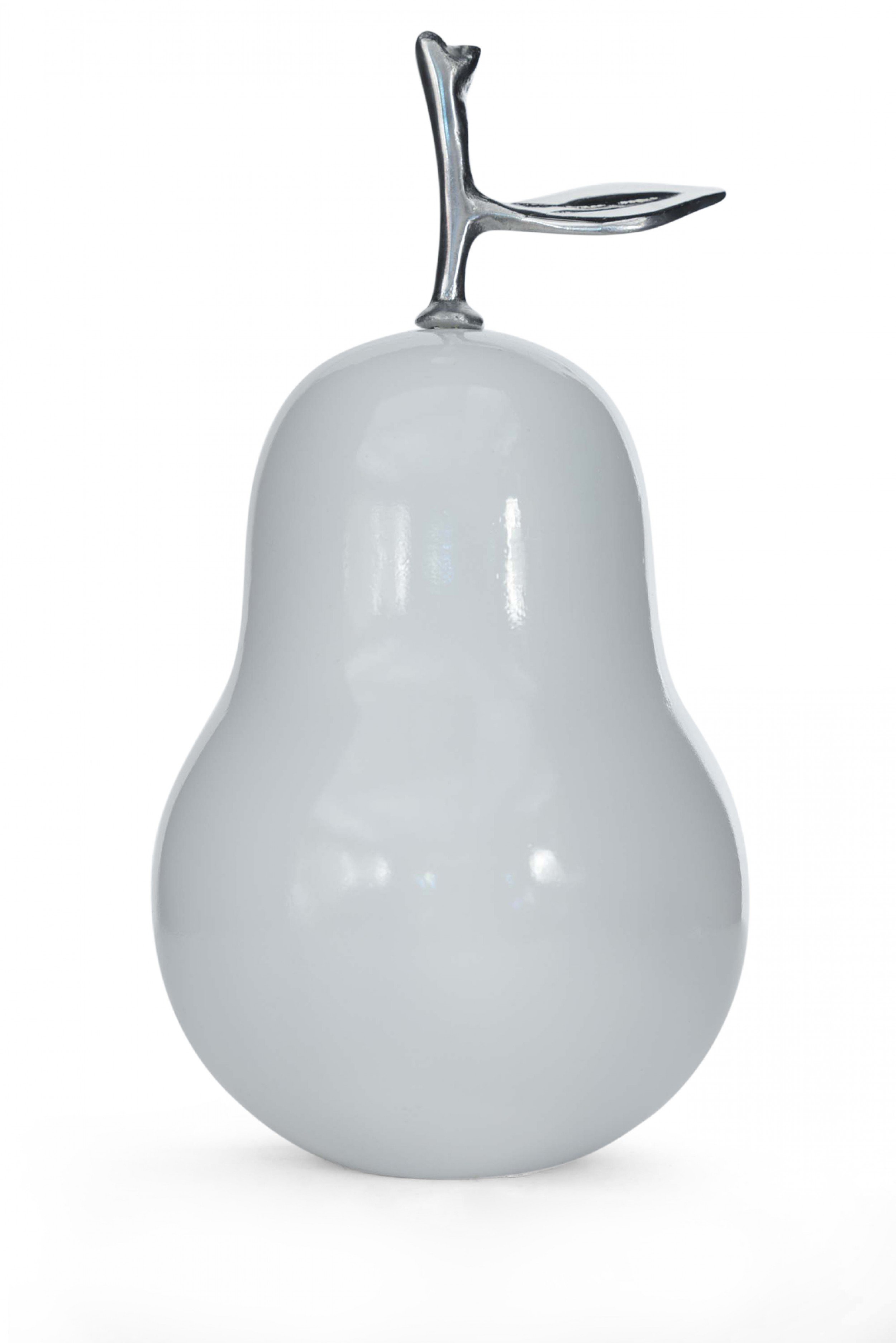 Contemporary white porcelain sculpture in the form of a large pear with a silver metal stem having a leaf (Related to: 060747 and 060749)