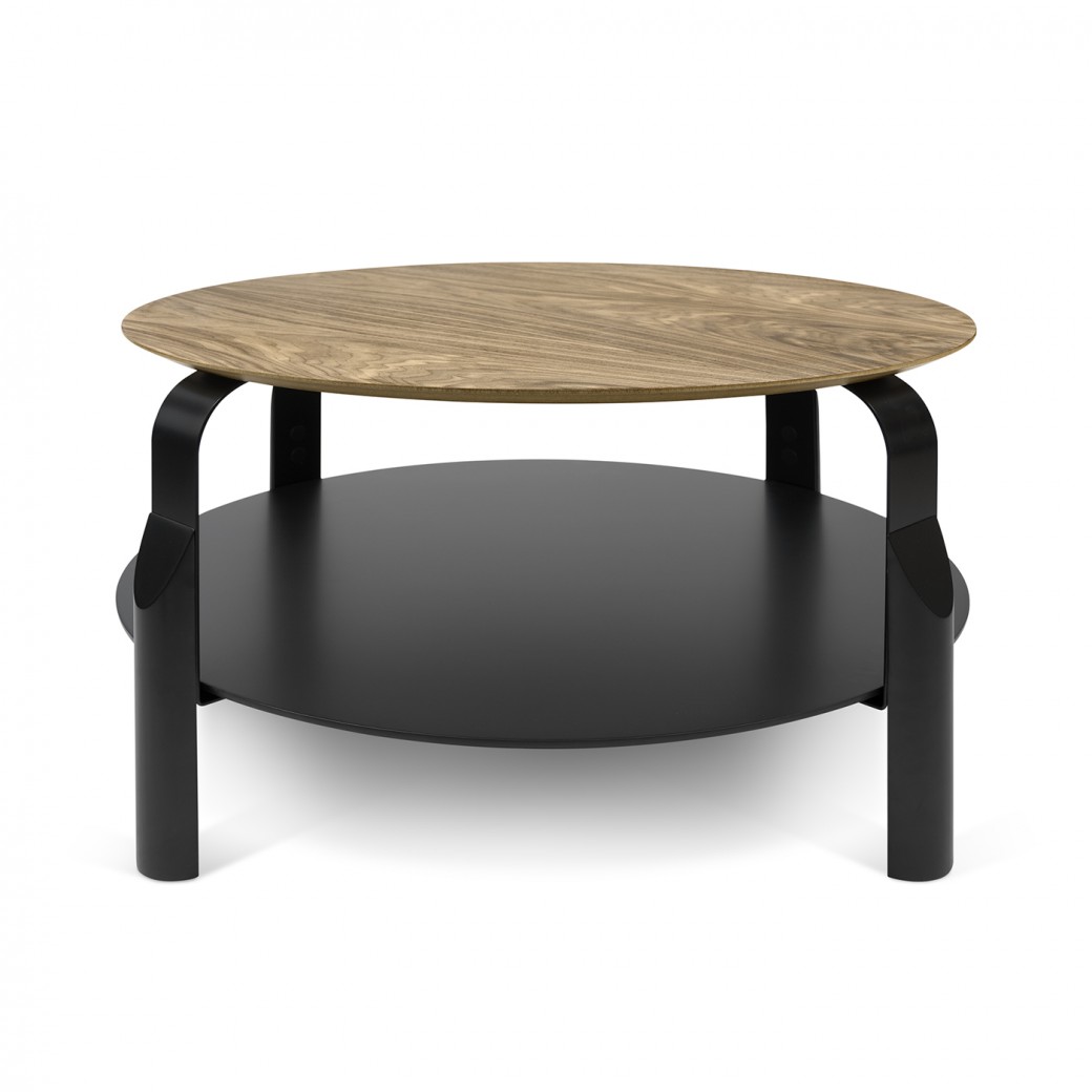 Contemporary style round coffee table with wood veneer top and black metal legs and lower shelf. (Related item: 060869)