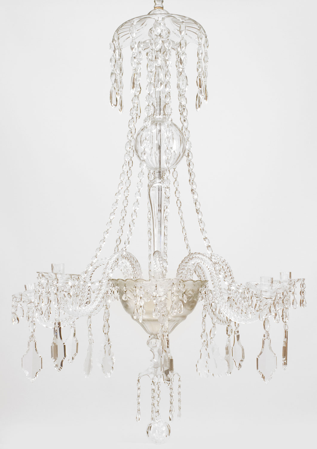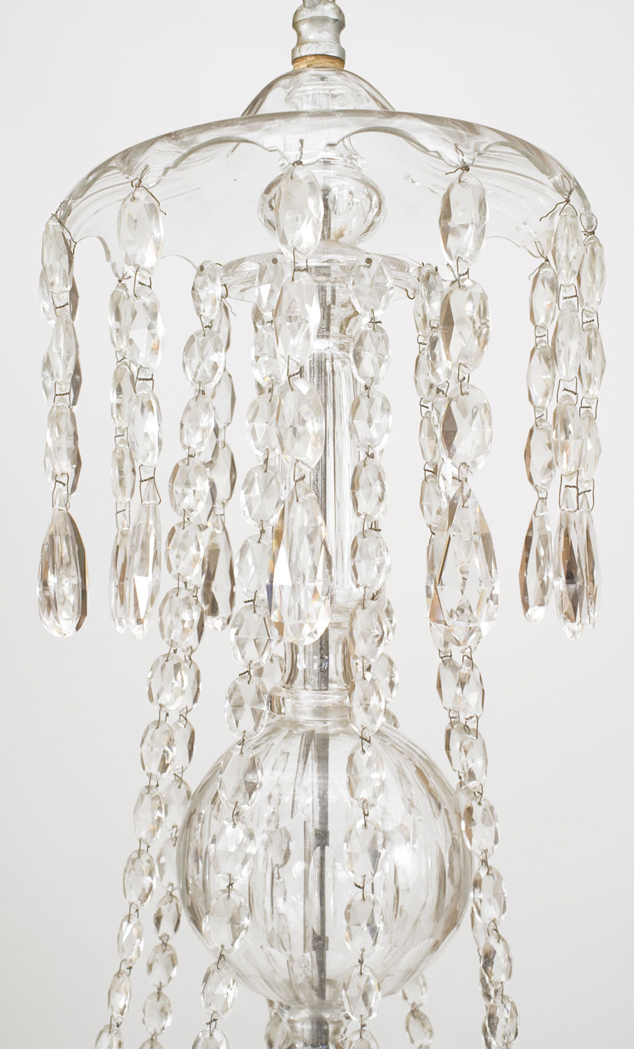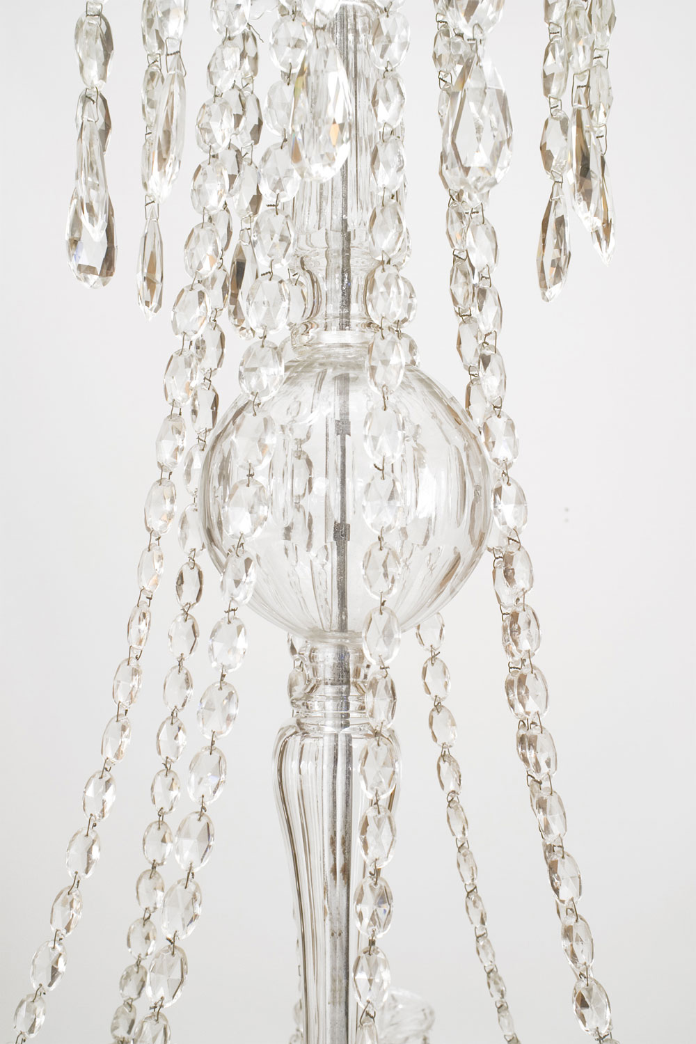 Continental Austrian (Possibly Mid-19th Century) crystal chandelier with 8 arms emanating from a crystal & scalloped silver gilt stem & draped with drops and pendants.