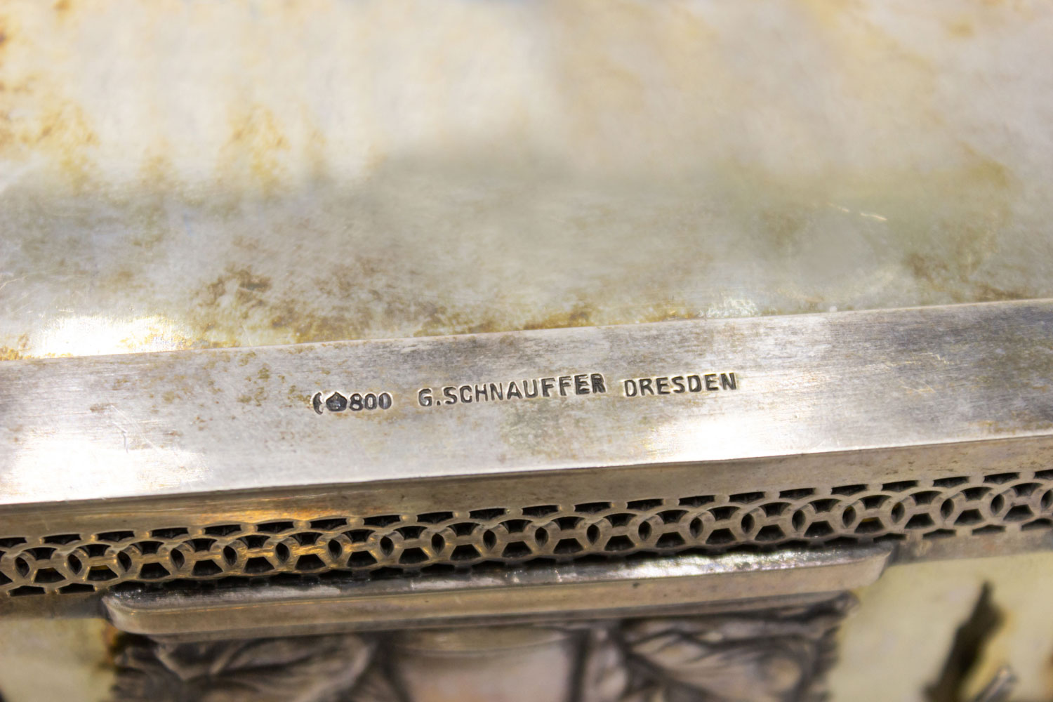 Continental German (19/20th Century) rectangular sterling silver box with Neo-classic figures in relief (signed: S. SCHNAUFFEN, DRESDEN)