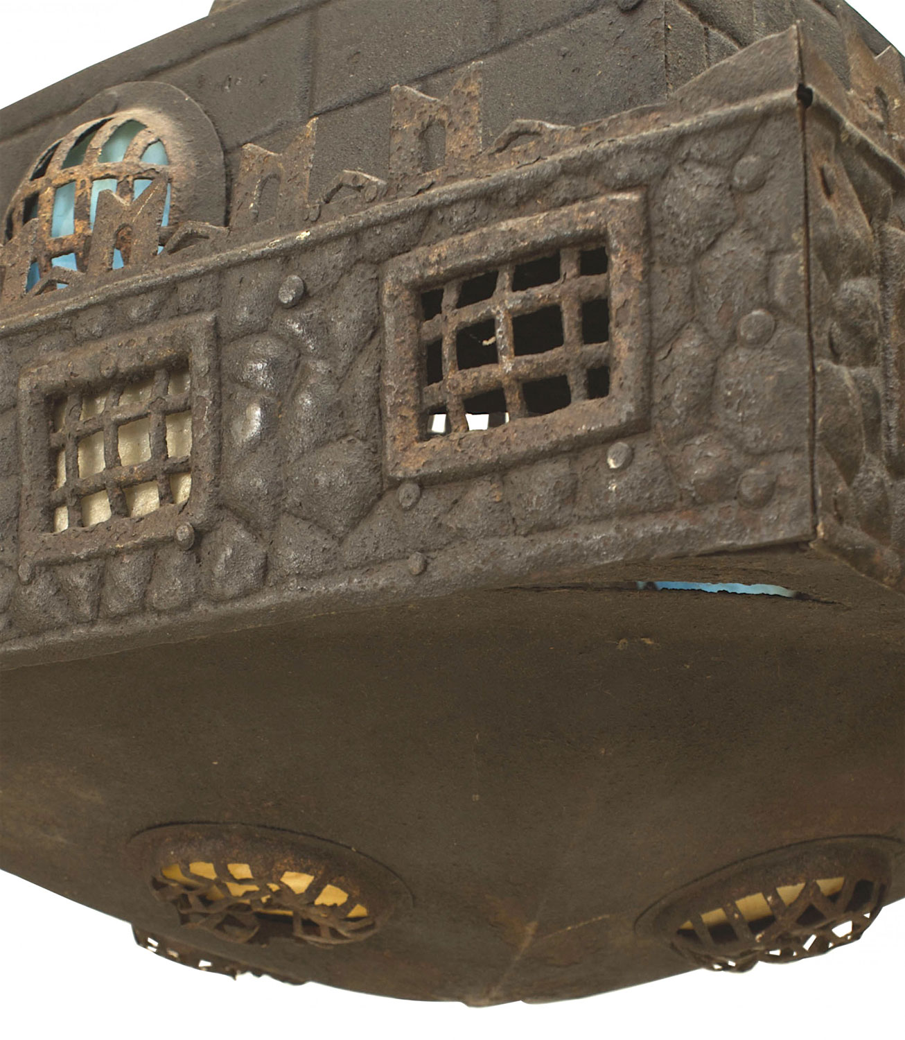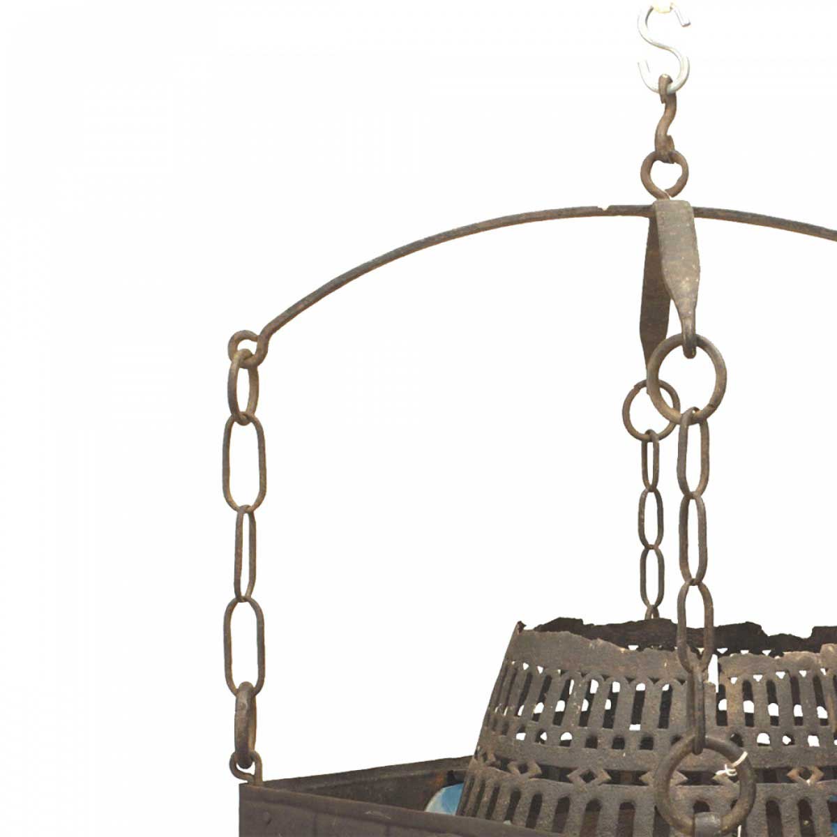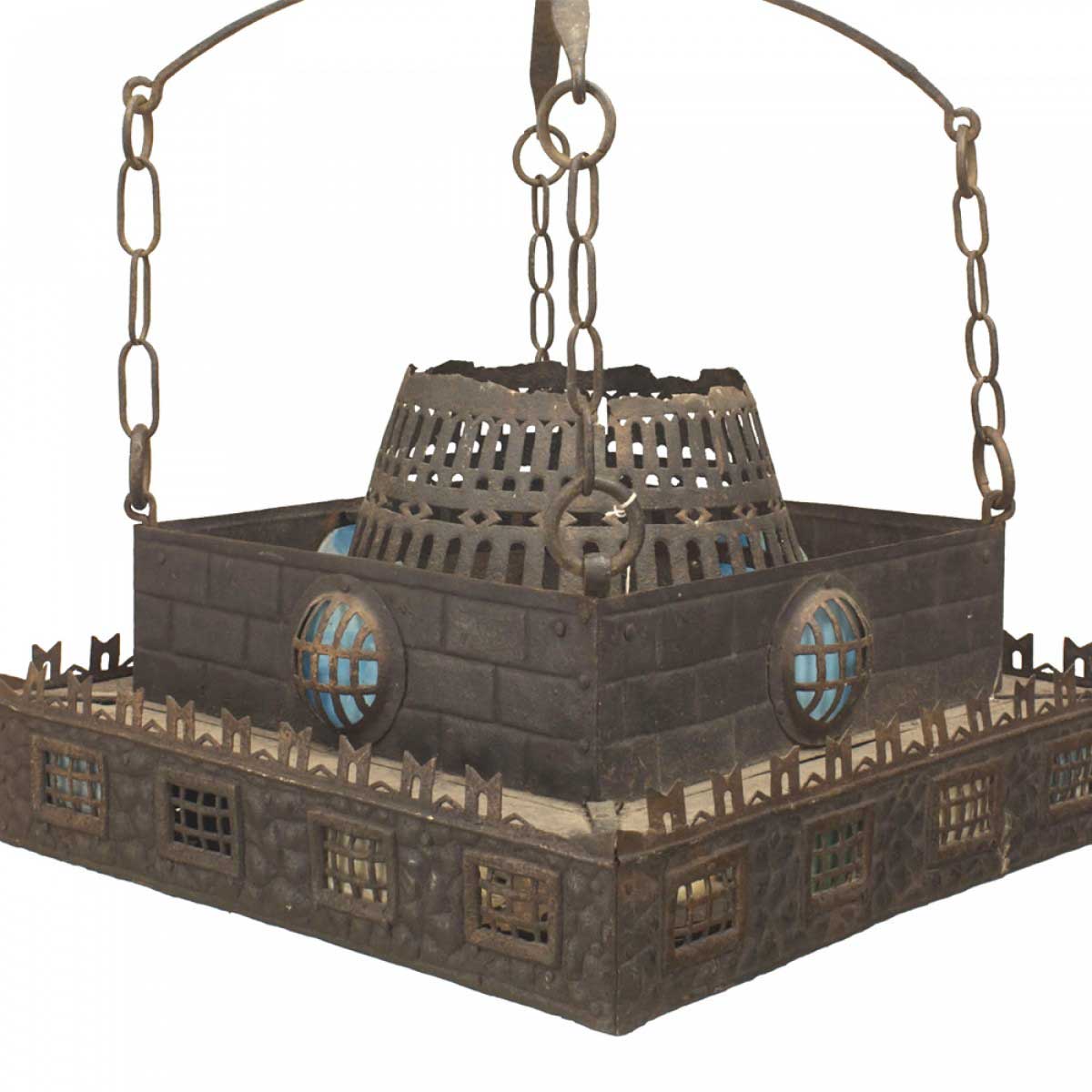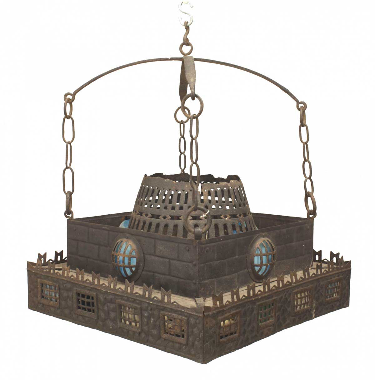 Continental German (1st Quarter 20th Century) wrought iron square chandelier with filigree design and stained glass panels suspended by 4 chains.