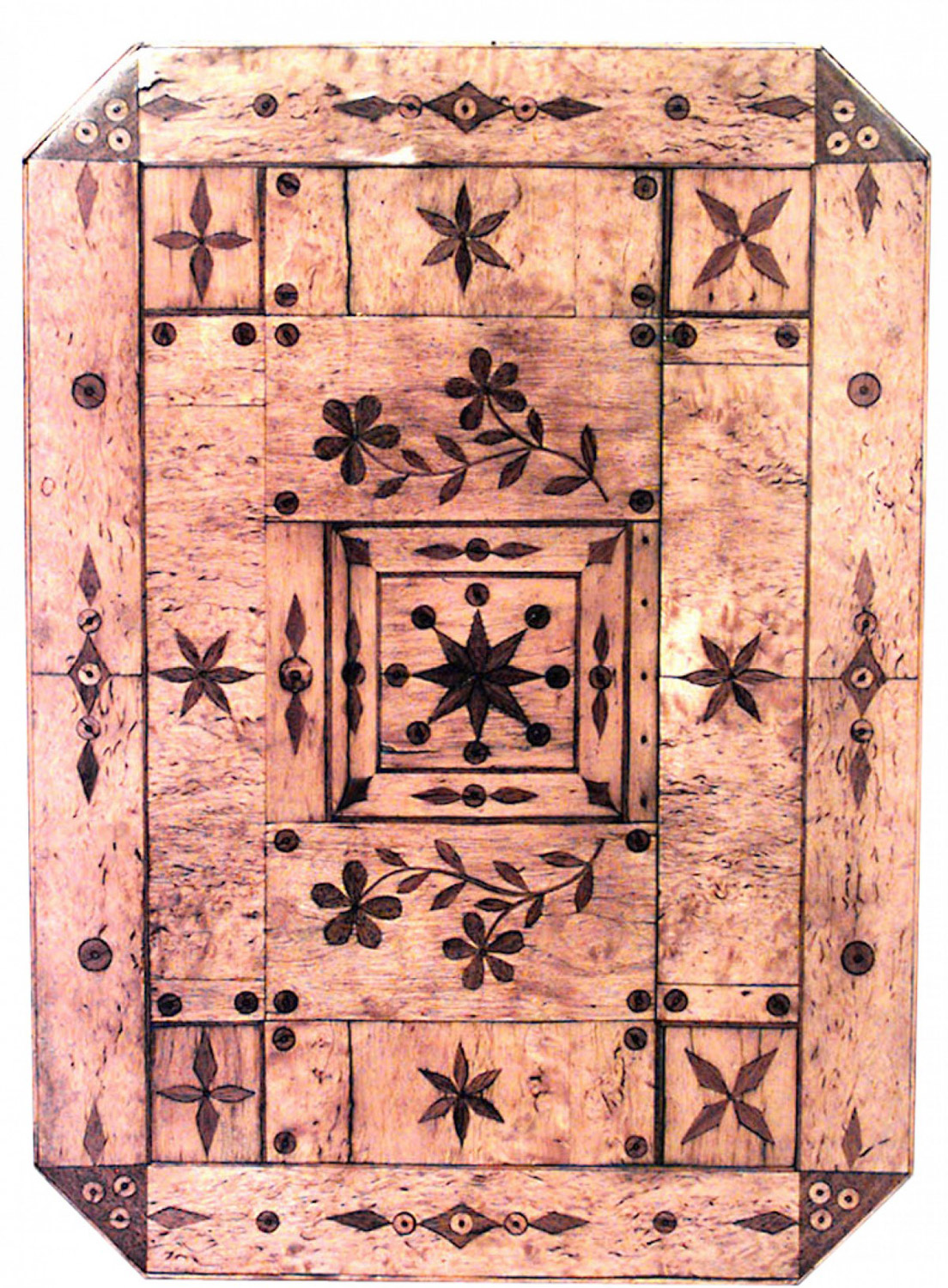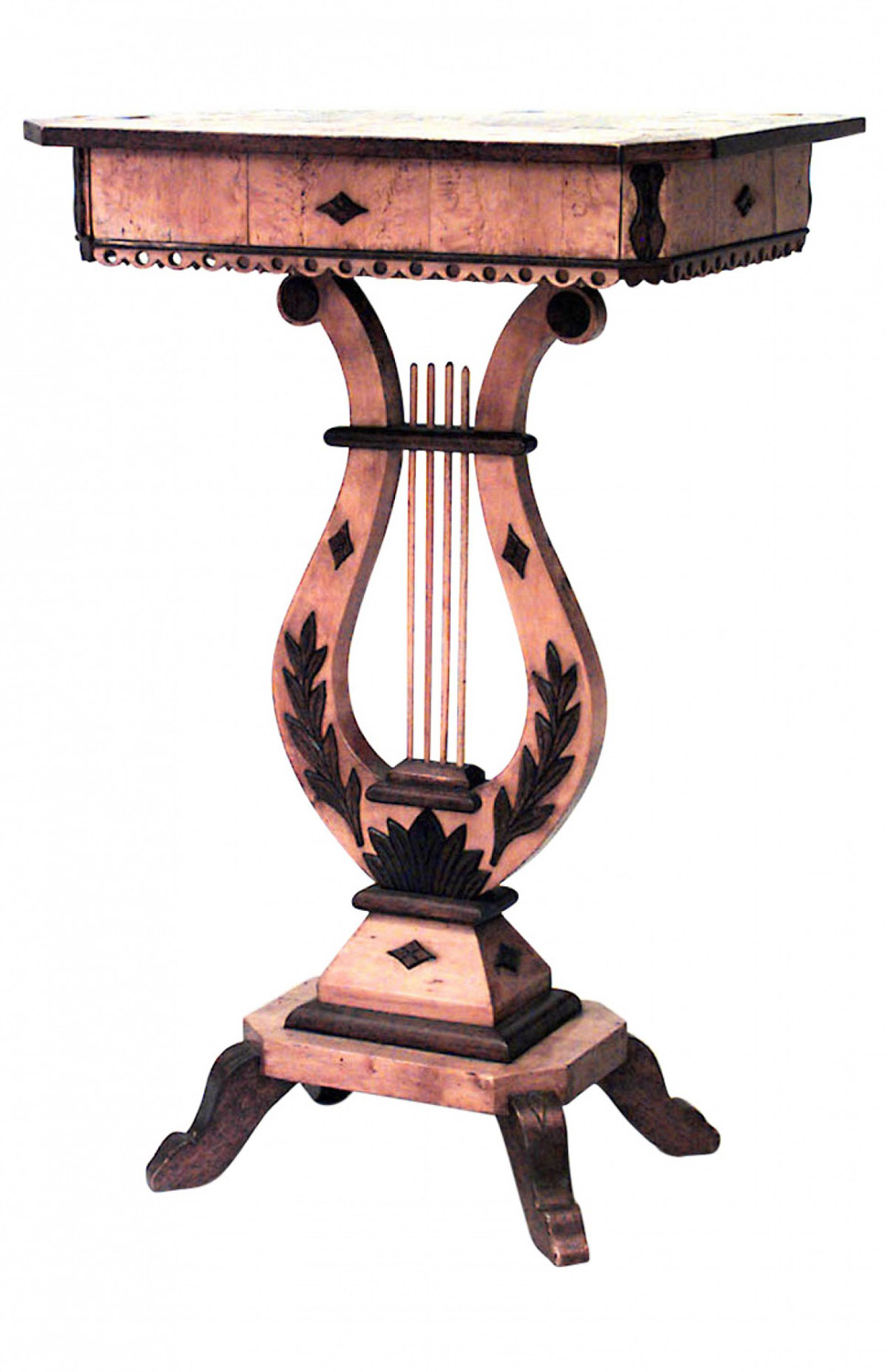 Continental Neoclassic Karelian (Circa 1820 and later embellished) birch, mahogany & parquetry side table with a frieze drawer on a lyre form stem.