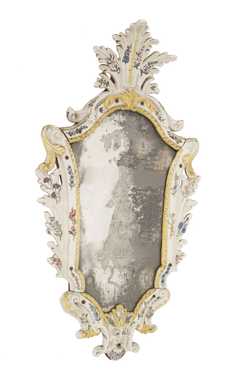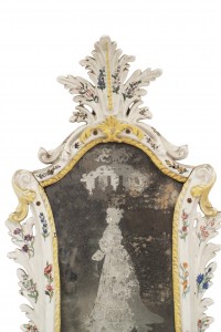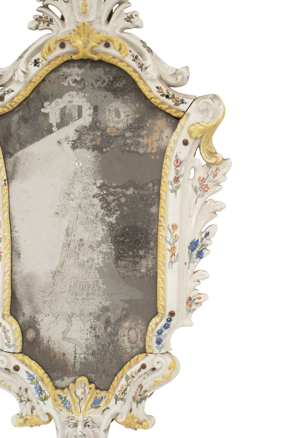 Continental (possibly German, 19th Cent) white porcelain keystone-shaped wall mirror with yellow trim and floral decoration with a floral pediment and a figure etched into the glass. (Similar to: VCG004)