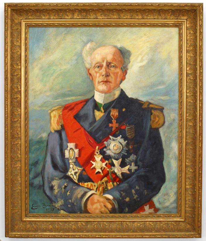 Copy of a portrait painting of an Admiral in blue dress uniform with red sash full of medals