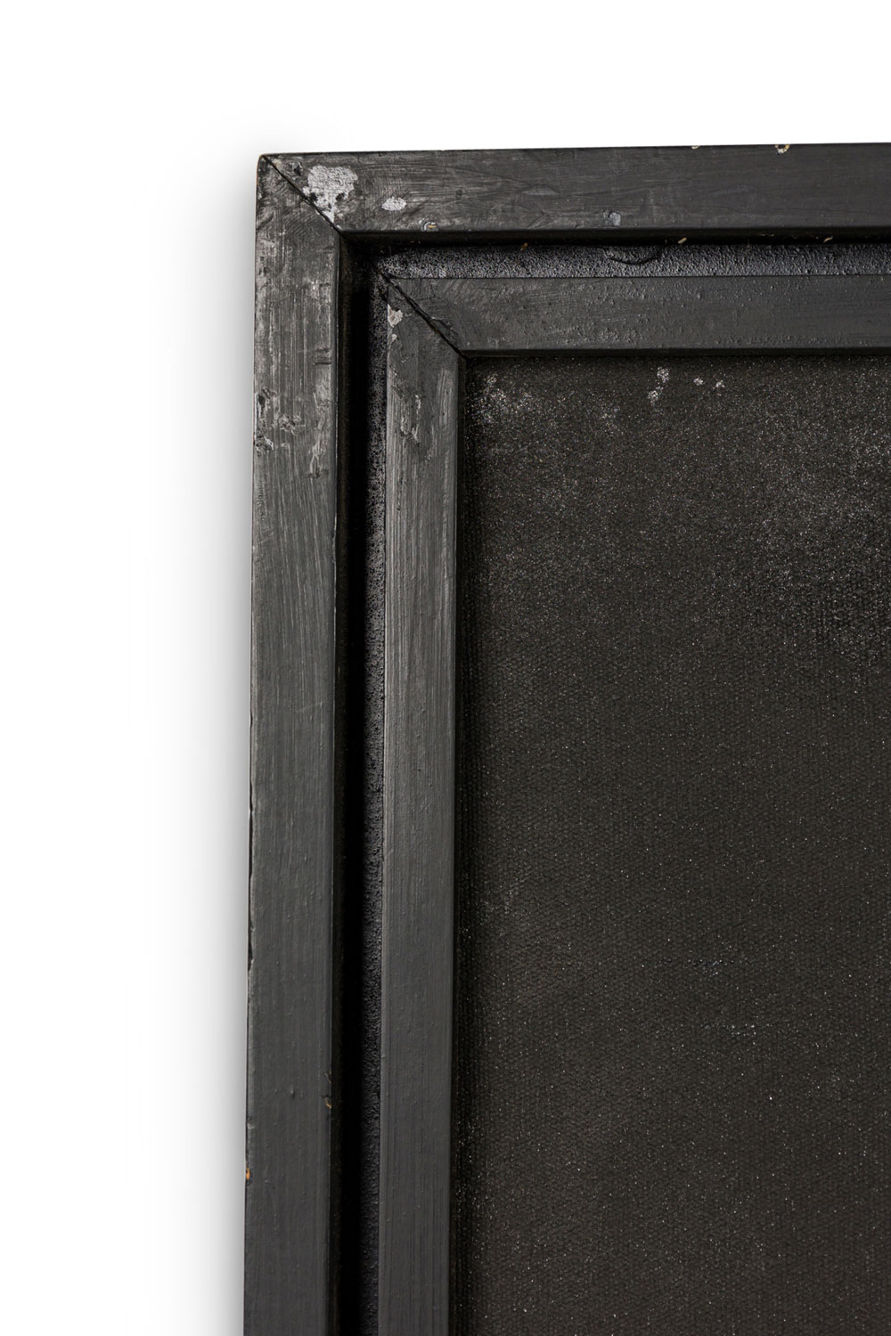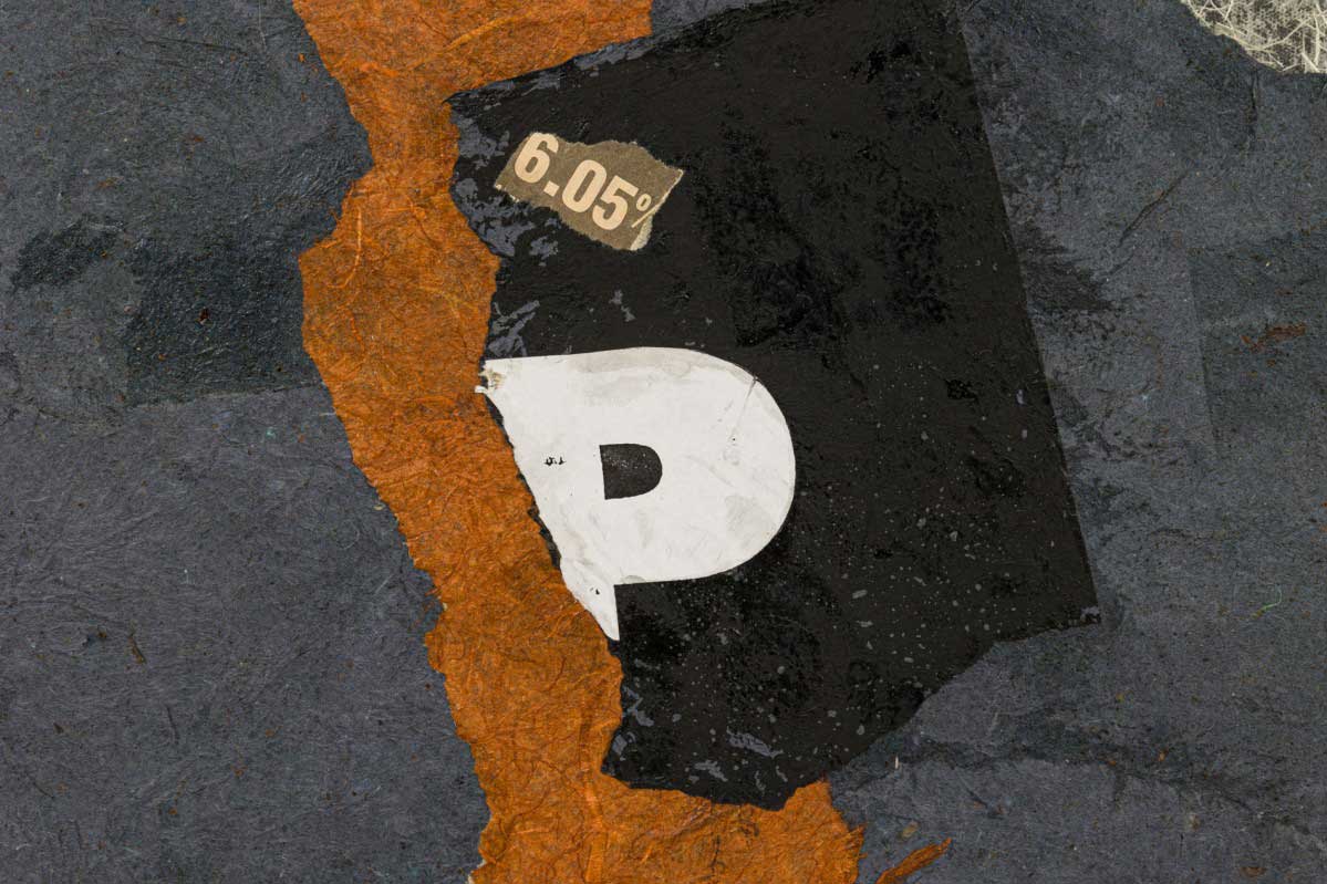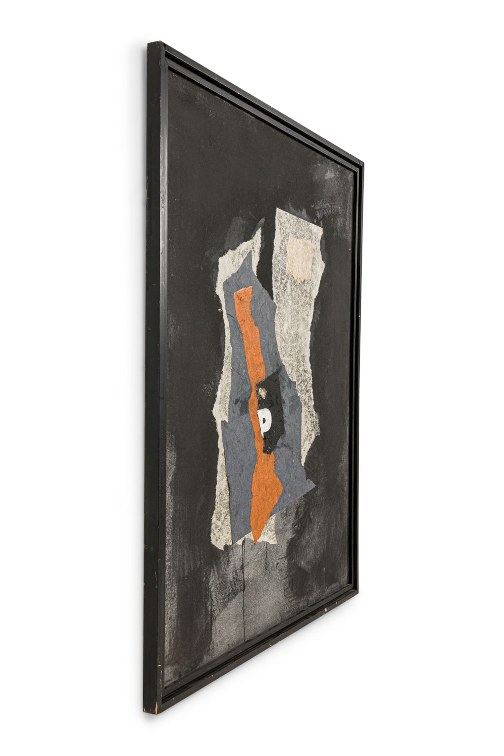 Copy of Abstract multimedia painting having a black ground with collage in grey, yellow, umber and black collage, partial letters