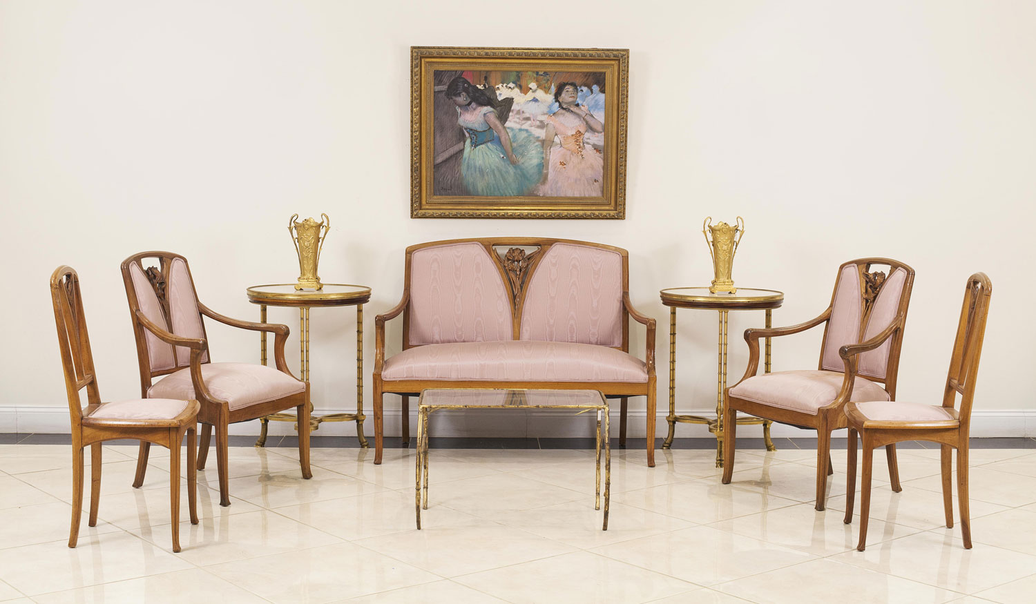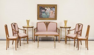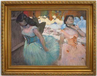 Copy of impressionist painting titled "Entrance of the Masked Dancers"showing two ballerinas in foreground with chorus line behind