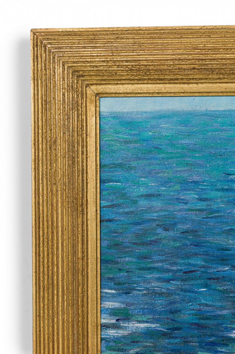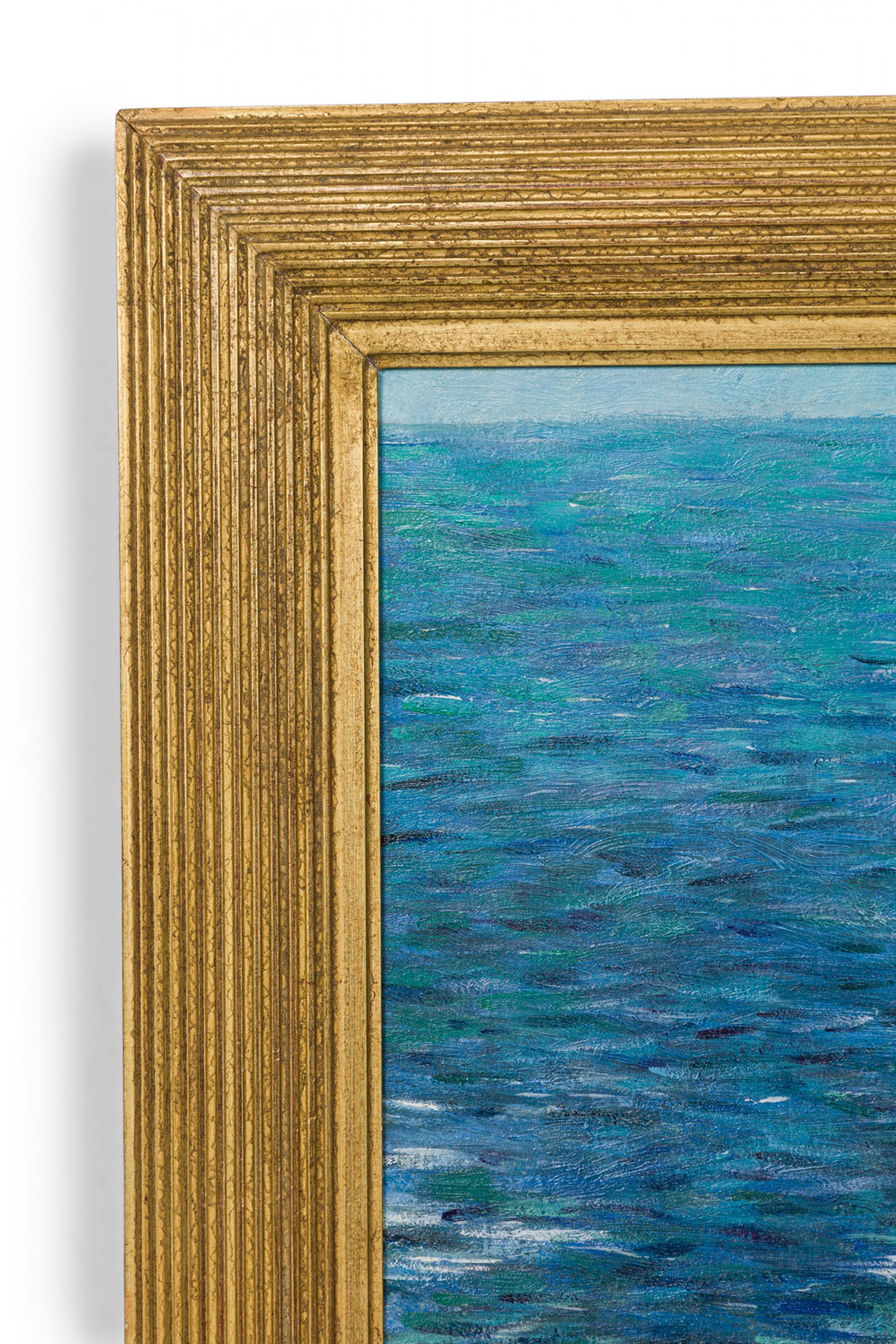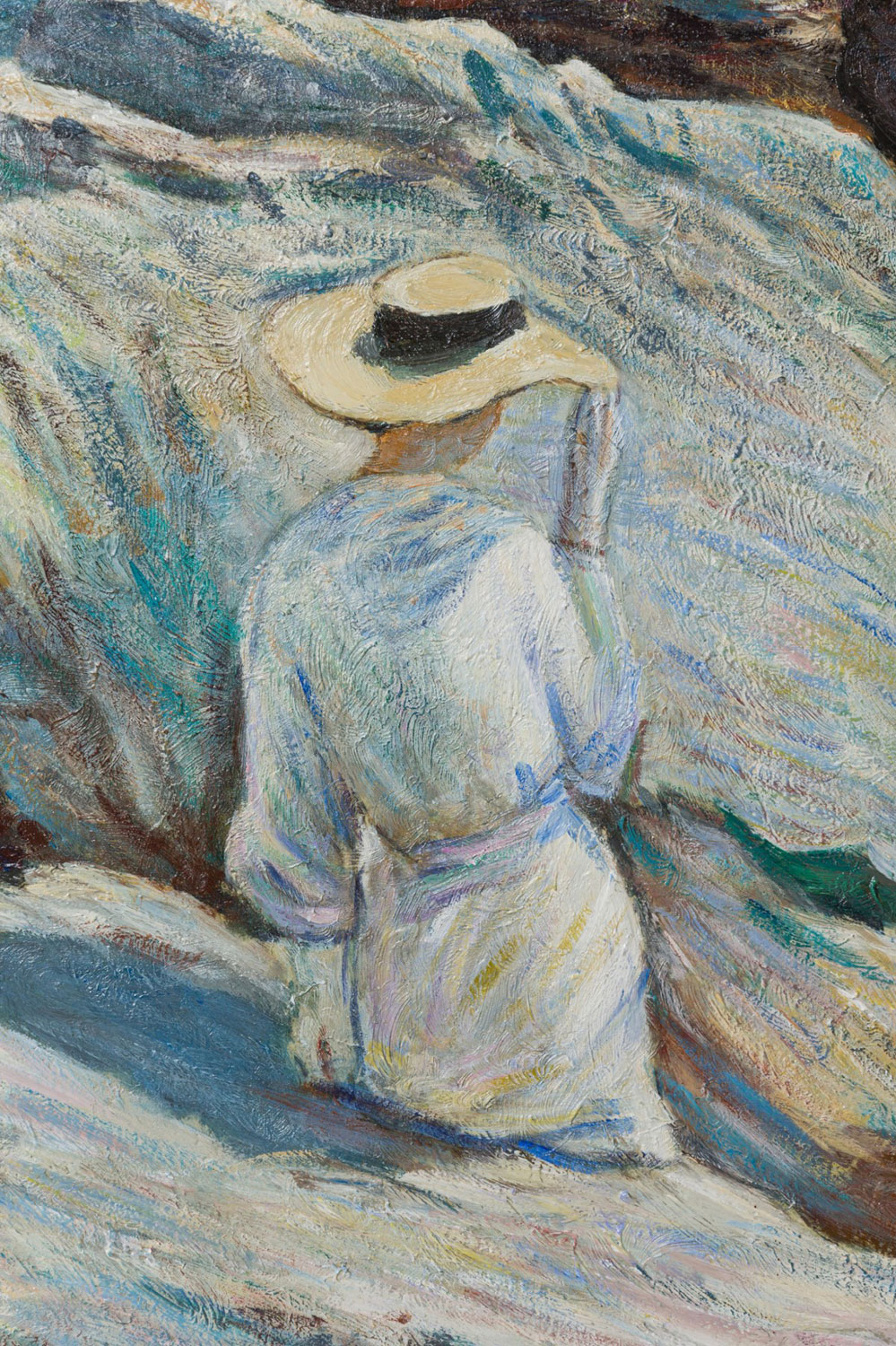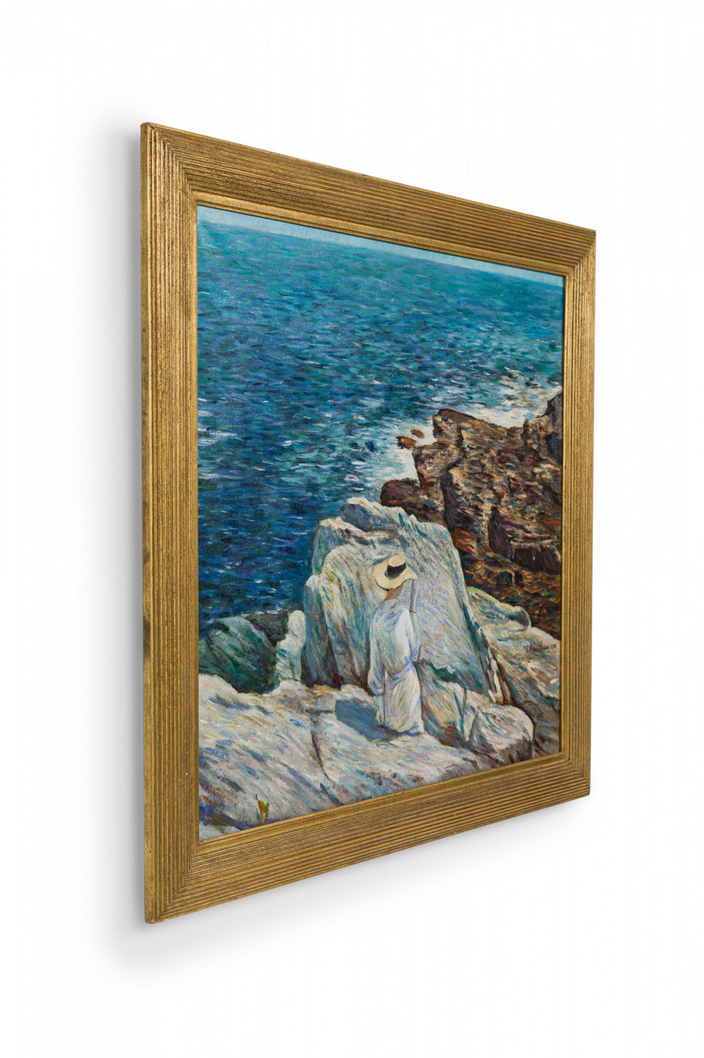 Copy of a lsndscape painting titled "The South Ledges" showing a woman in Victorian garb sitting on a rock looking out to sea