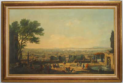 Copy of a landscape painting titled "The Town and Harbour of Toulon" showing expansive view from courtyard with people, horses, and dogs by the sea