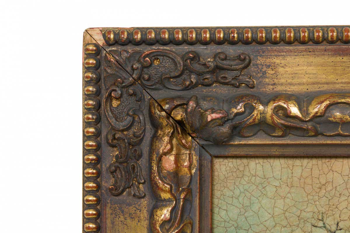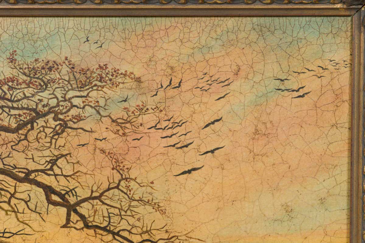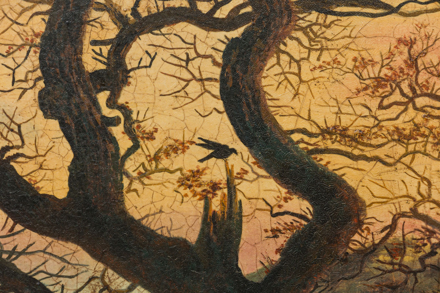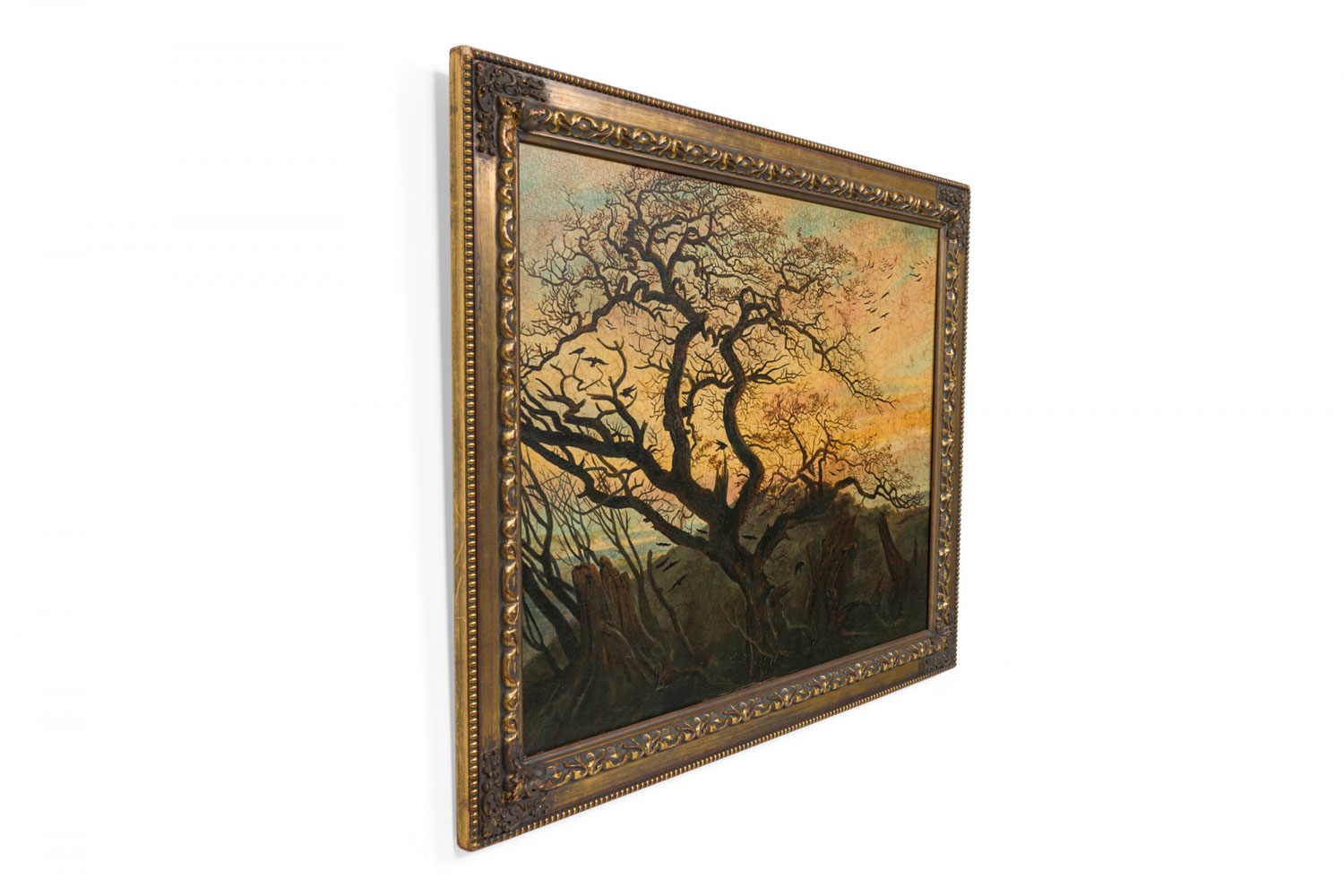 Copy of a German Romantic style landscape painting titled "Tree With Crows" showing a bare tree with crows against a sunrise