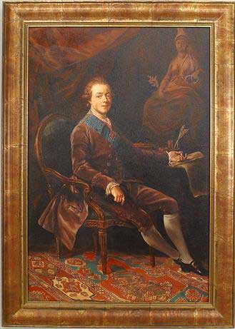 Copy of an 18th Century portrait of Russian royal Pavel Pavlovic in a brown suit showing him in seated at desk in front of statue of a lady with a simple dark gold frame