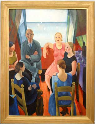 Copy of a portrait painting titled "The Stranger" showing a brightly rendered group of people sitting on chairs in a circle