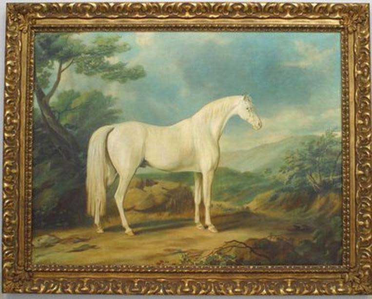 Copy of an animal portrait titled "White Horse" set in a classical landscape in a carved gold frame