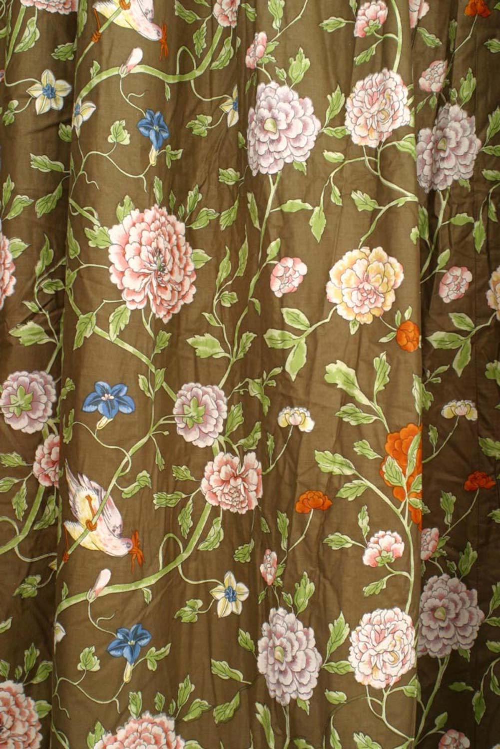 2 cotton drapes with flowering vine "chintz" pattern on a slate green ground (PRICED EACH).