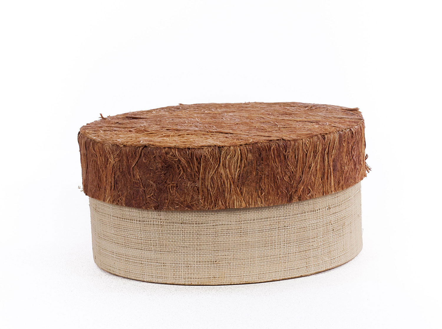 Cylindrical sturdy cardboard box with a light burlap veneer on the body, and a sealed natural fiber- covered removable top