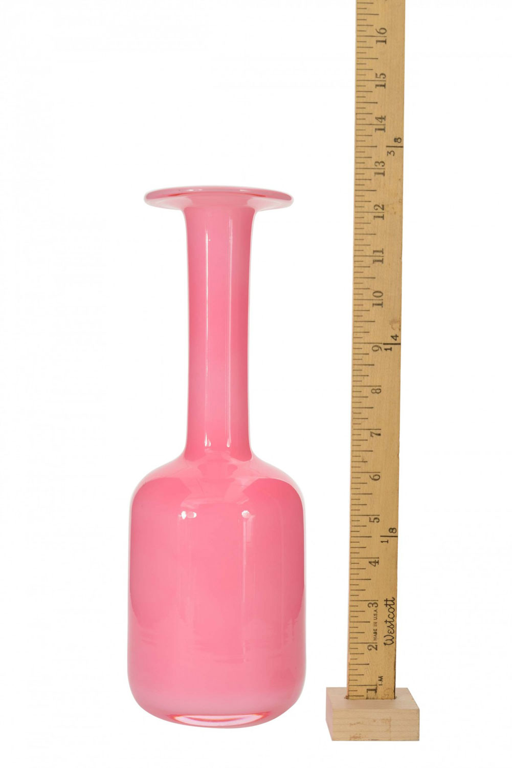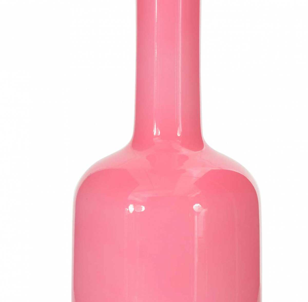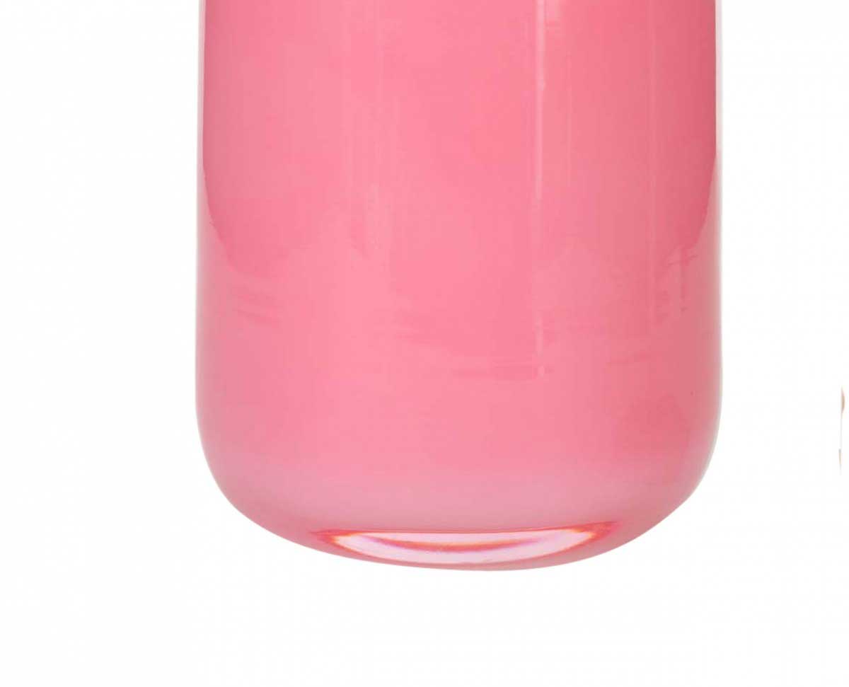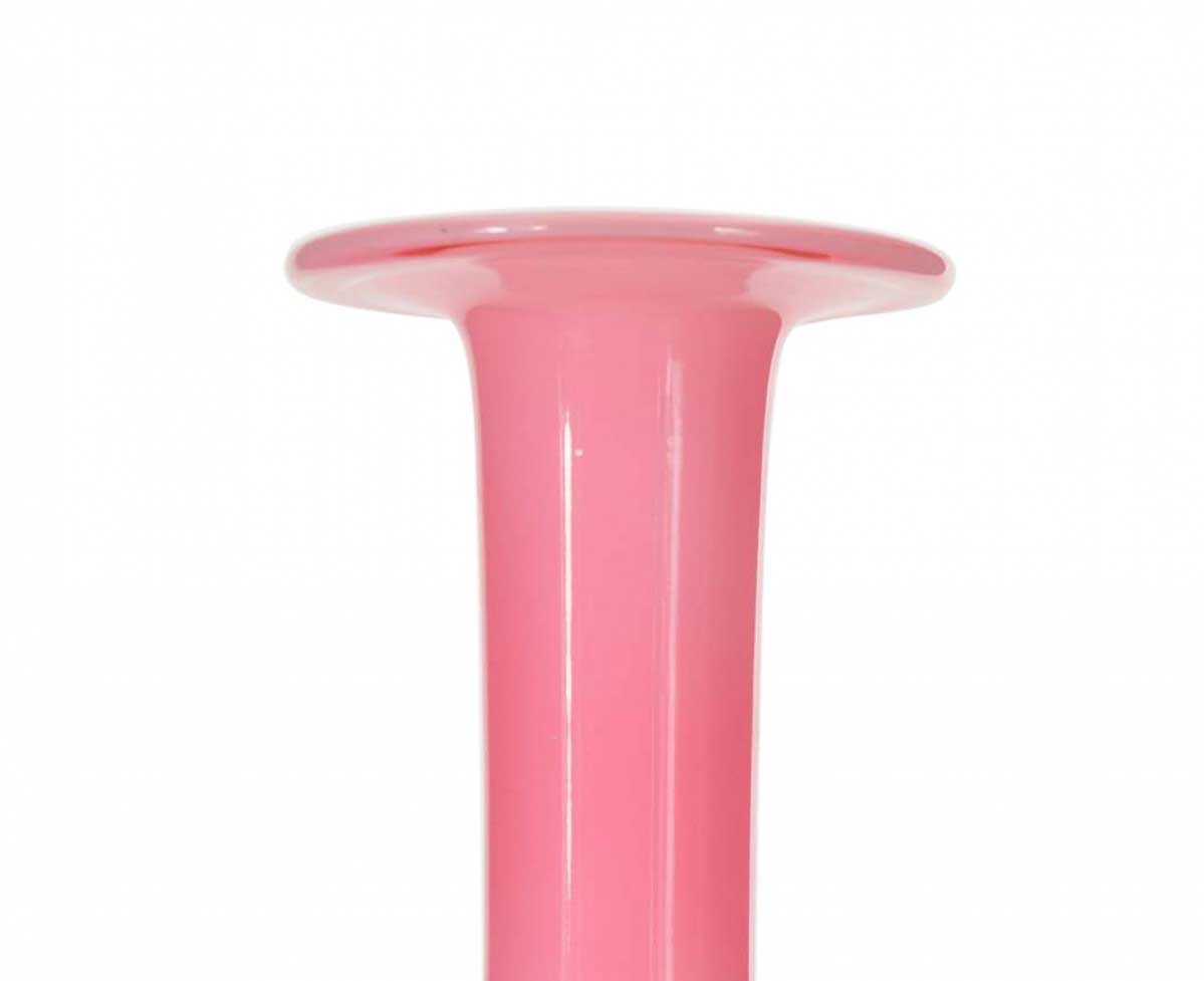 Danish Mid-Century Modern bottle-shaped pink and white case glass vase with a long cylindrical neck and a wide, flat rim
