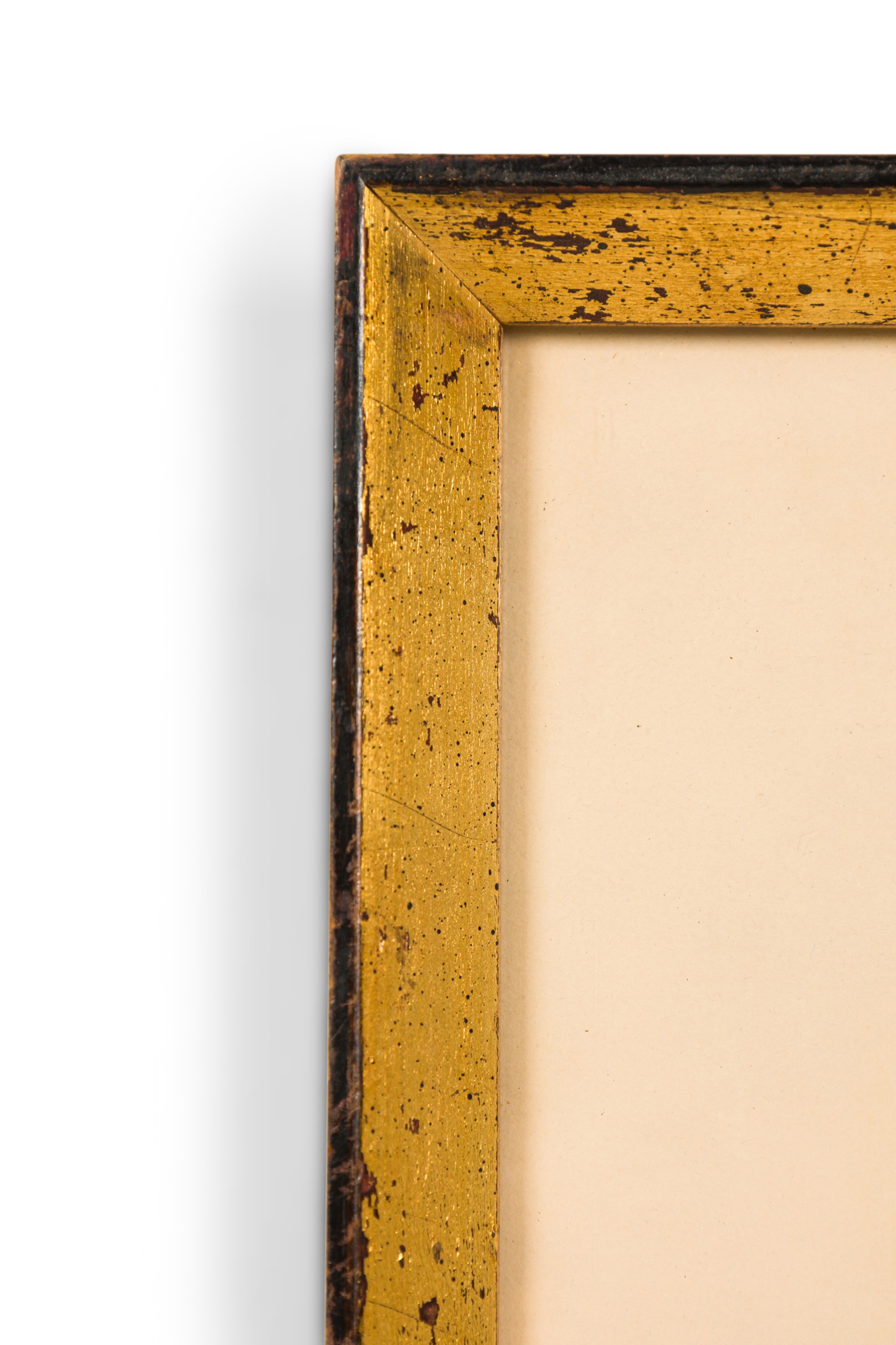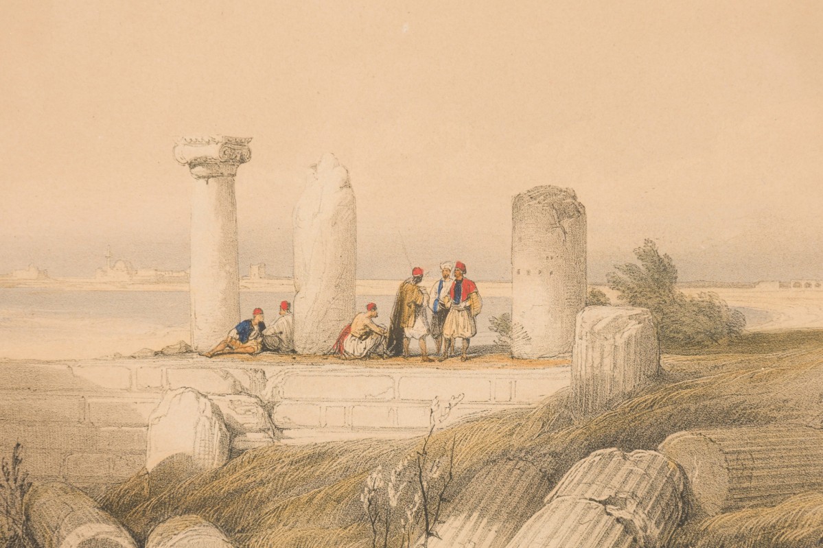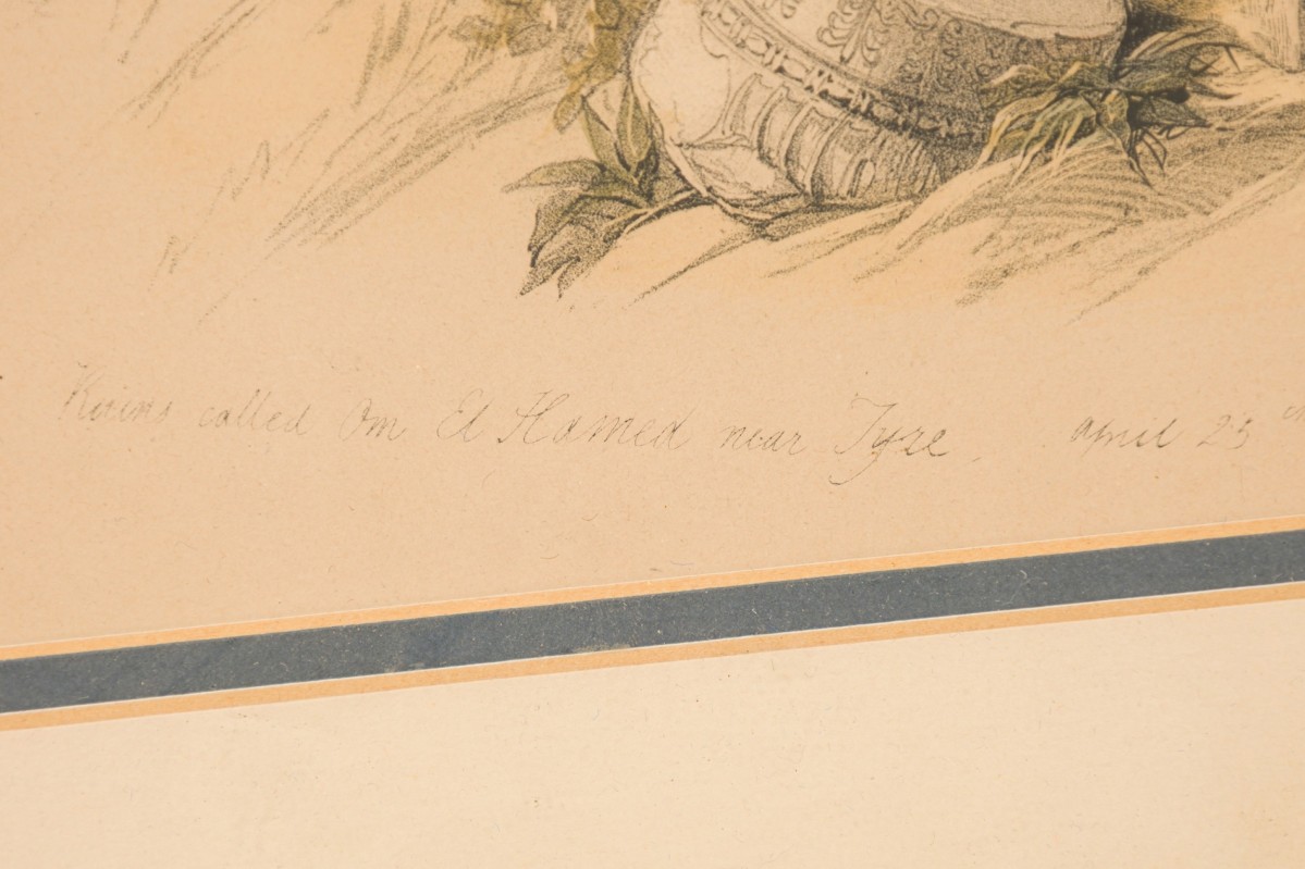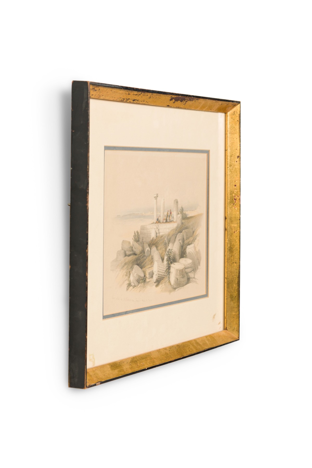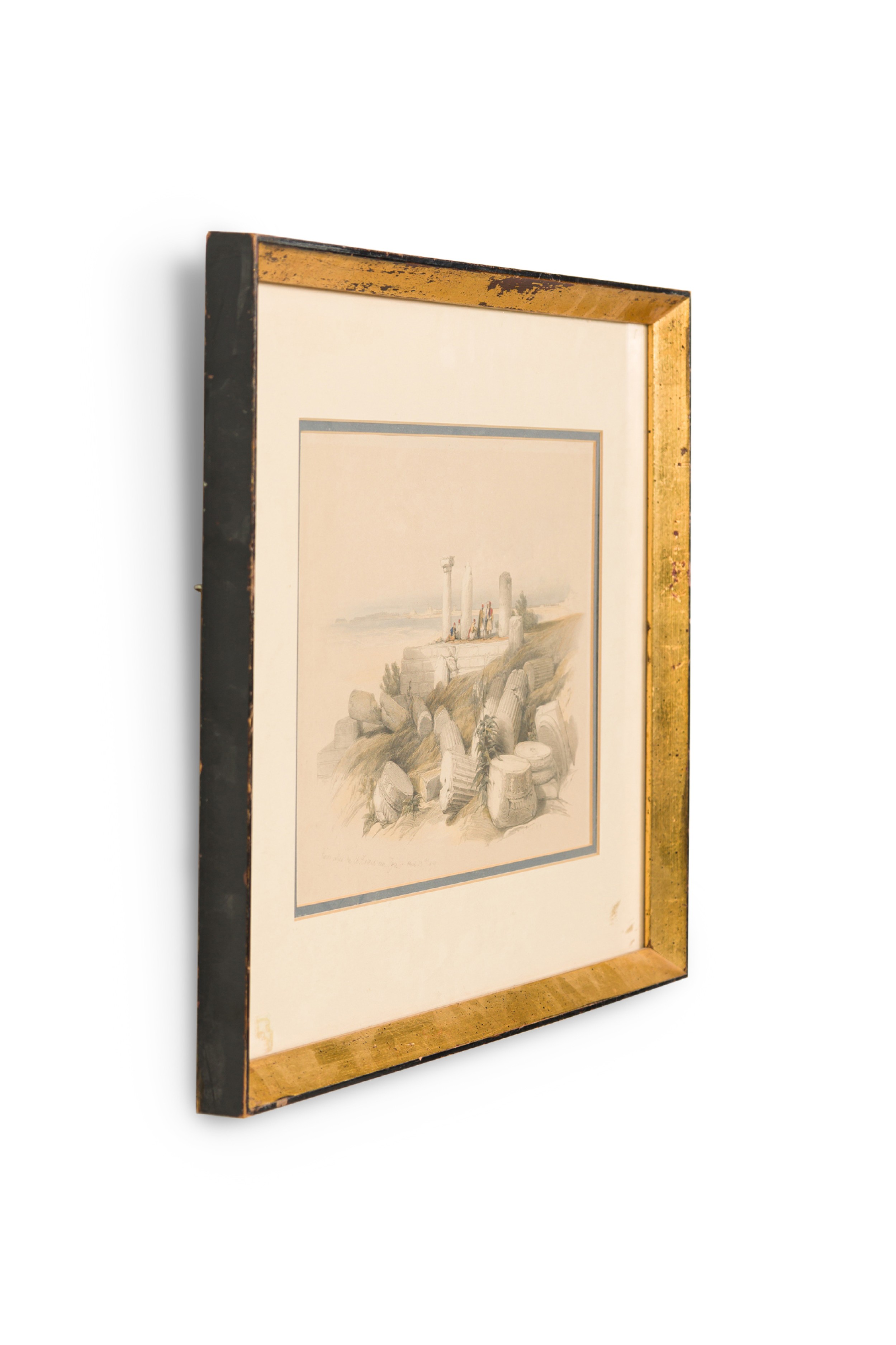 English Georgian (1st half 19th Century) gilt framed colored lithograph of a group of Moorish men on a hillside by ancient damaged stone pillars (titled: Ruins Called Om El Hamed Near Tyre April 25, 1839) (DAVID ROBERTS) (companion to REG9009)