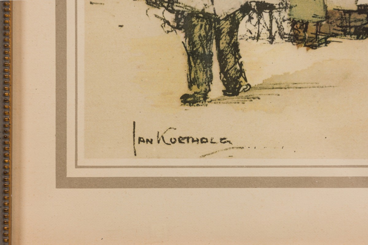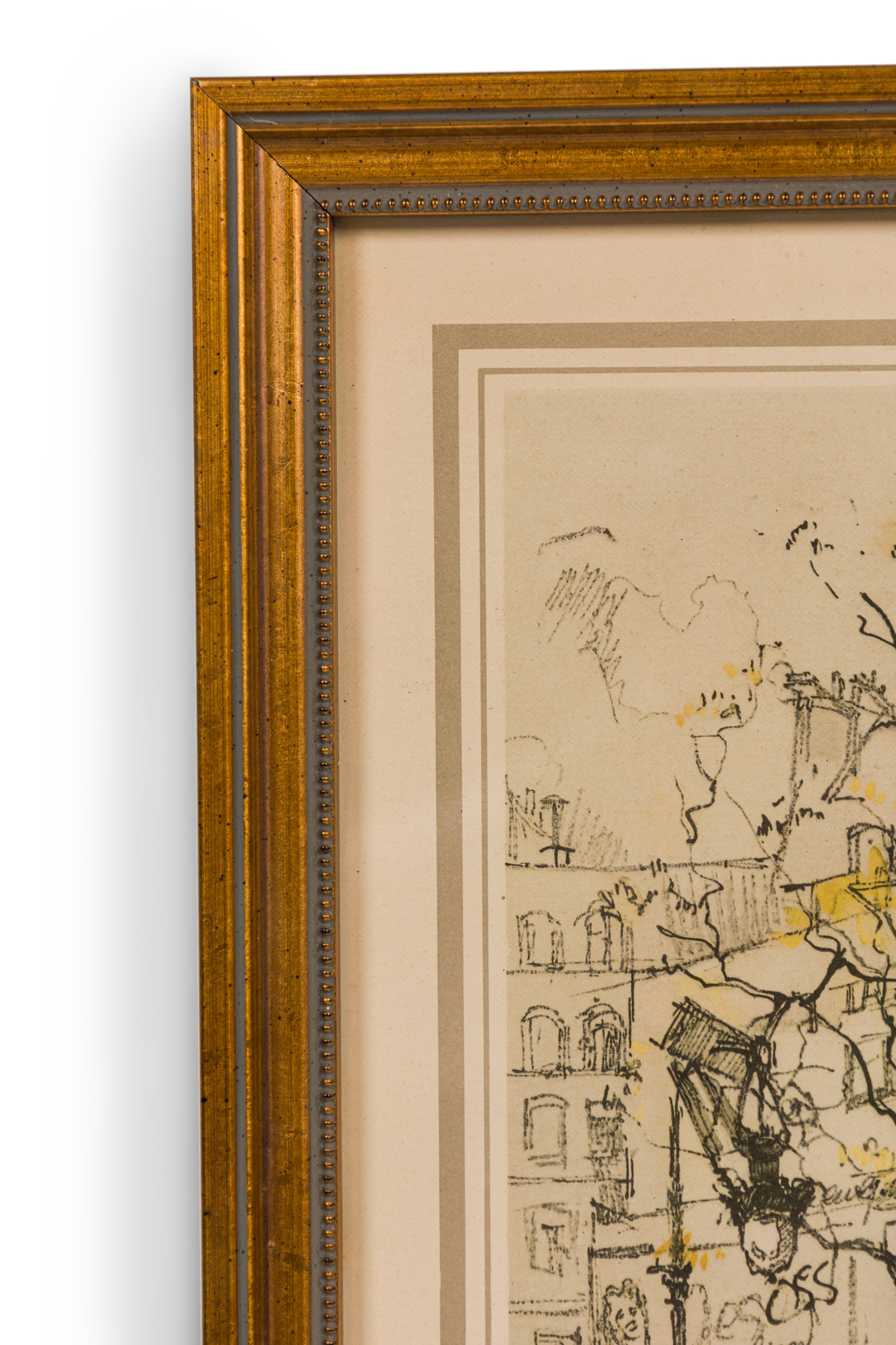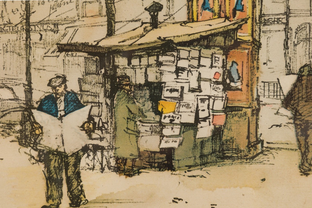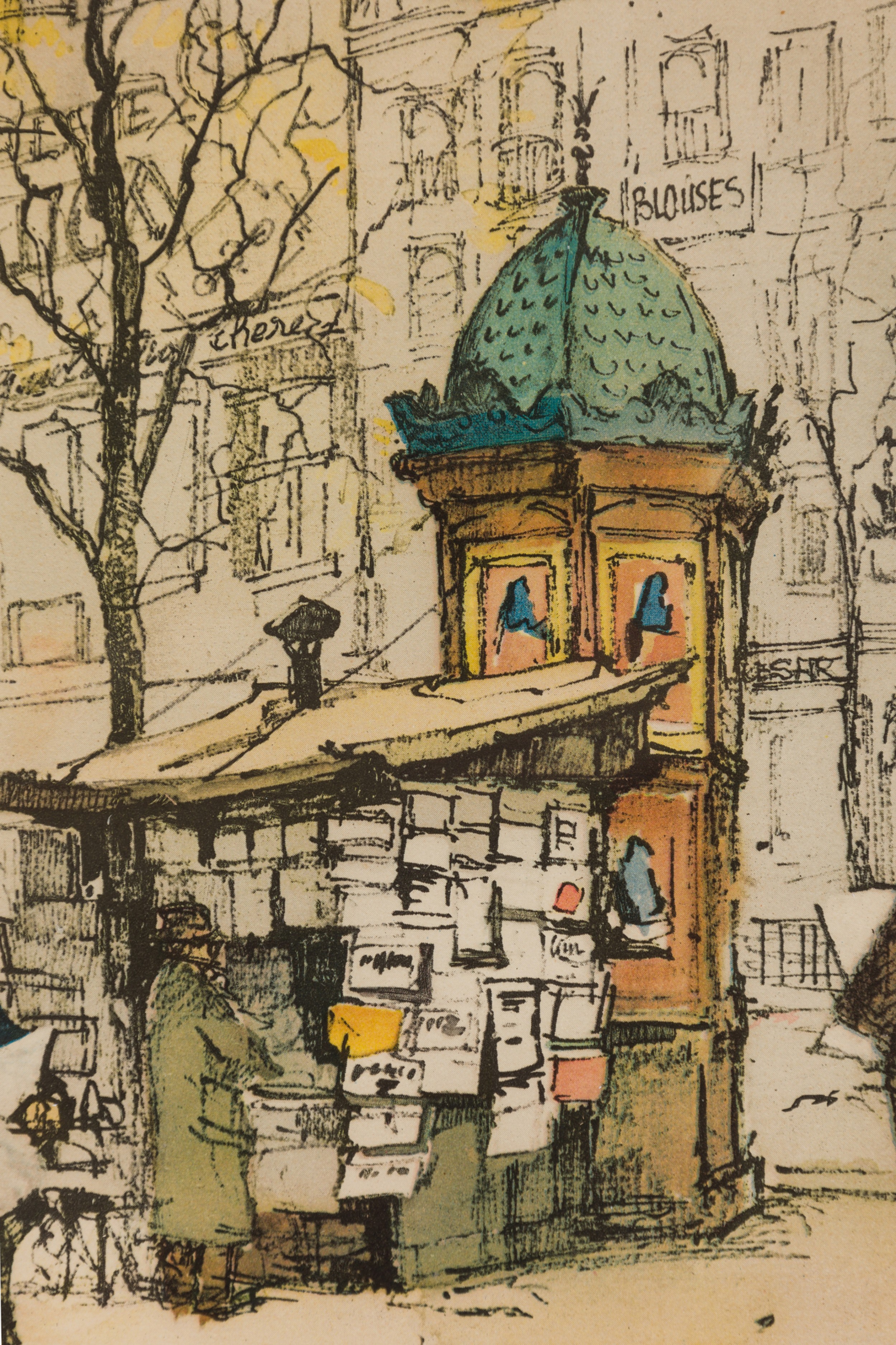 Mid-Century framed Impressionist genre scene print of a Parisian street featuring people walking pass a news stand, a building structure with a green roof (similar to NWL7294B, NWL7294C, NWL7294D)