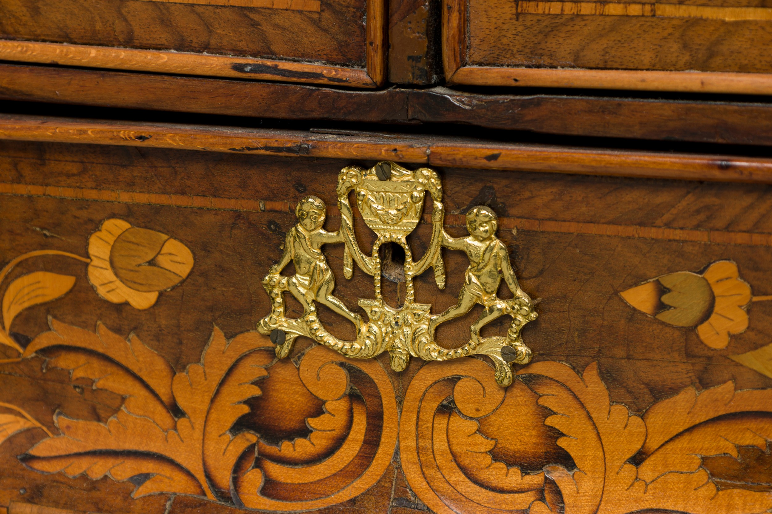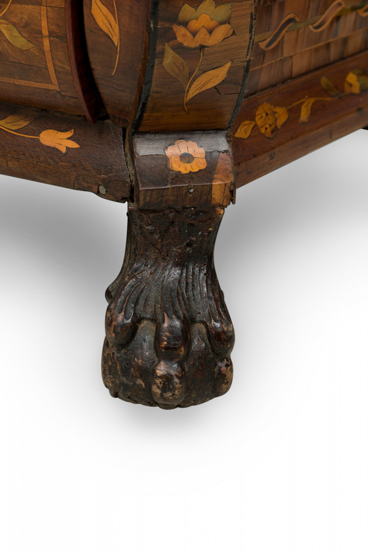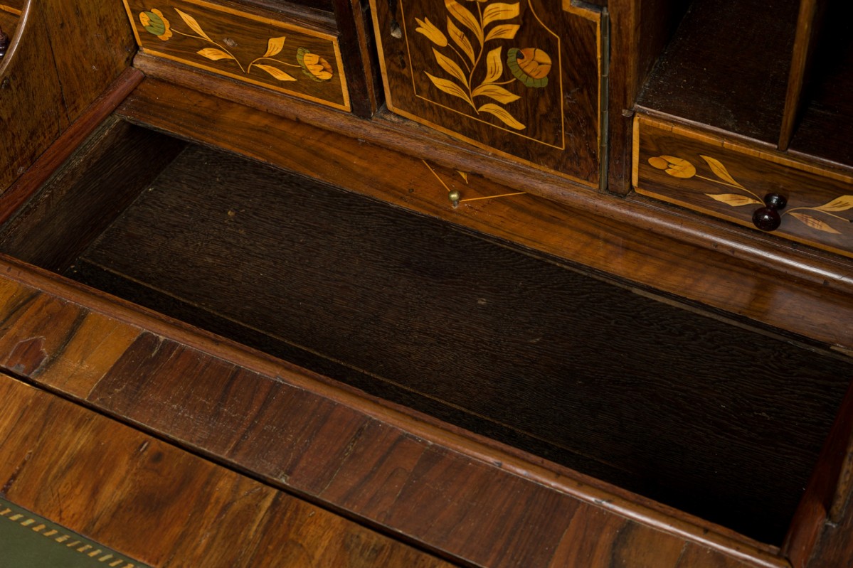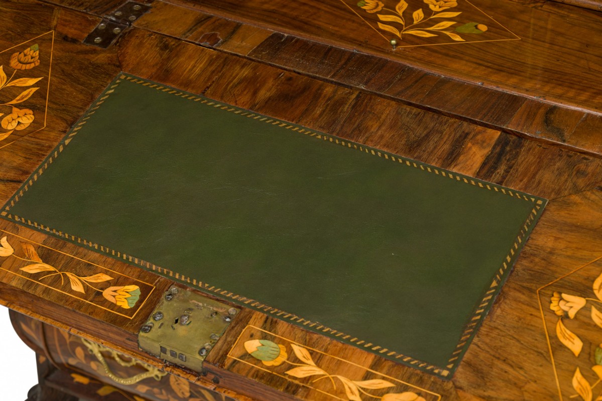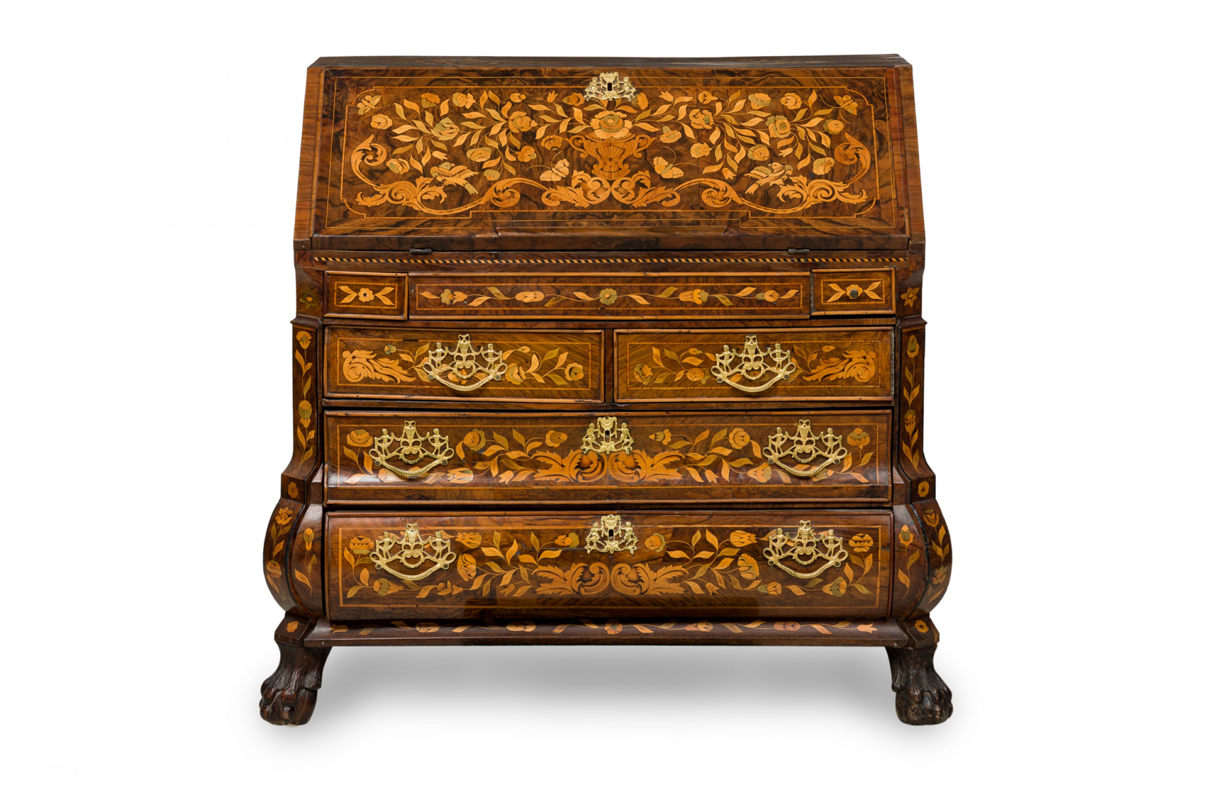 Dutch Rococo (Late 18th Century) drop front desk / secretary with elaborate foliate marquetry inlay, with the slant front opening to a desk with a green leather inset surface in front of a series of small drawers and compartments, over four lower drawers mounted with elaborate brass drawer pulls and resting on carved paw feet.
