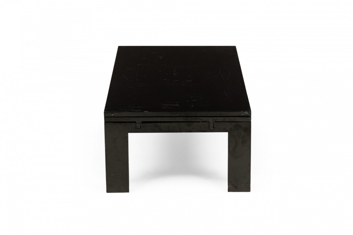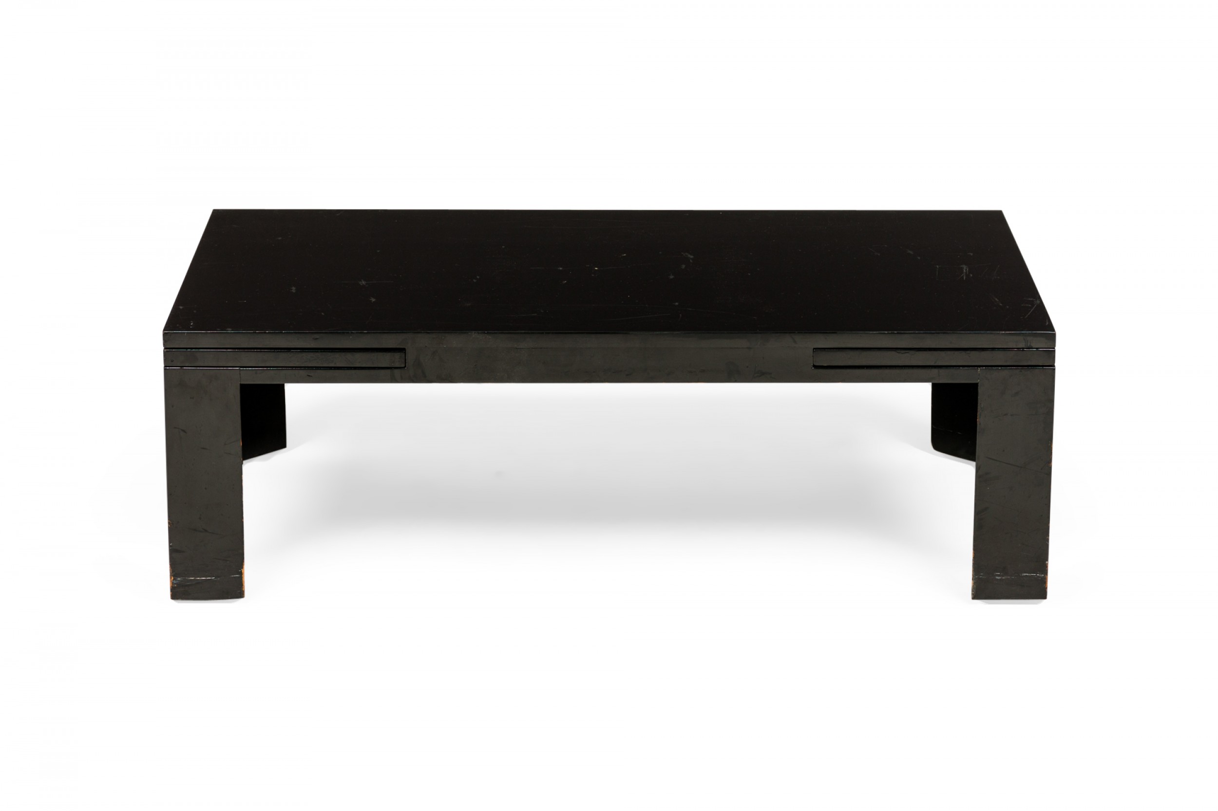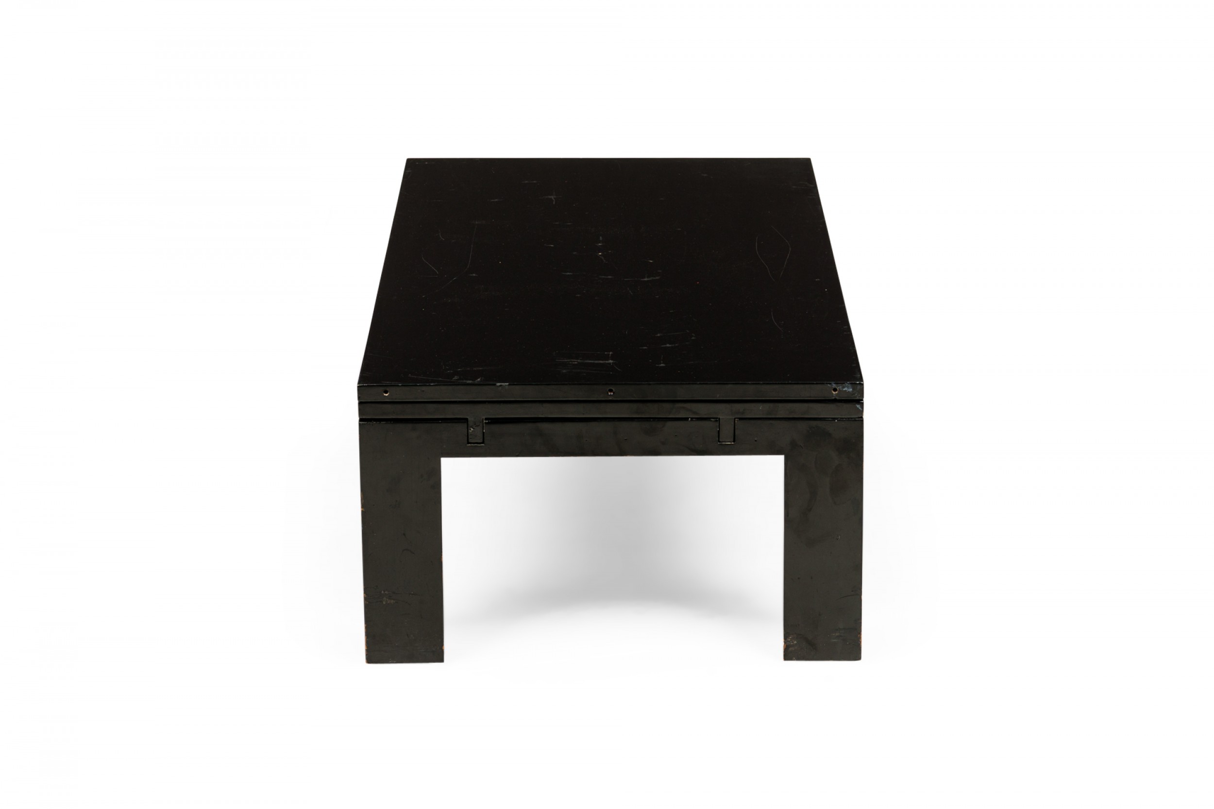 American Mid-Century black painted wooden refectory coffee / cocktail table with a rectangular top and two concealed pull out leaves on either side. (Similar pieces: DUF0720, DUF0736)