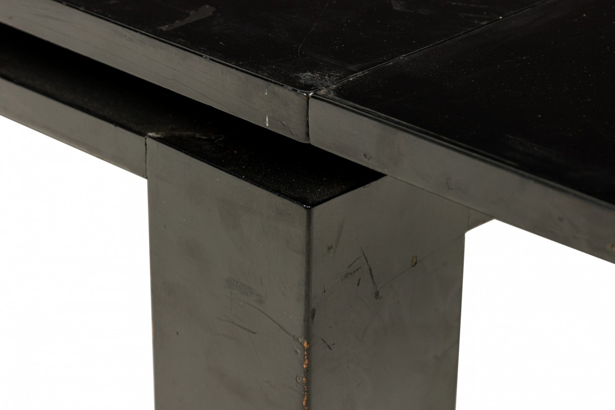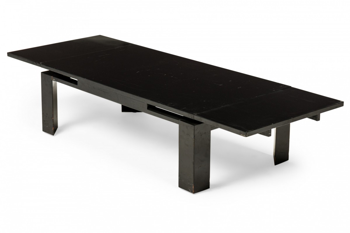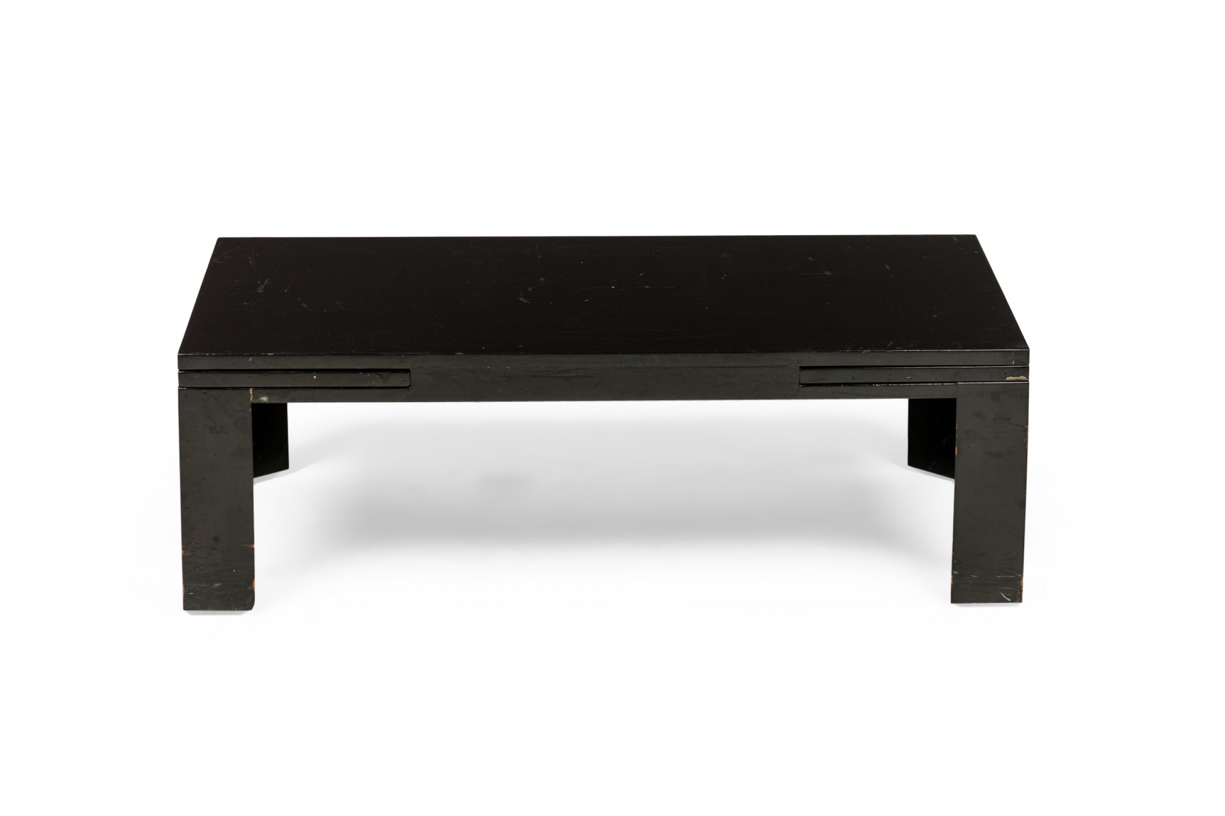 American Mid-Century black painted wooden refectory coffee / cocktail table with a rectangular top and two concealed pull out leaves on either side. (Similar pieces: DUF0720, DUF0736)