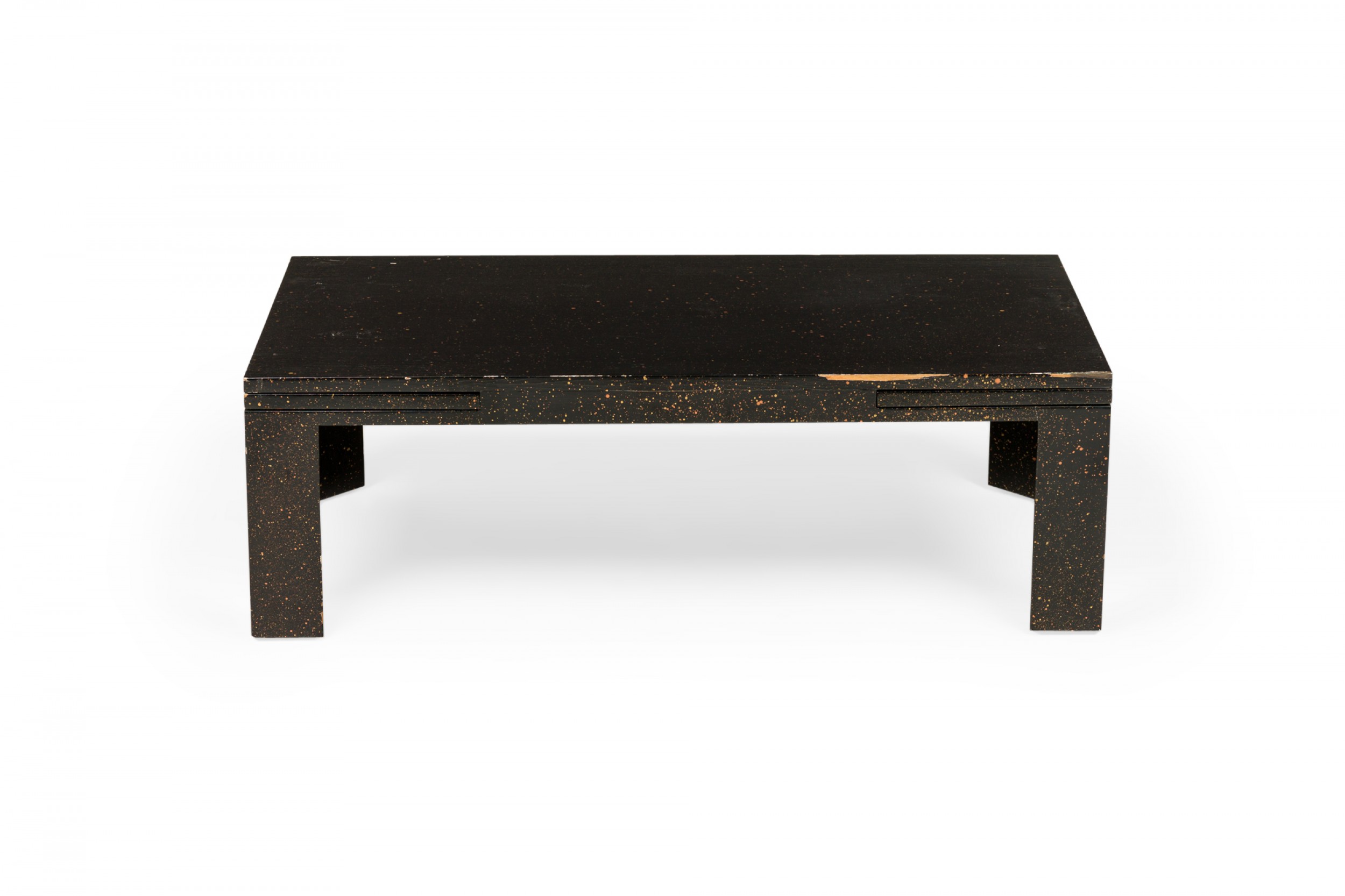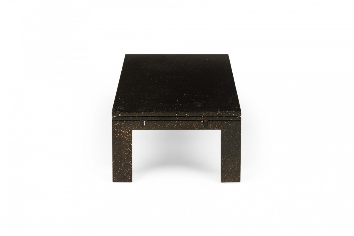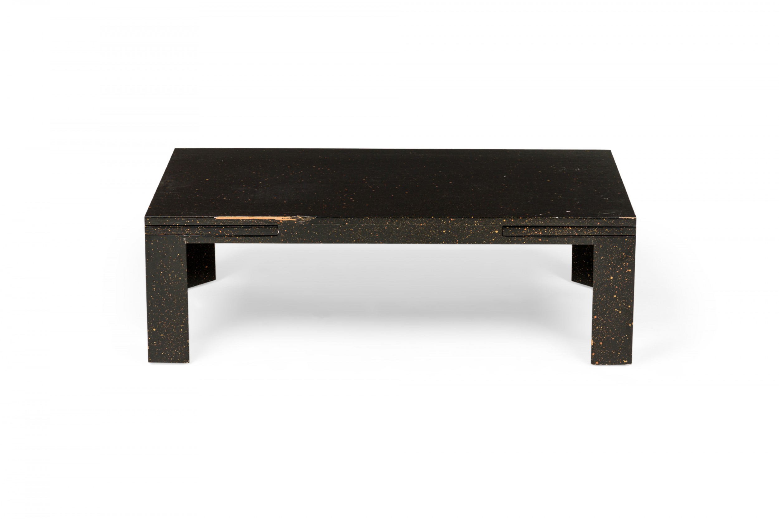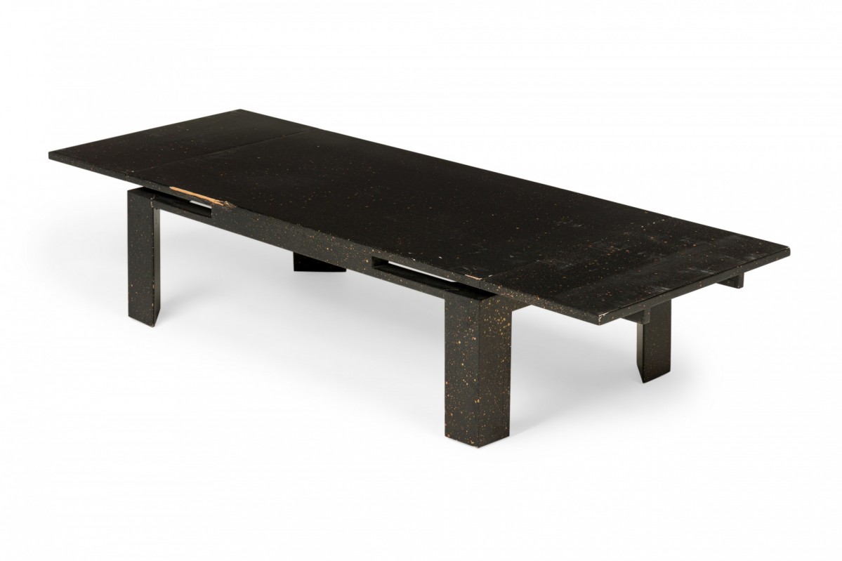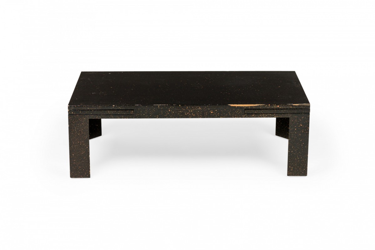 American Mid-Century black painted white speckled wooden refectory coffee / cocktail table with a rectangular top and two concealed pull out leaves on either side. (Similar pieces: DUF0720, DUF0737)