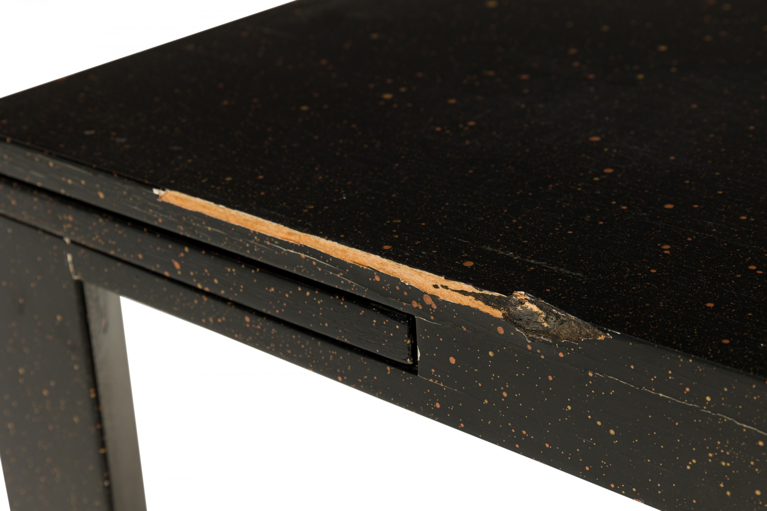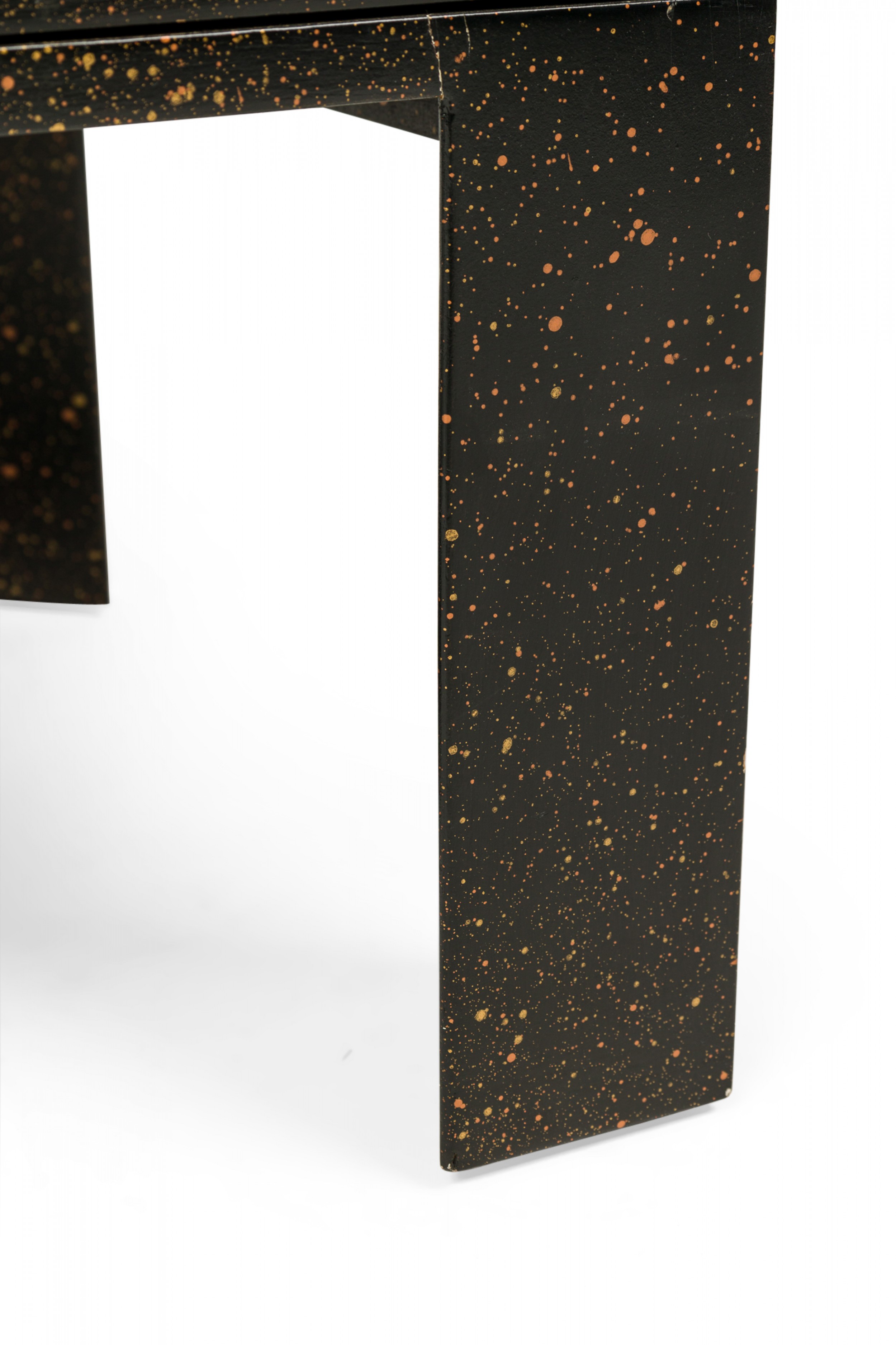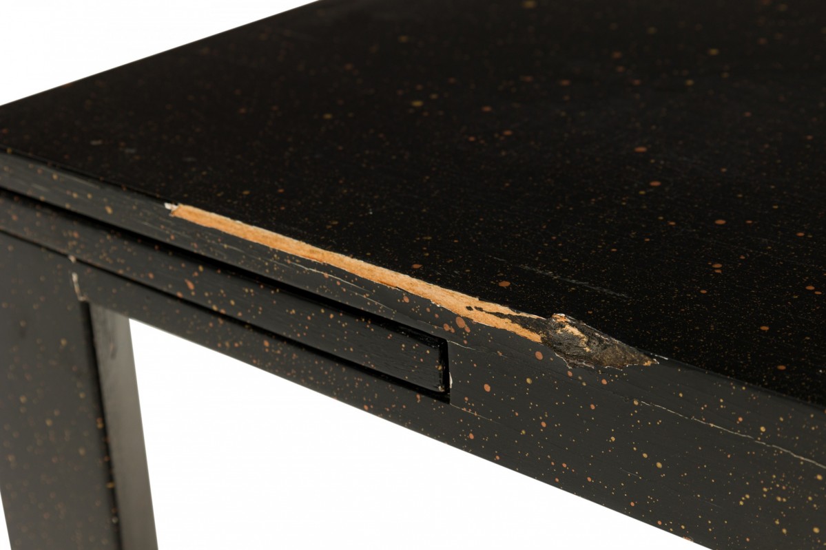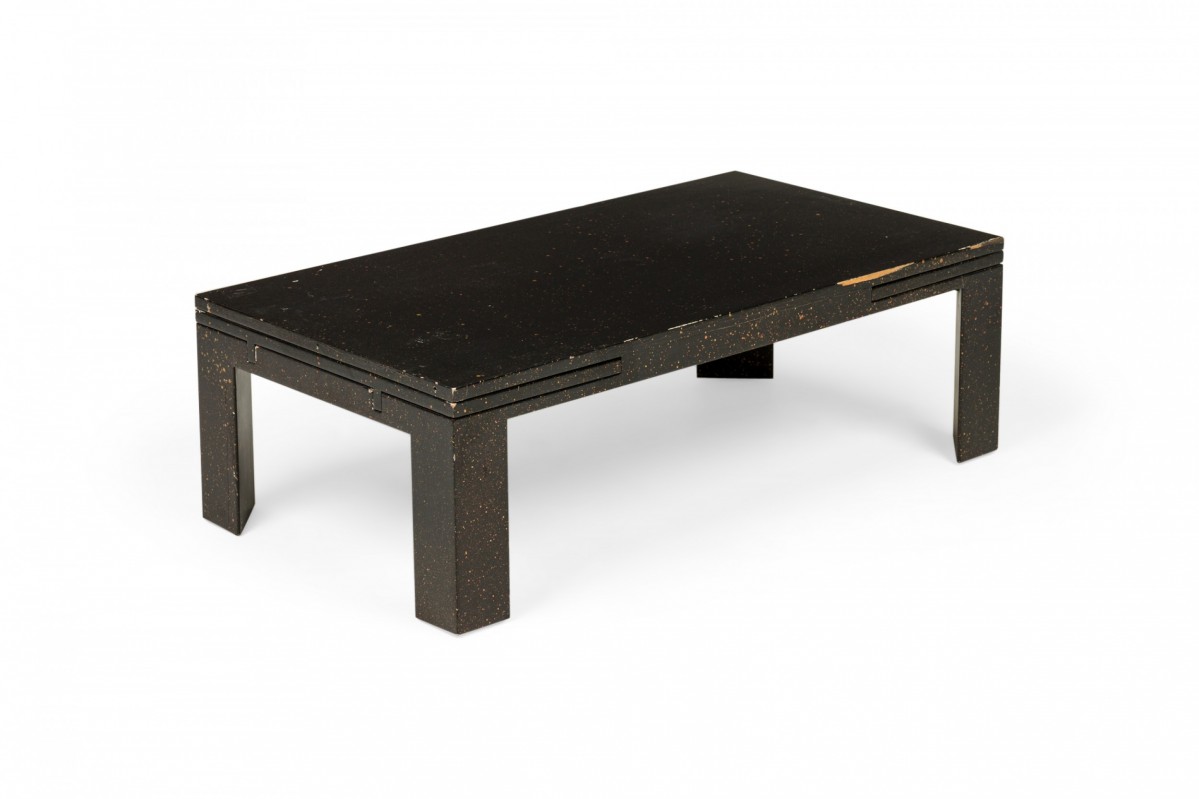 American Mid-Century black painted white speckled wooden refectory coffee / cocktail table with a rectangular top and two concealed pull out leaves on either side. (Similar pieces: DUF0720, DUF0737)