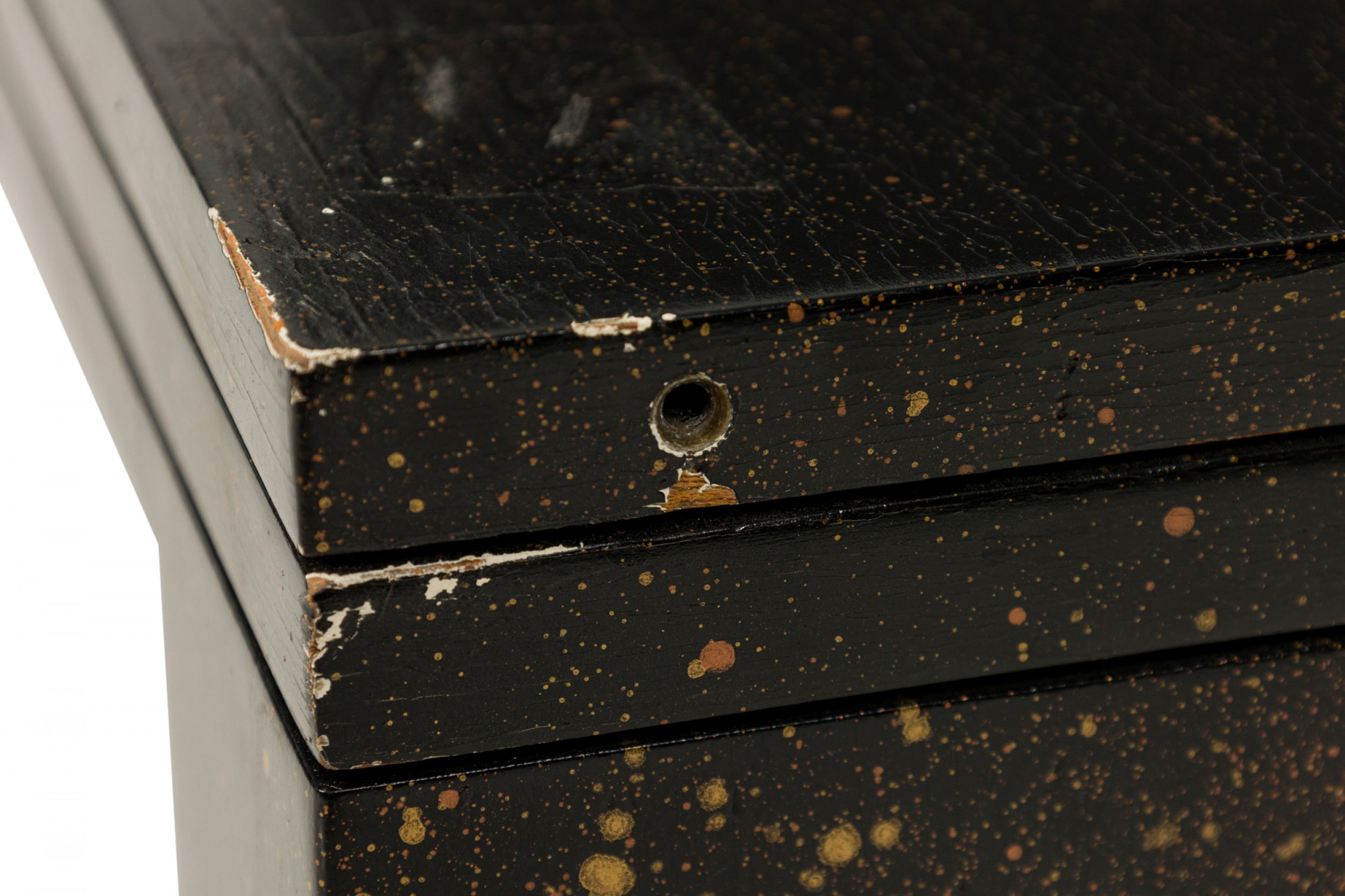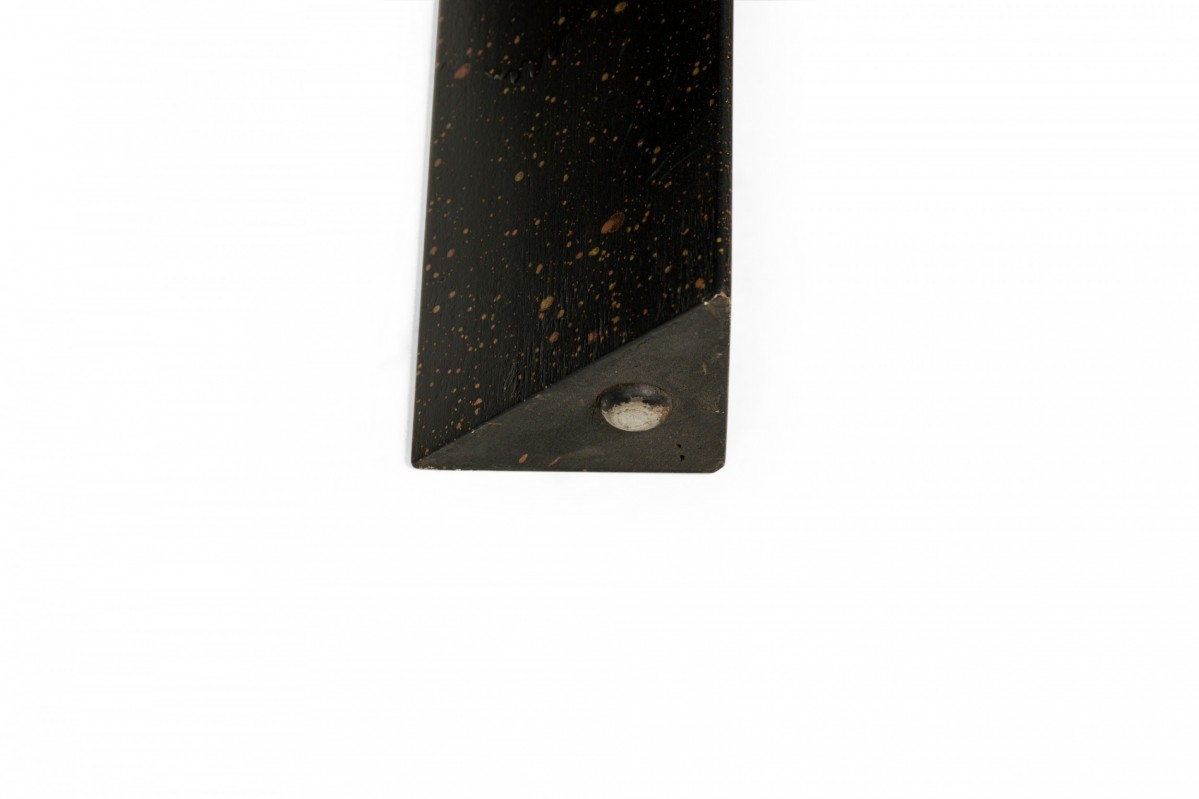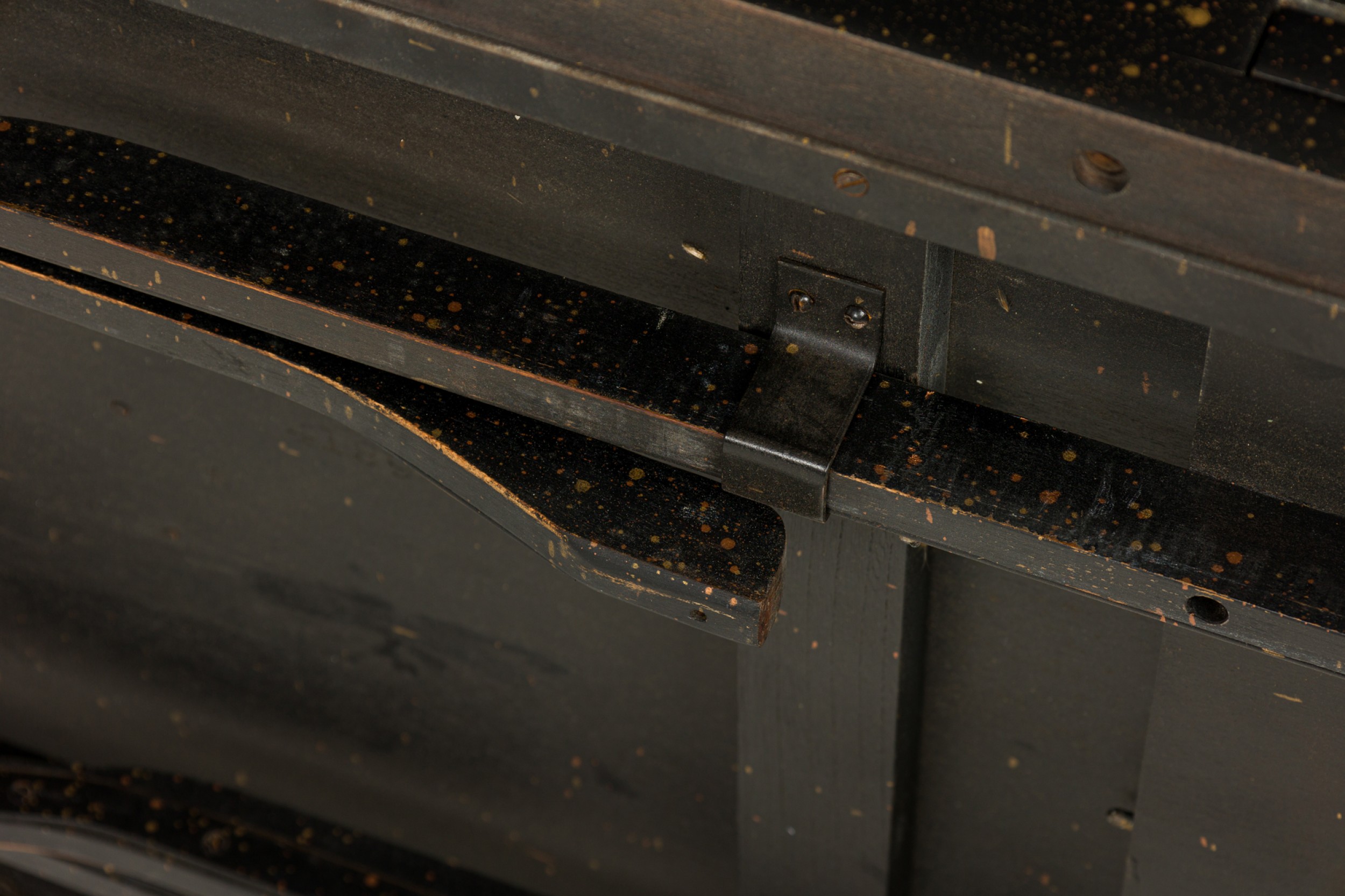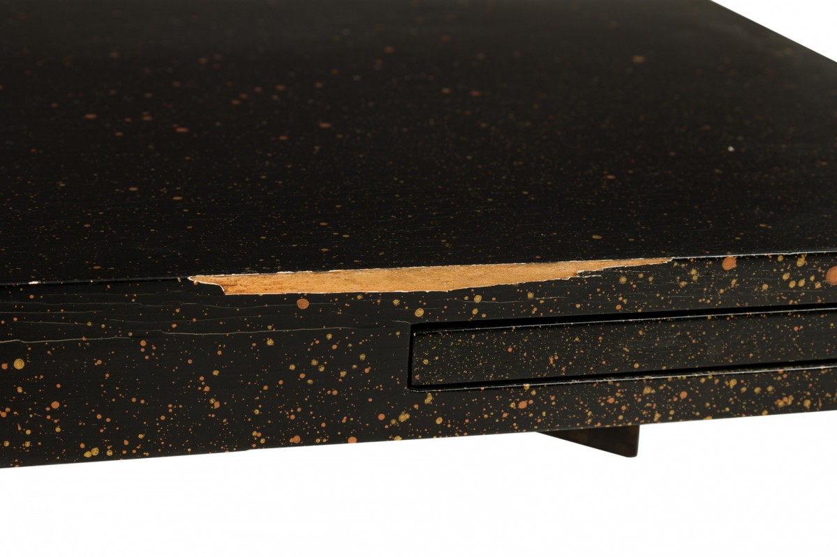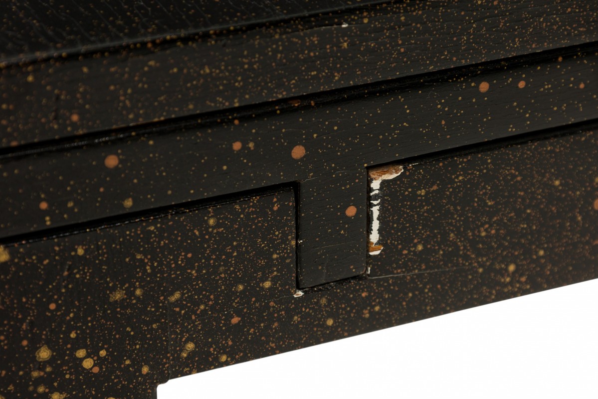American Mid-Century black painted white speckled wooden refectory coffee / cocktail table with a rectangular top and two concealed pull out leaves on either side. (Similar pieces: DUF0720, DUF0737)