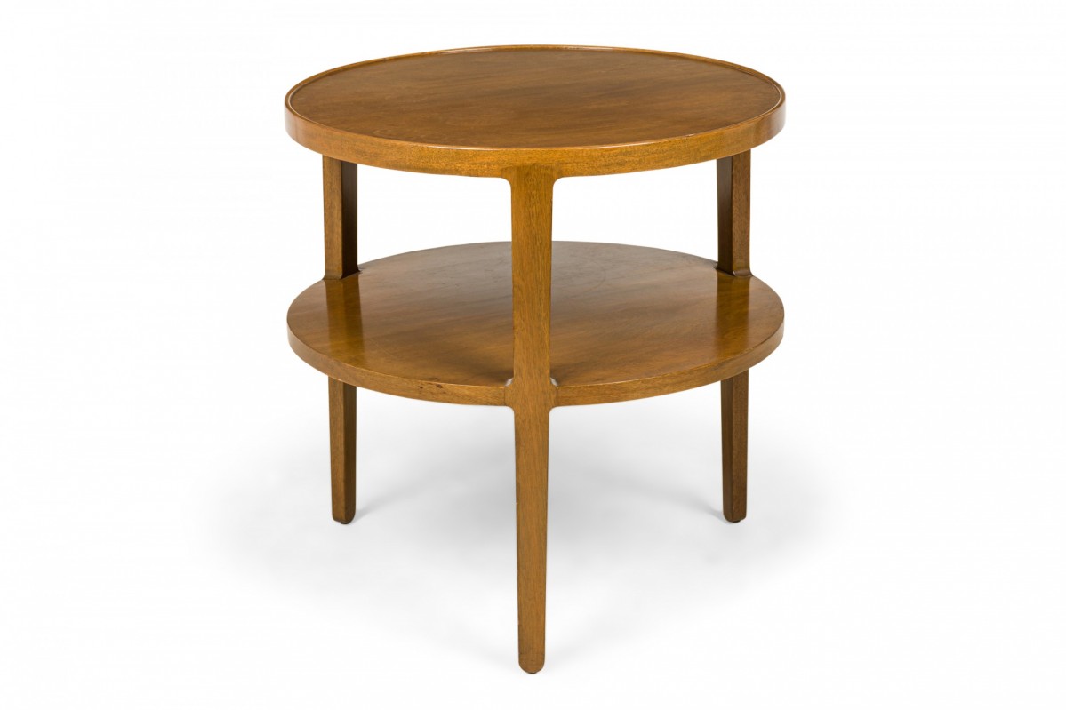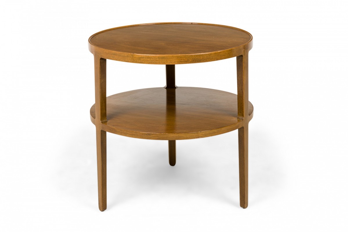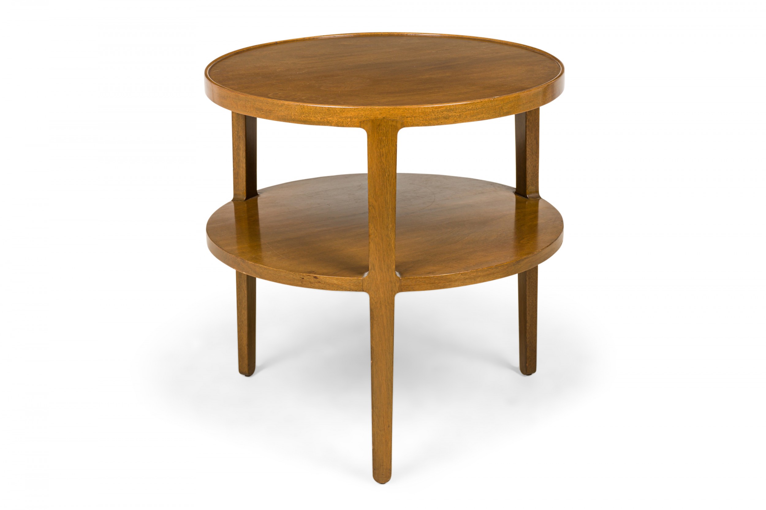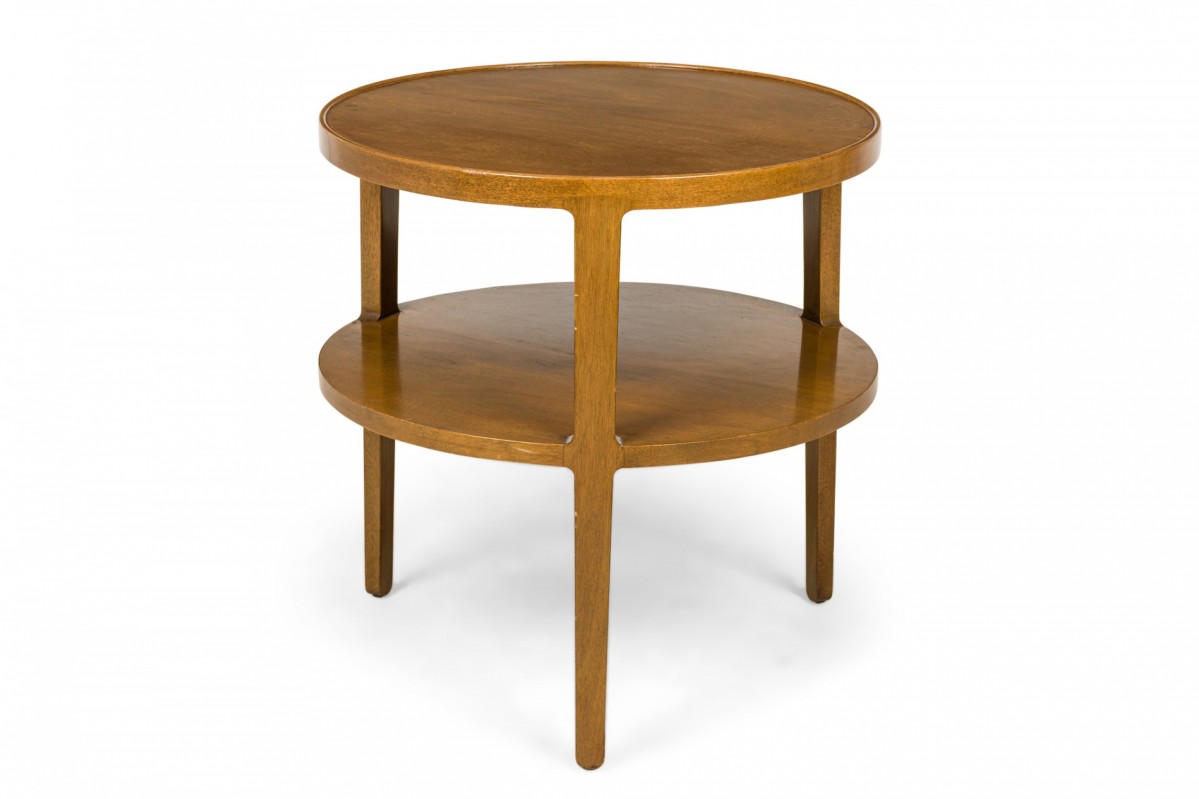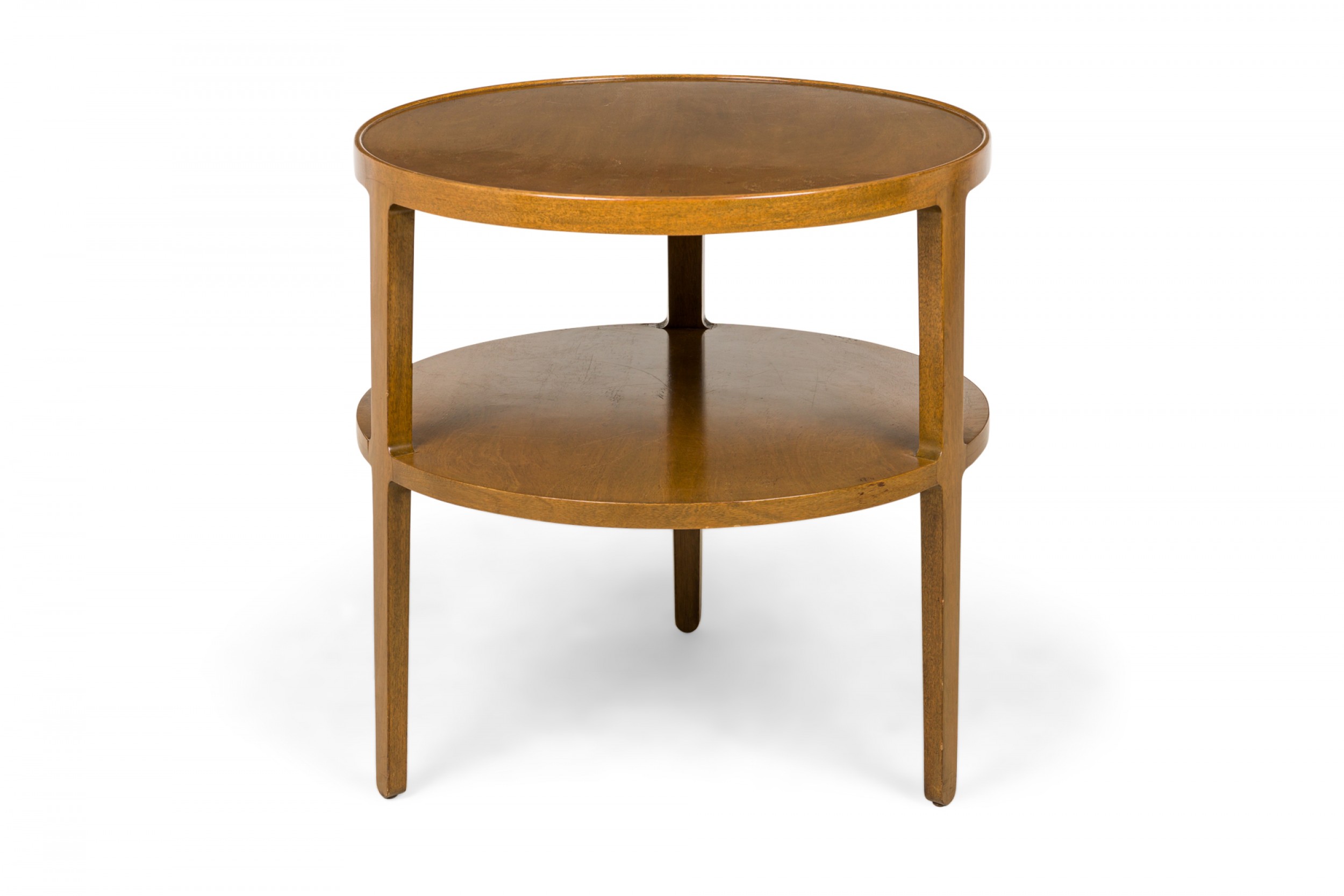 American Mid-Century circular wooden end / side table with a circular top with shallow lip above an identical stretcher shelf supported on the exterior by three tapered square legs.