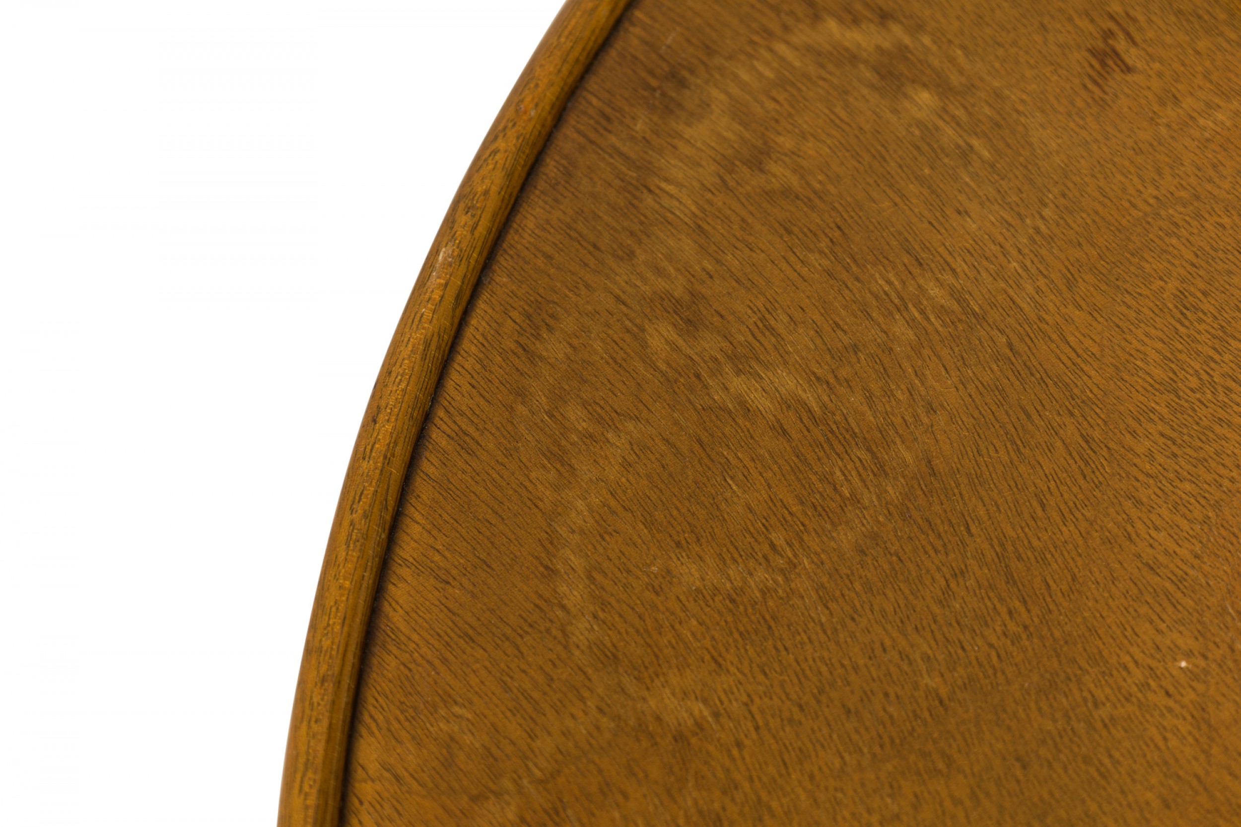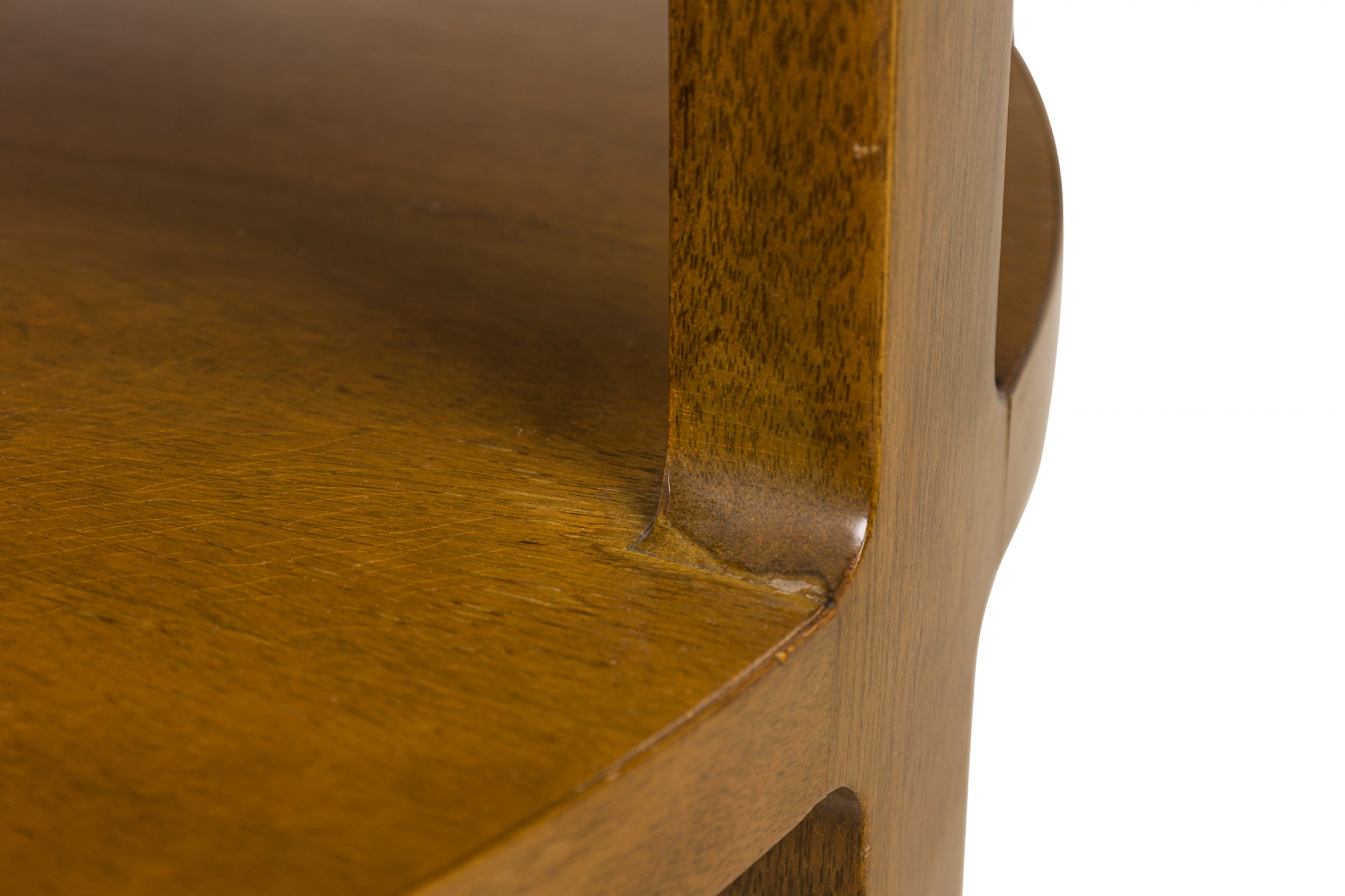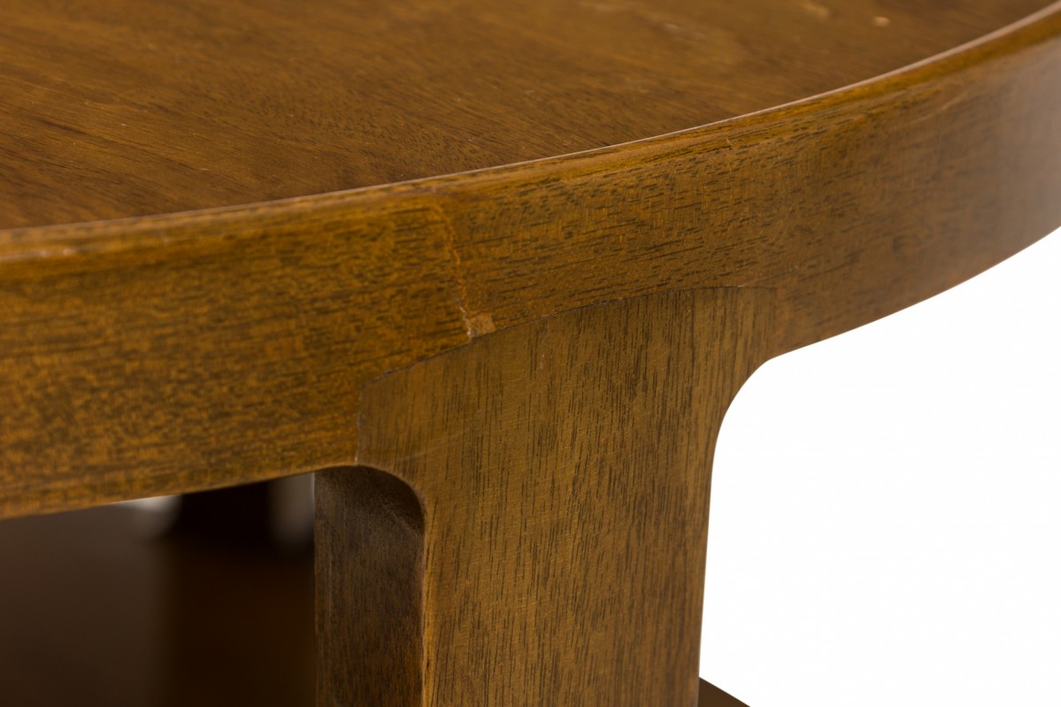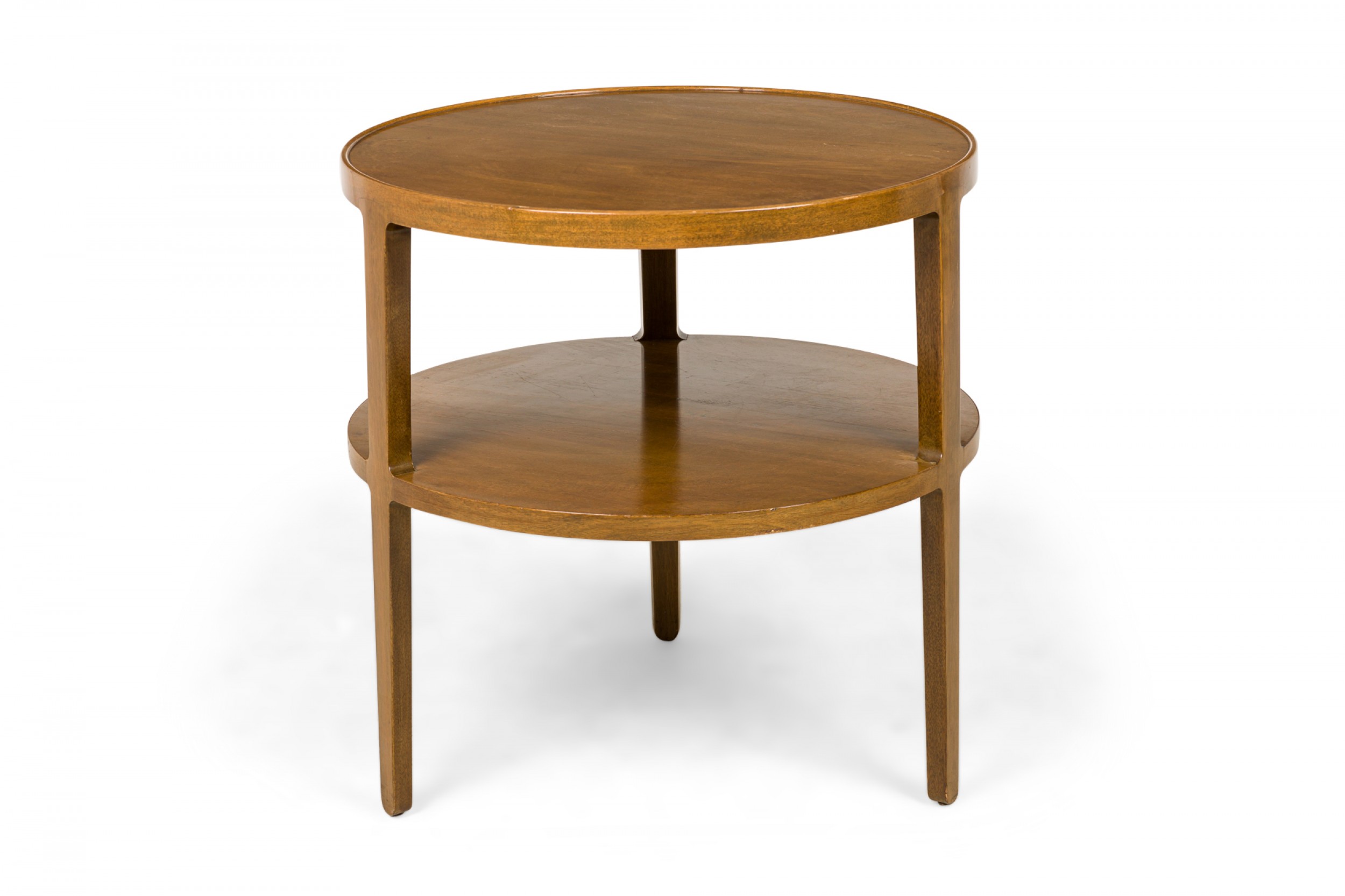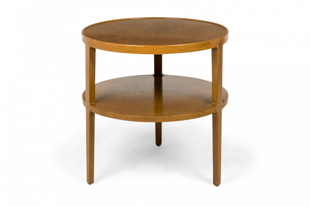 American Mid-Century circular wooden end / side table with a circular top with shallow lip above an identical stretcher shelf supported on the exterior by three tapered square legs.