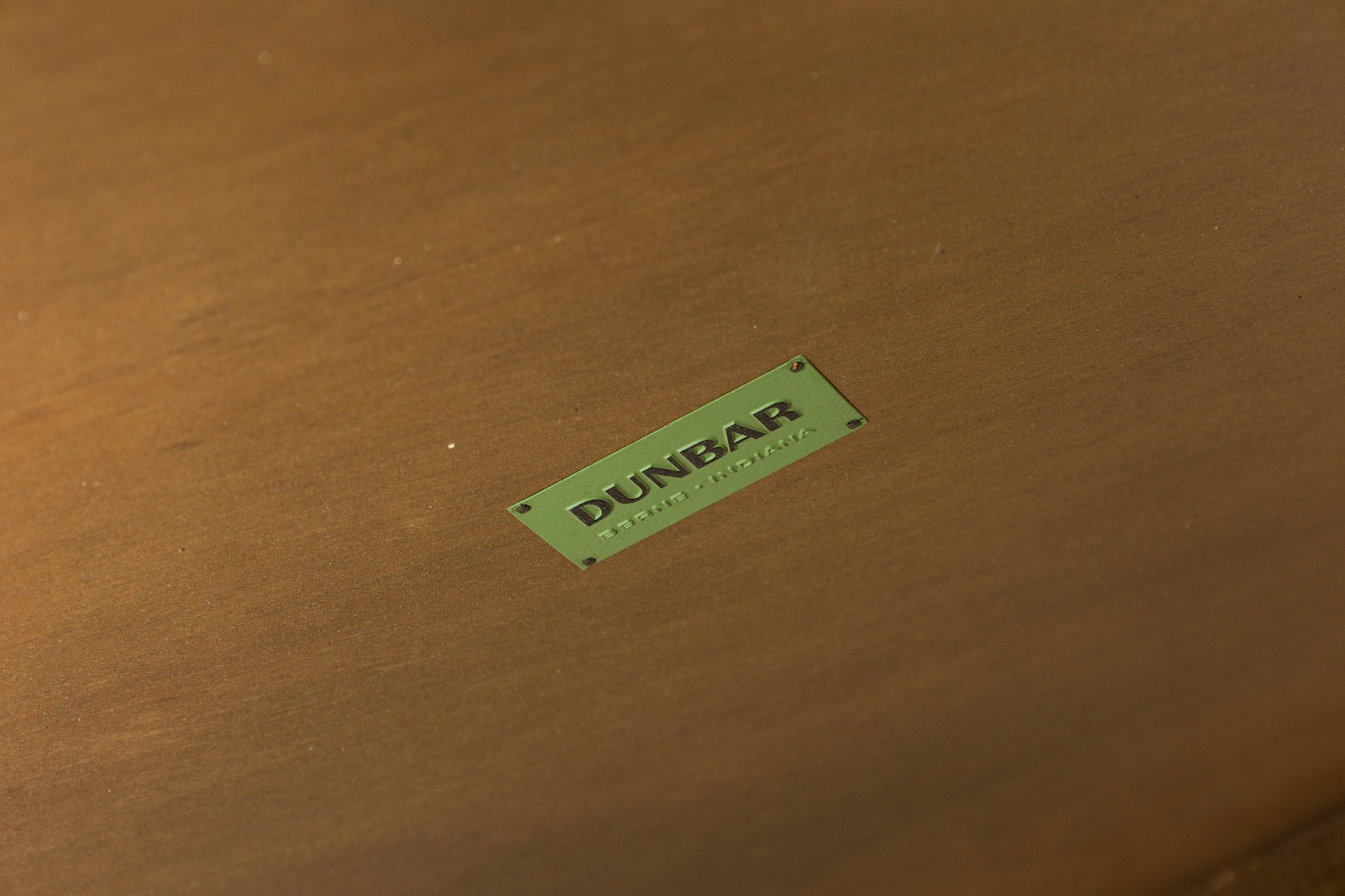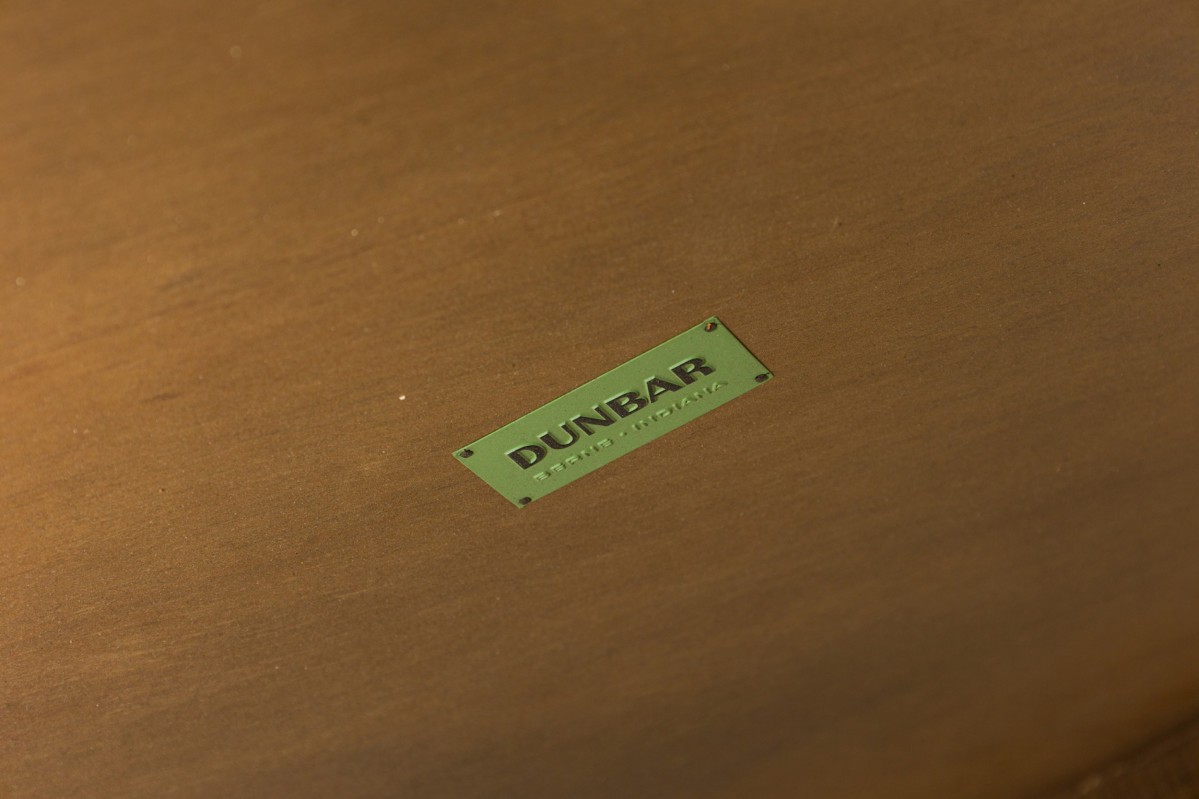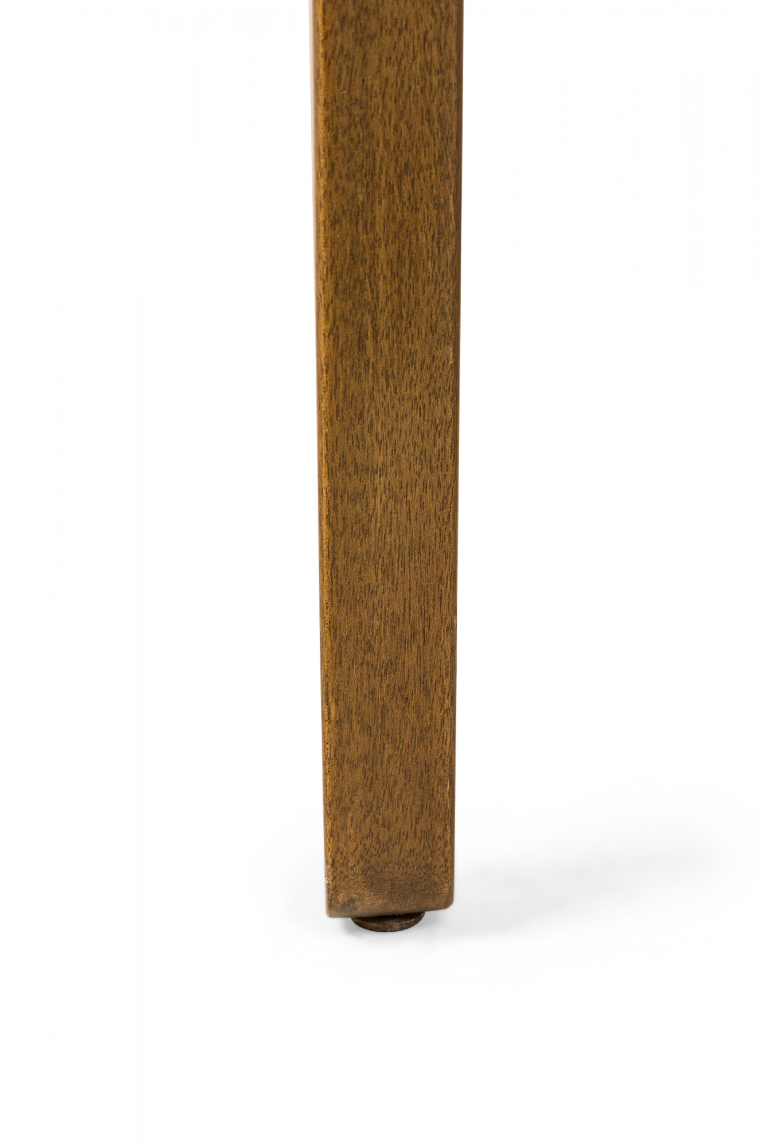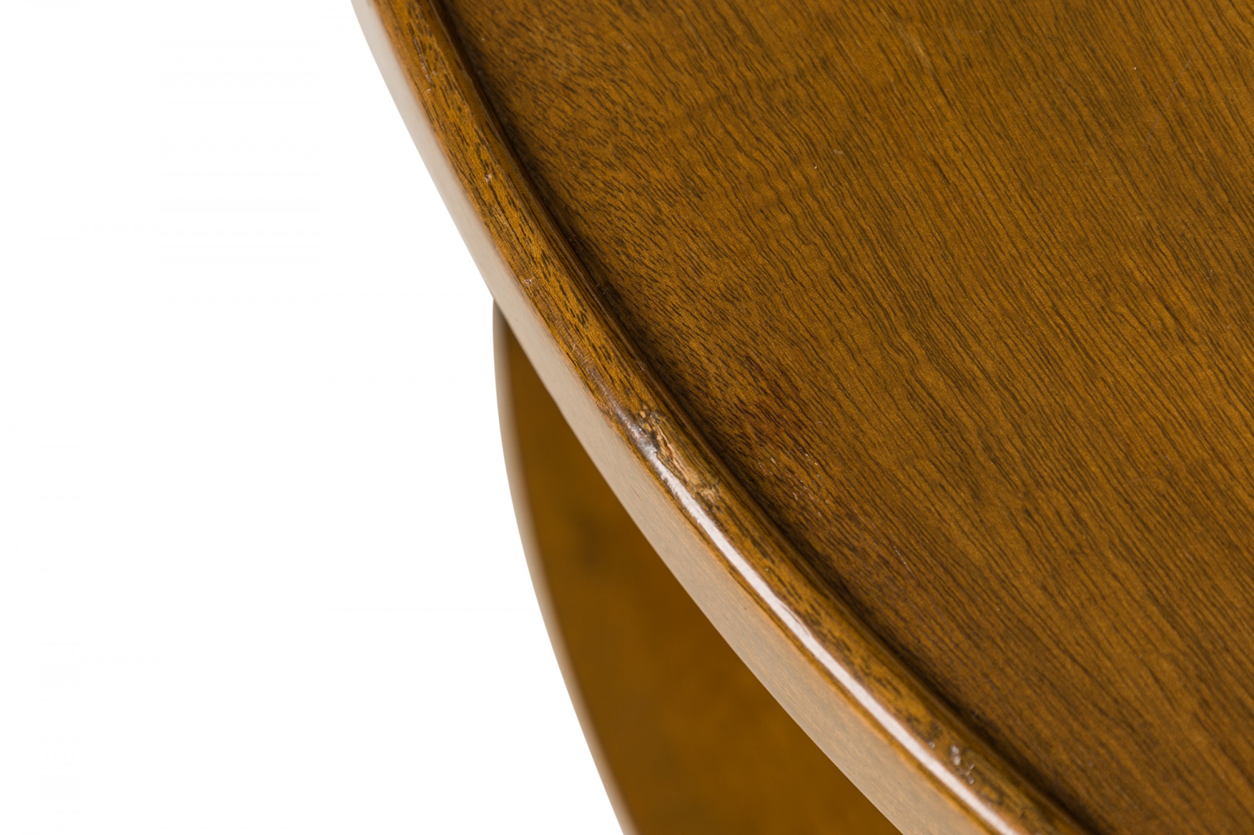 American Mid-Century circular wooden end / side table with a circular top with shallow lip above an identical stretcher shelf supported on the exterior by three tapered square legs.