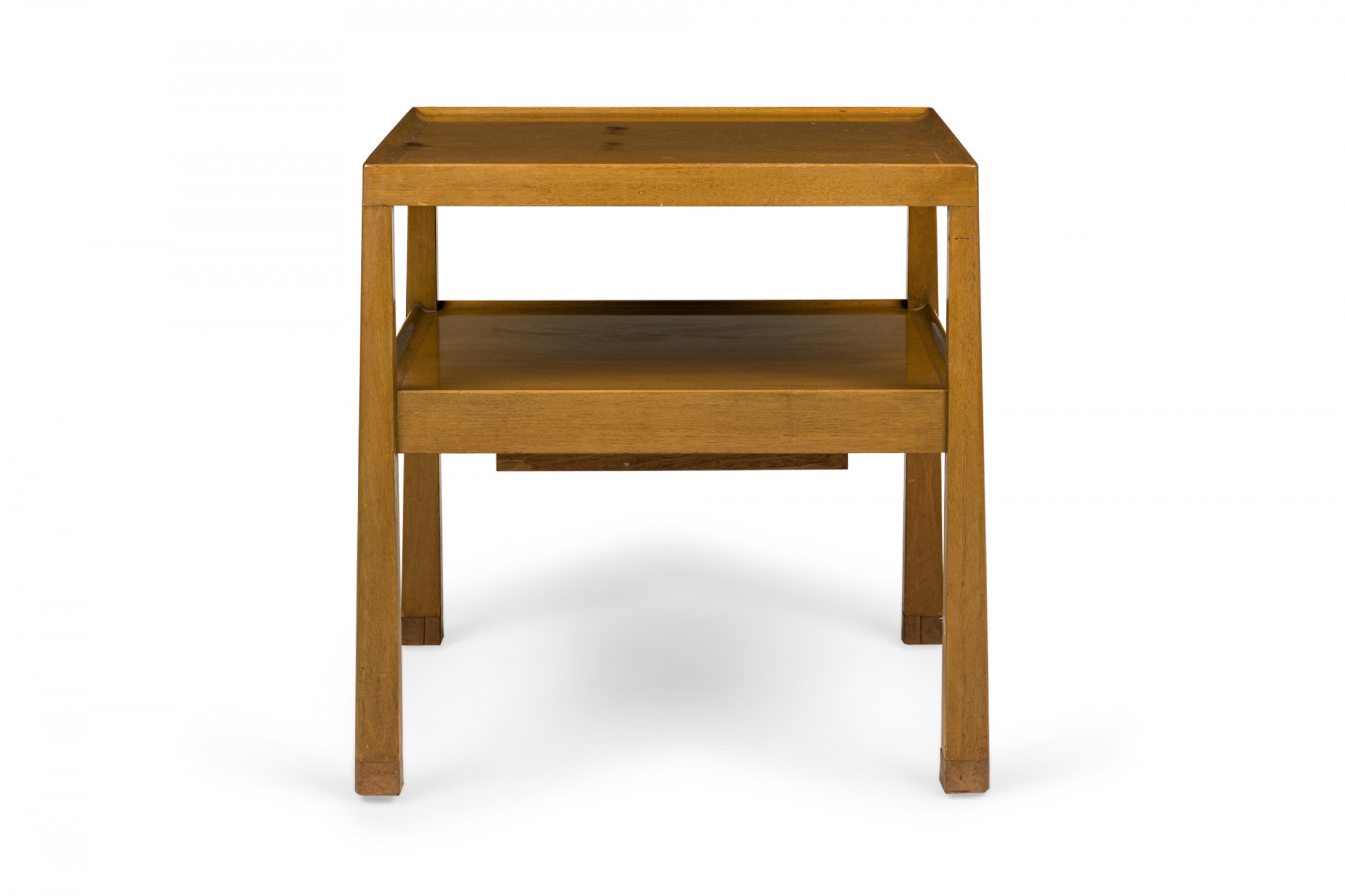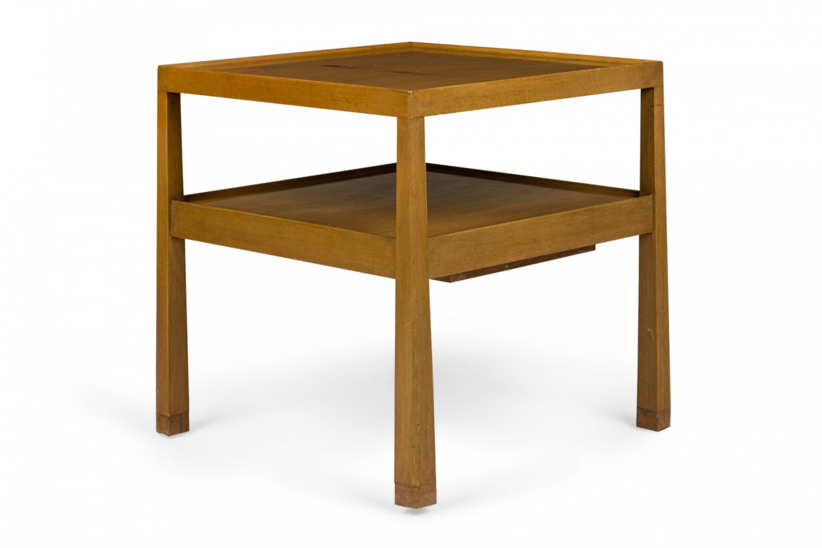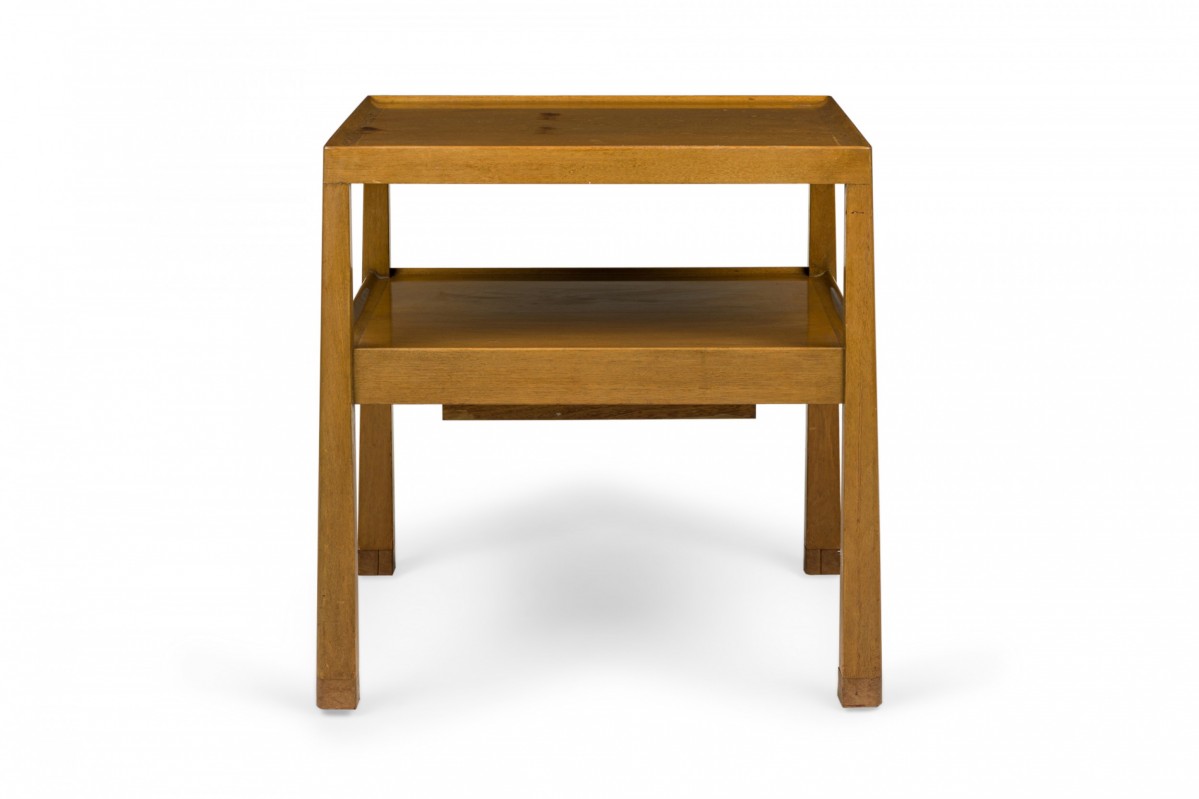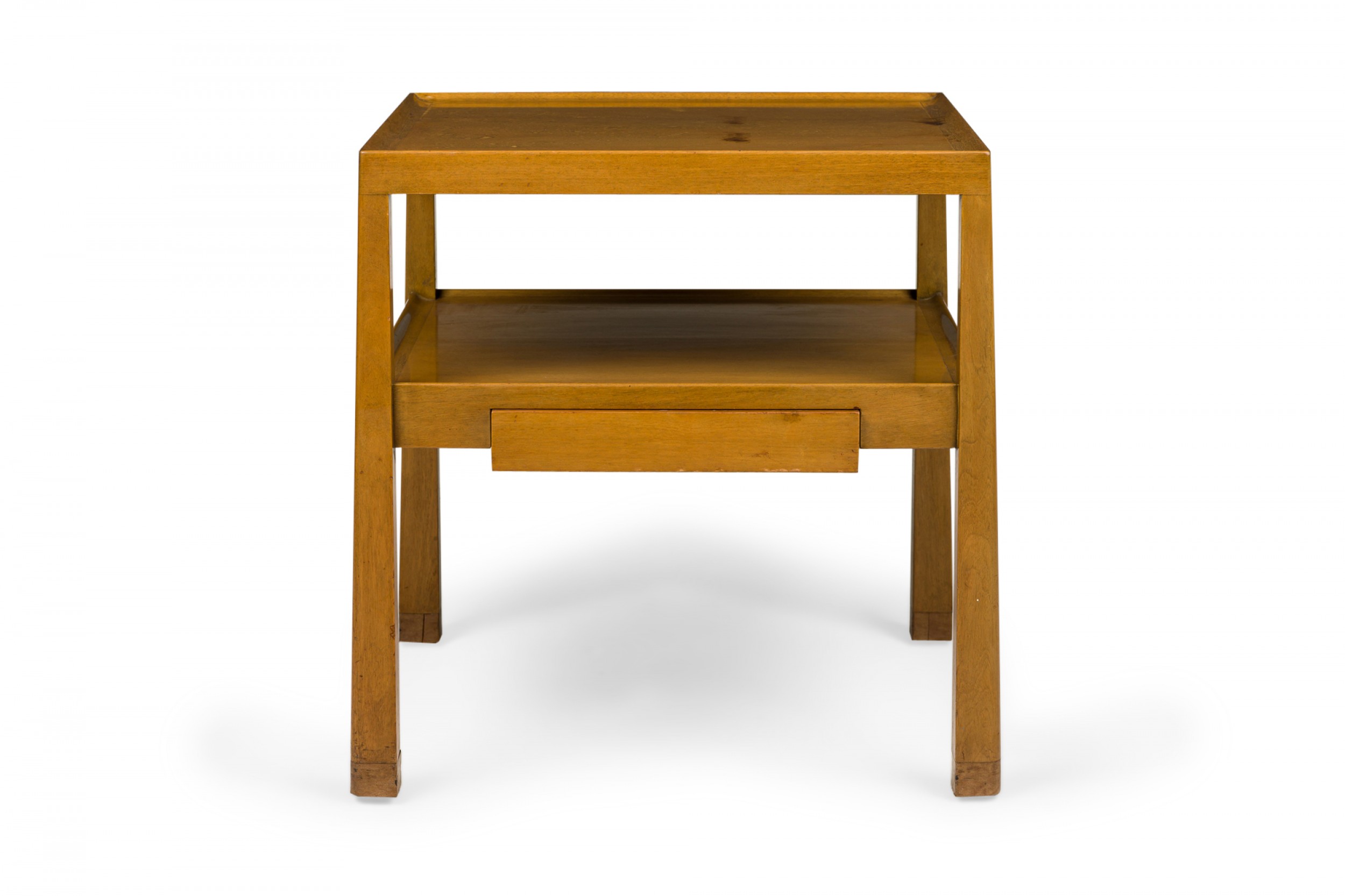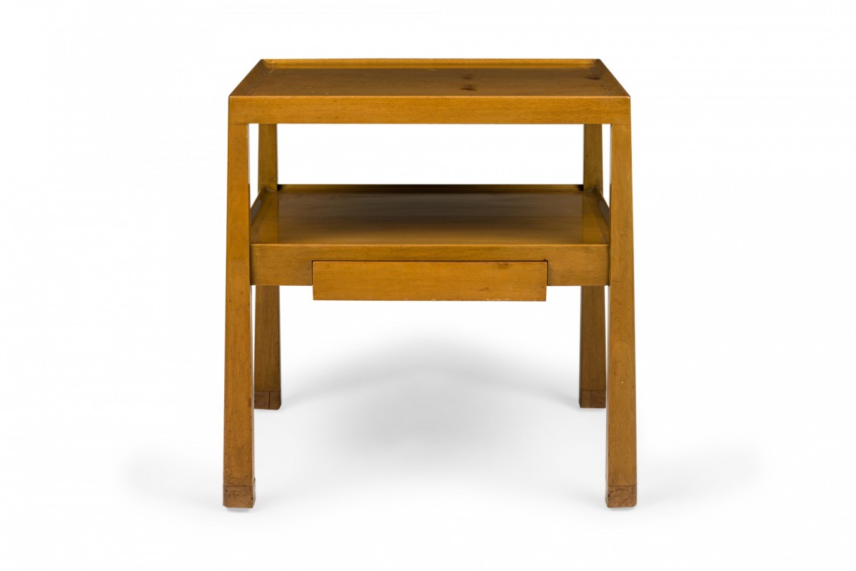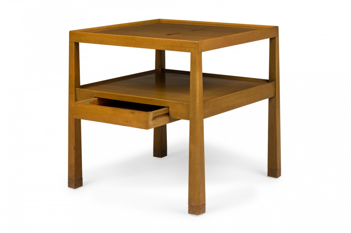 American Mid-Century two-tier end / side table with a square top with a shallow gallery above a lower shelf containing a single drawer supported by two reverse tapered legs. (Similar table: DUF0759)